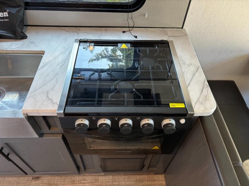 Pack up your camping gear and load it into this Aspen Trail travel trailer to enjoy a fun weekend getaway! You will enjoy a good night's rest each night on the front queen-size bed with wardrobes on either side to keep your clothes neat and tidy. After an adventurous day at the beach, you can come back and clean up in the full bathroom with a skylight above the shower for added natural lighting. Once you're clean and fresh, you can grab your favorite snack from the kitchen pantry or pop a bag of popcorn into the stainless steel microwave and then relax on either the booth dinette or sofa, both of which can transform into extra sleeping spaces!