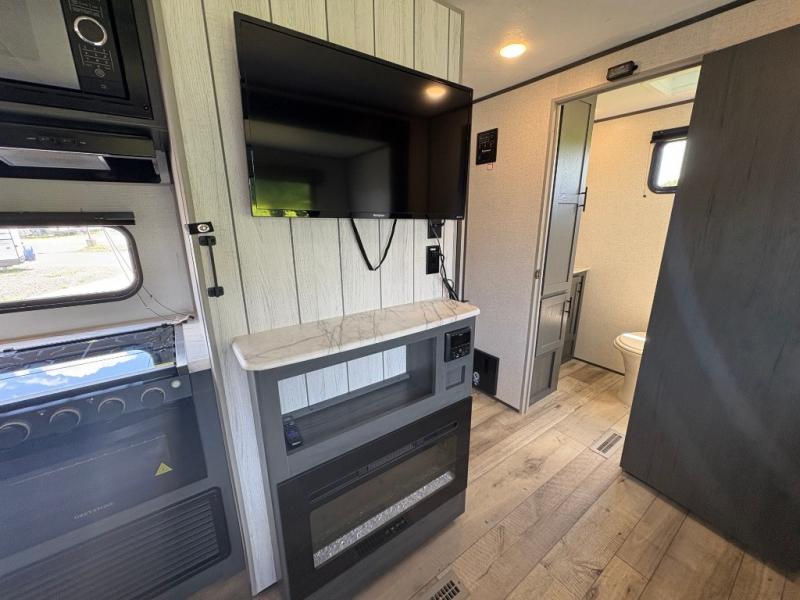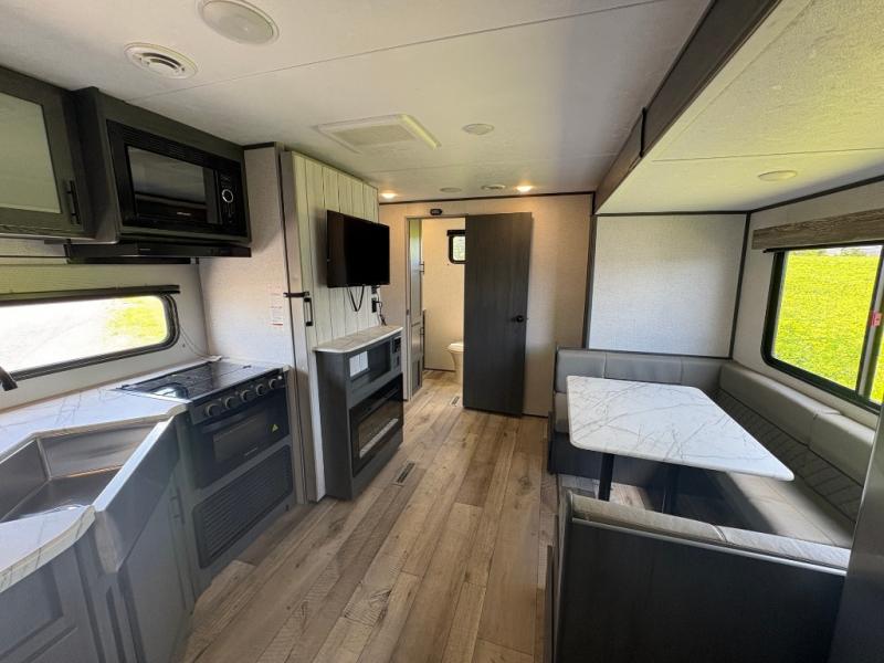 Head out on a weekend getaway with your spouse in this Aspen Trail travel trailer! You will enjoy a good night's rest each night on the queen-size bed in the front private bedroom. The U-shaped dinette is not only a great place to eat your meals at, but also to play games at while you enjoy the fireplace across from it. The full rear bathroom has everything you will need to start the day feeling fresh, including an exhaust fan to eliminate the steam from your nice, hot shower. No need to worry about where you will store all of your outdoor camping gear either because the pass-through storage area has you covered!
