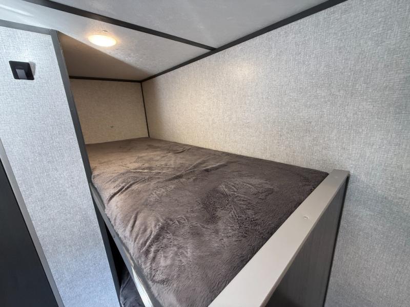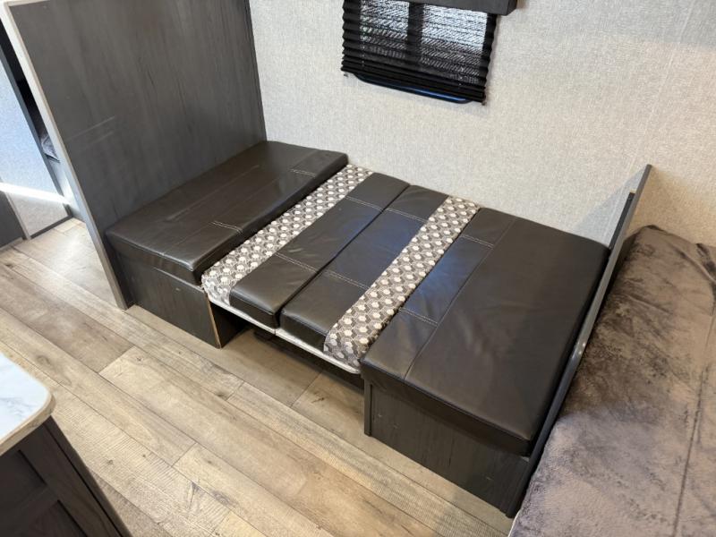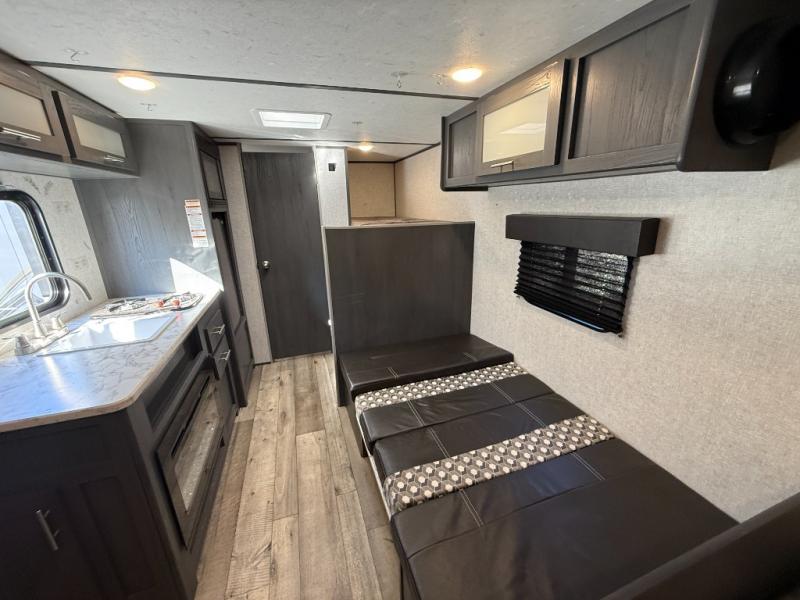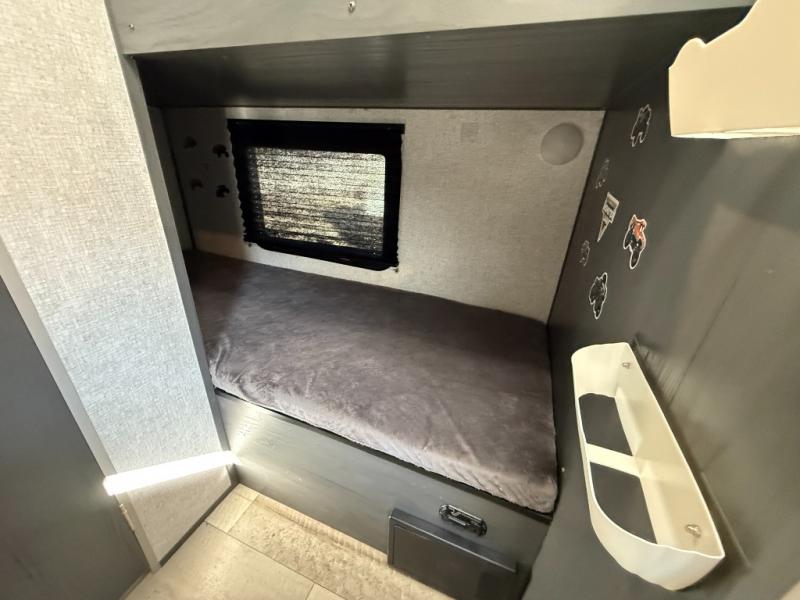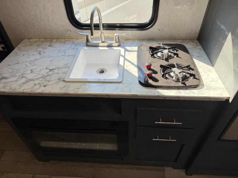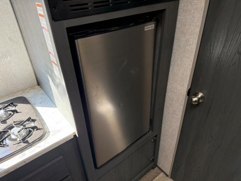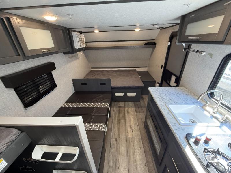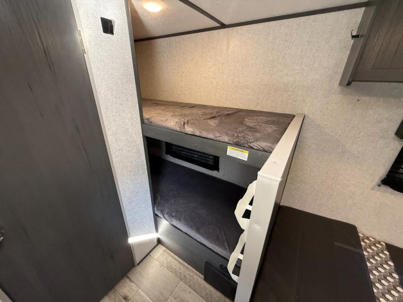 This compact trailer gives you all the conveniences you need while camping, plus comfort! The front queen bed, the bunk beds and the booth dinette offer sleeping space for five, the toilet and shower room offer privacy and a great place to change clothes, and the galley kitchen offers a two burner range top to make meals, a 3.3 cu. ft. refrigerator for cold items, and galley sink with high rise faucet. You can also enjoy the power awning with LED light when wanting some fresh air and protection from the sun.