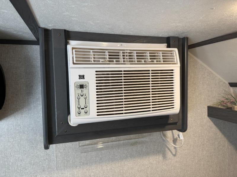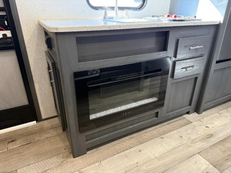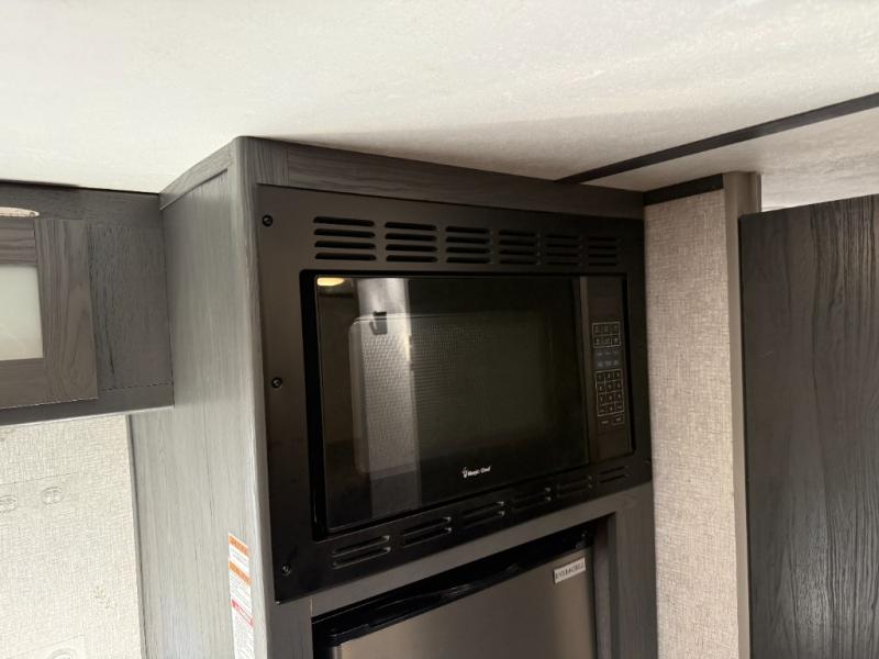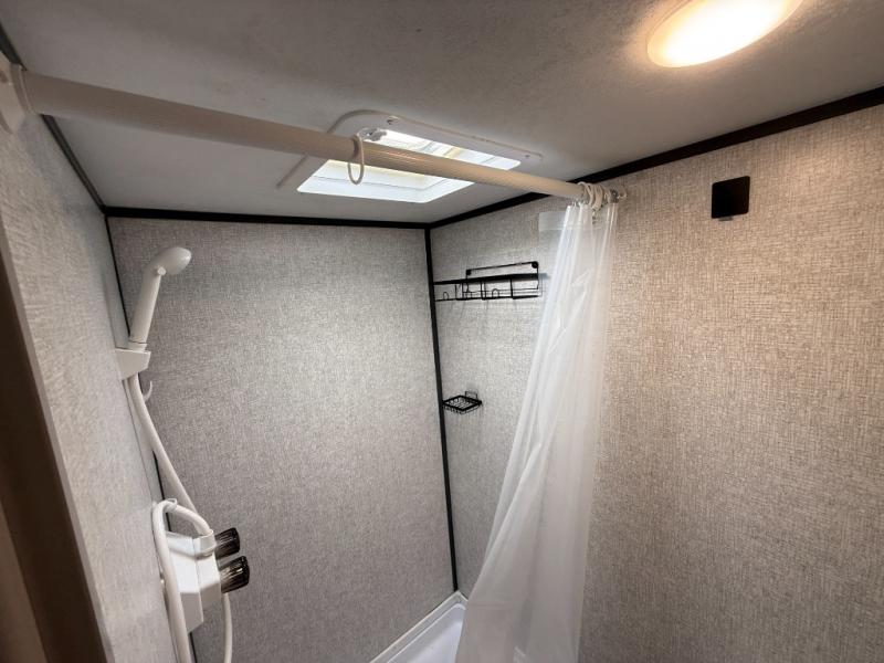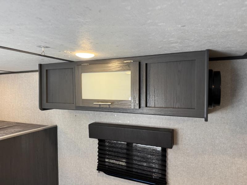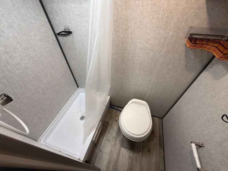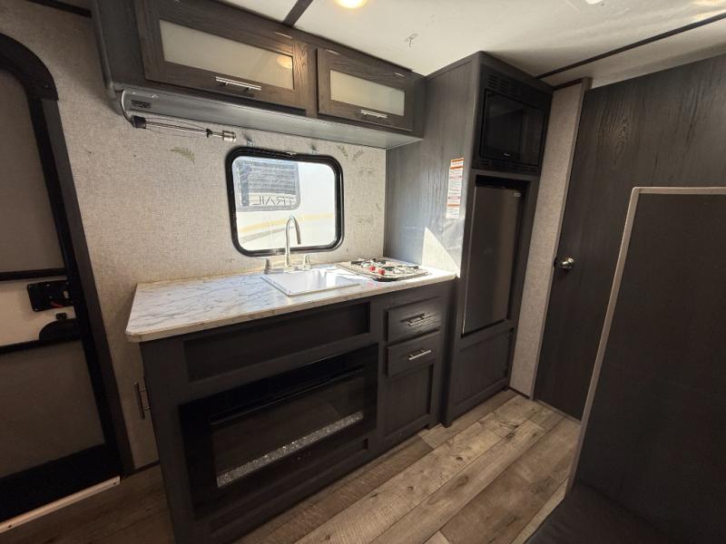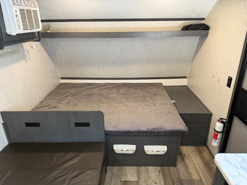 This compact trailer gives you all the conveniences you need while camping, plus comfort! The front queen bed, the bunk beds and the booth dinette offer sleeping space for five, the toilet and shower room offer privacy and a great place to change clothes, and the galley kitchen offers a two burner range top to make meals, a 3.3 cu. ft. refrigerator for cold items, and galley sink with high rise faucet. You can also enjoy the power awning with LED light when wanting some fresh air and protection from the sun.