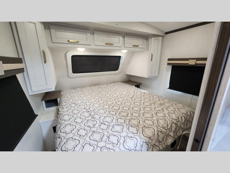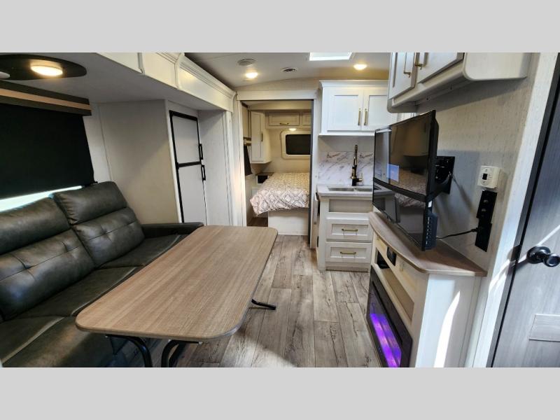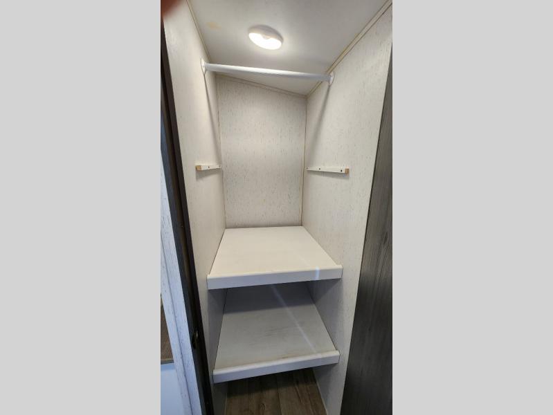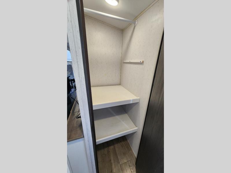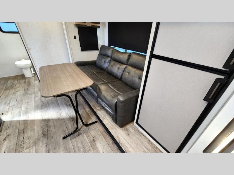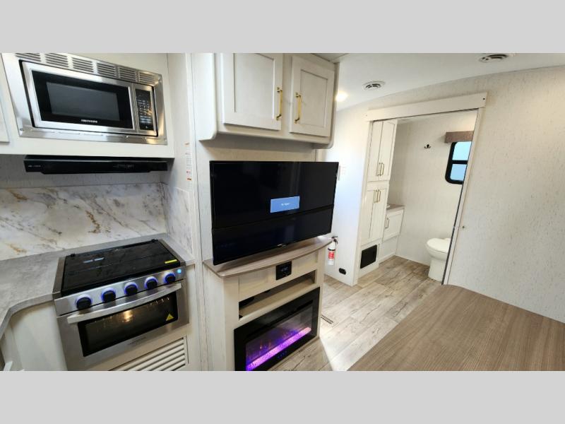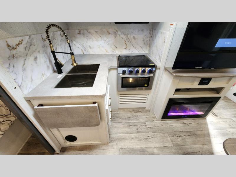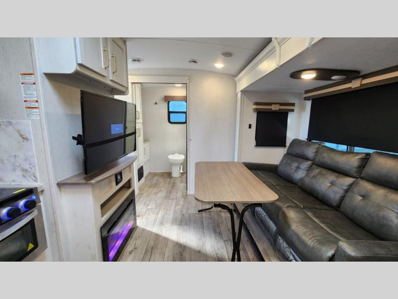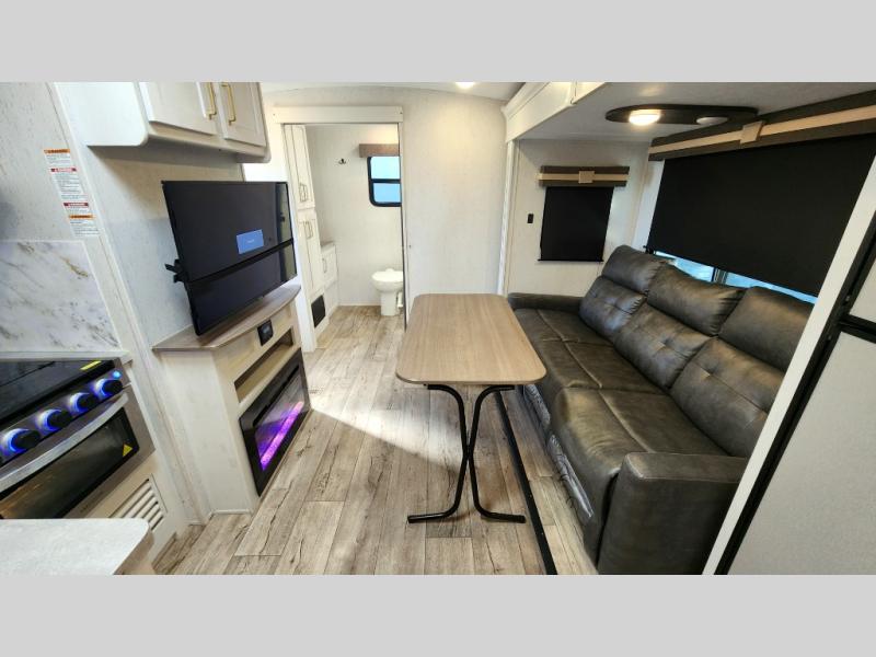 This travel trailer is perfect for two people looking to getaway for the weekend! It features a front private bedroom with a king bed to lay your head at night with wardrobes and nightstands on either side. You can prepare your best meals with the glass top three burner cooktop with a 17" oven and the 8 cu. ft. double door refrigerator then enjoy them at the 78" chaise lounge with a removeable table. The lounge is also conveniently across from an entertainment center with a 30" glass fireplace and a 40" LED TV. Inside the full rear bathroom is a shower to freshen up in each morning and a closet to keep your linens close.