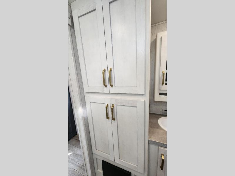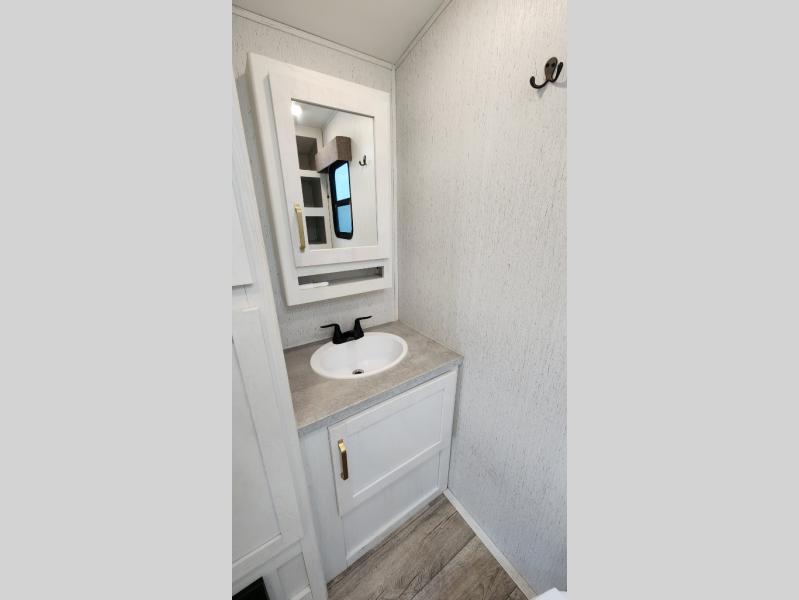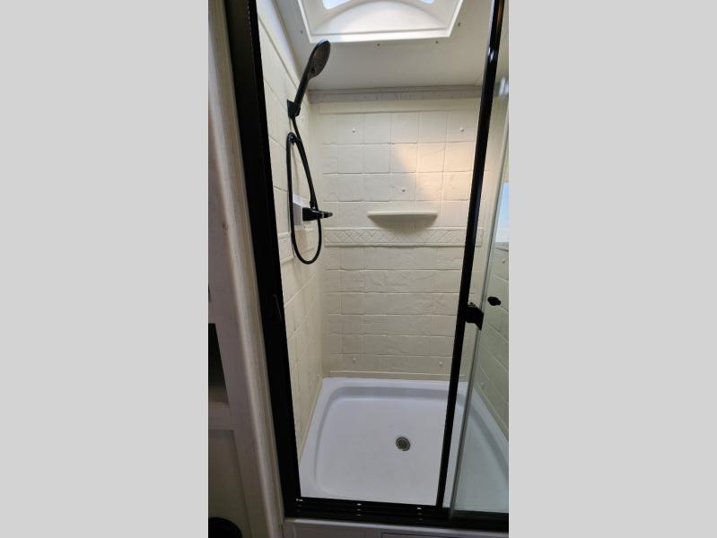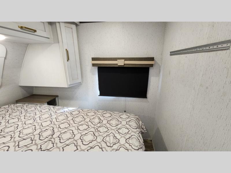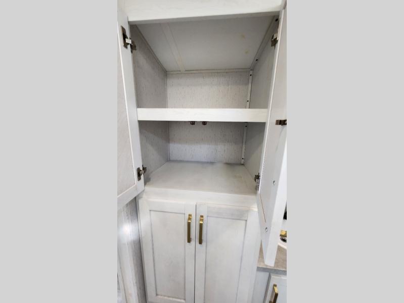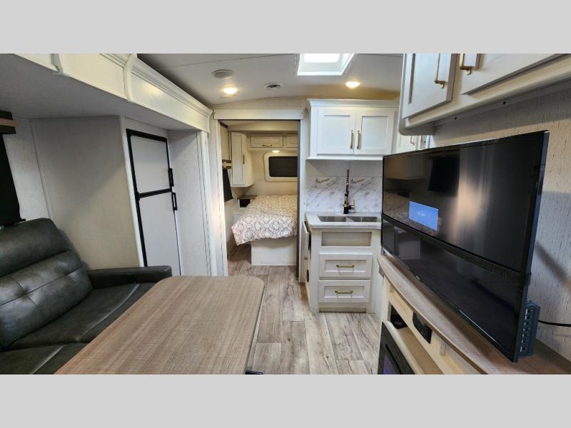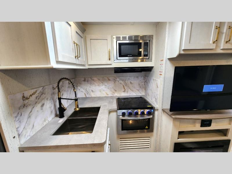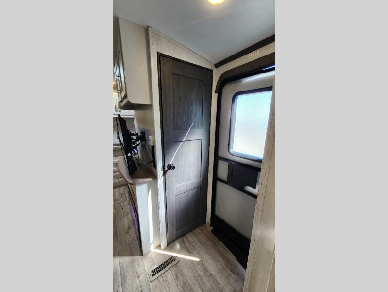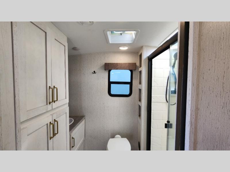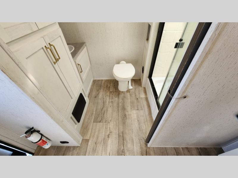 This travel trailer is perfect for two people looking to getaway for the weekend! It features a front private bedroom with a king bed to lay your head at night with wardrobes and nightstands on either side. You can prepare your best meals with the glass top three burner cooktop with a 17" oven and the 8 cu. ft. double door refrigerator then enjoy them at the 78" chaise lounge with a removeable table. The lounge is also conveniently across from an entertainment center with a 30" glass fireplace and a 40" LED TV. Inside the full rear bathroom is a shower to freshen up in each morning and a closet to keep your linens close.