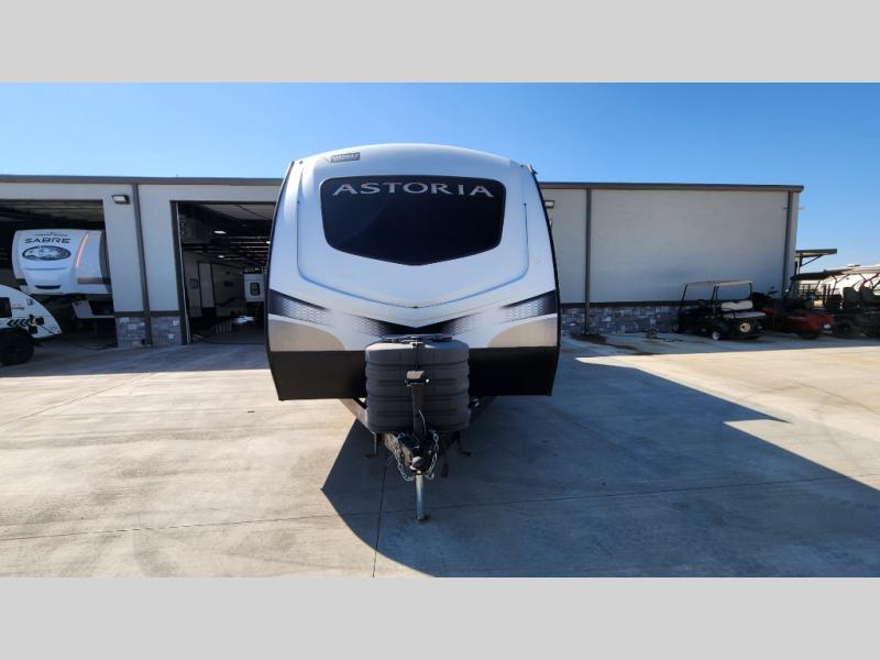 Each one of these Dutchmen RV Astoria fifth wheels and travel trailers offer highly visible, value-driven standard features and a sturdy construction with a fiberglass exterior! Dark-tinted safety glass windows offer privacy and a sleek design. You can store your outdoor gear in the pass-through storage areas and the slam latch baggage doors on the fifth wheels offer even more security while you travel. Their modern interior décor includes acrylic backsplash and stainless steel appliances which will be easy to clean. HyperDeck flooring will also be easy to clean, as well as hold up through each and every adventure. Don't waste anymore time, come find your perfect model today!