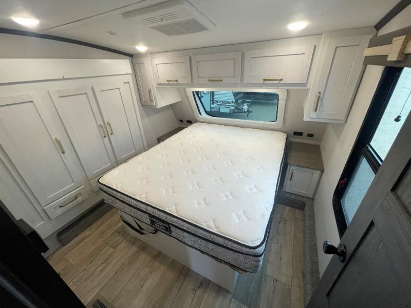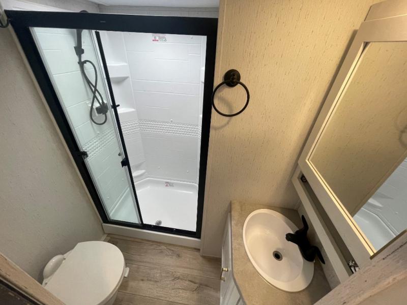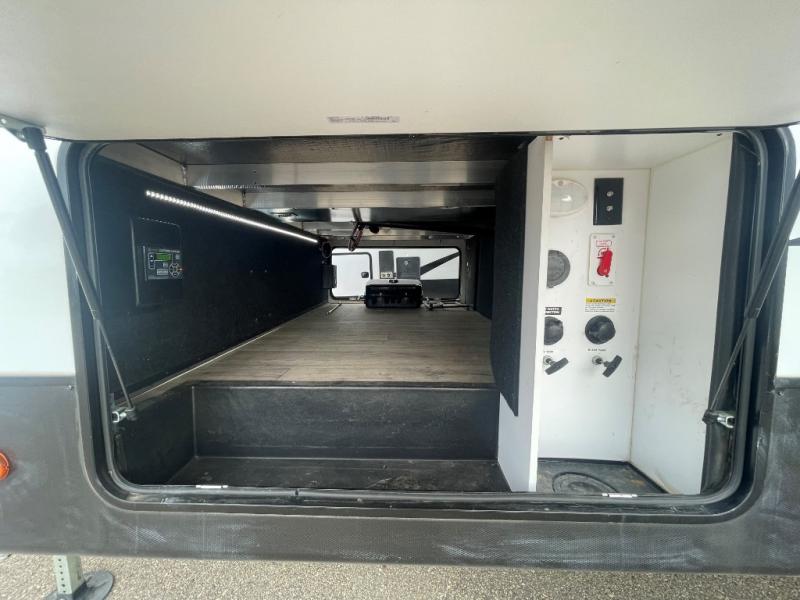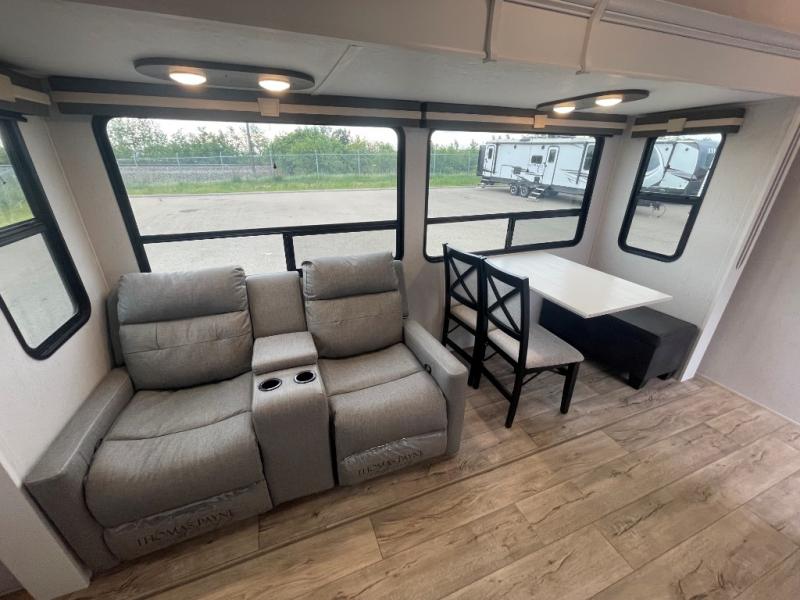 This fifth wheel is the perfect couple's fifth wheel! Inside the front private bedroom there is a queen bed for you to enjoy a good night's rest and a wardrobe slide to keep your clothes looking their best. You can freshen up each morning in the full bathroom with the shower and then head to the kitchen to fry up some eggs on the glass top three burner range with a 21" oven for cinnamon rolls to cook at the same time. You could even prepare breakfast outside with the outdoor kitchen. After a fun day at the beach, you can relax on the theater seating across from the entertainment center with a fireplace and 50" LED TV to watch your favorite movies!