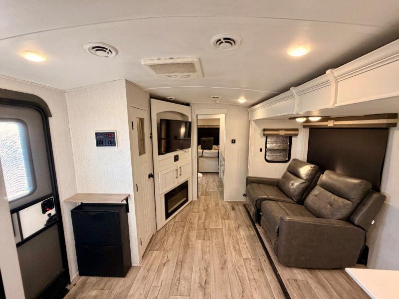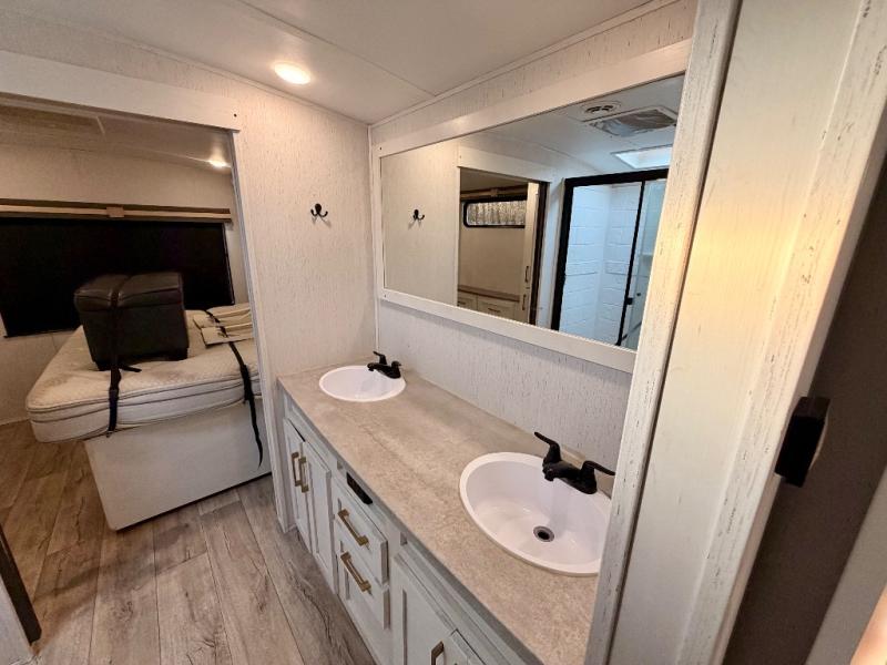 You will have everything you need for a premium camping experience in this thoughtfully designed travel trailer! The rear private bedroom serves as a true sanctuary, featuring a king bed slide-out that dramatically increases walking space and provides a private entrance into the walk-through bathroom. The bathroom itself is a standout in its class, boasting a dual-sink vanity that allows two people to get ready simultaneously—a rare luxury on the road.