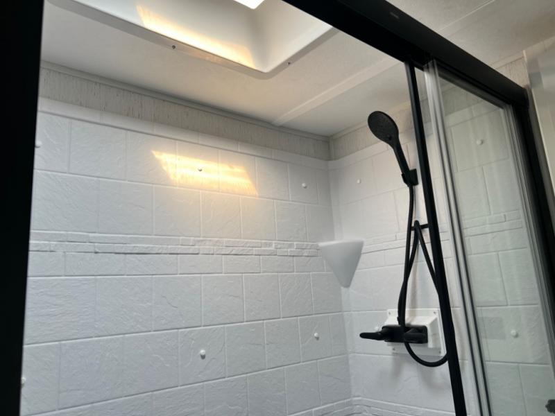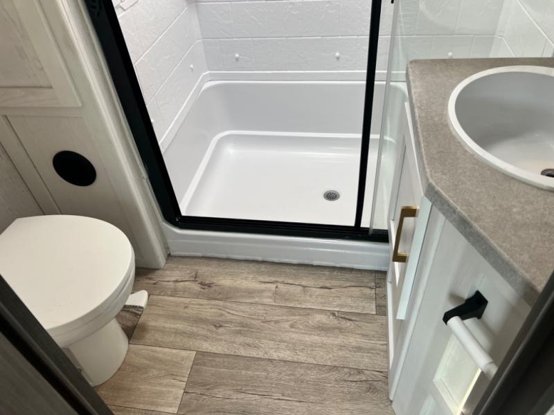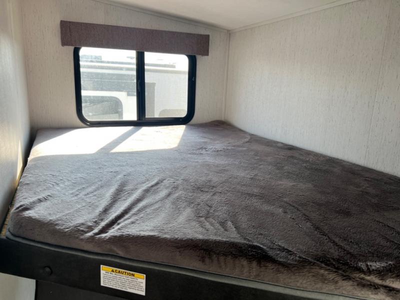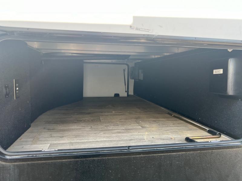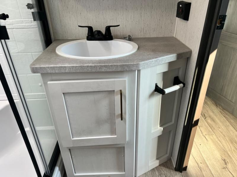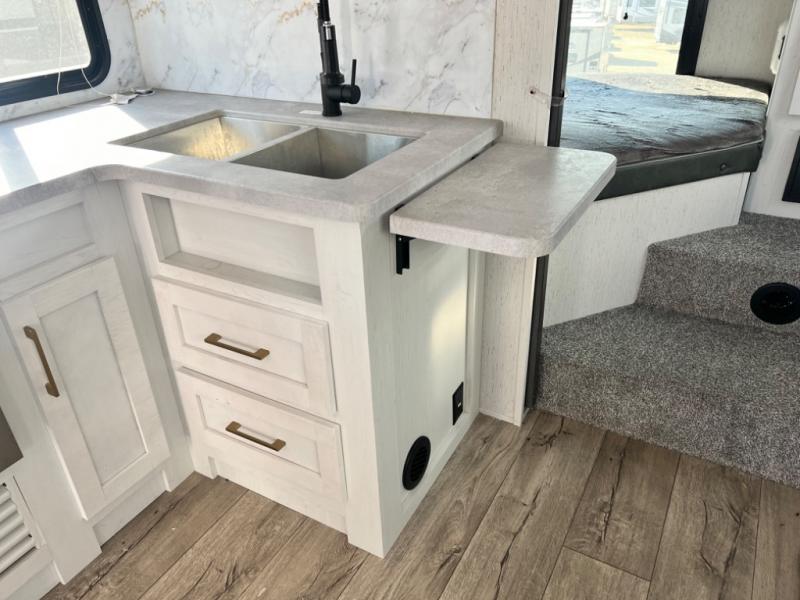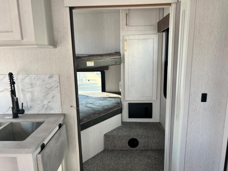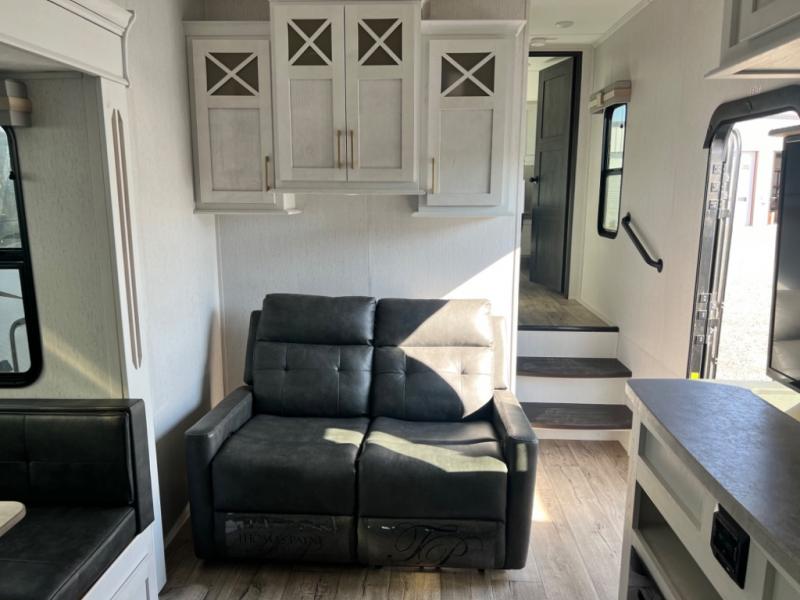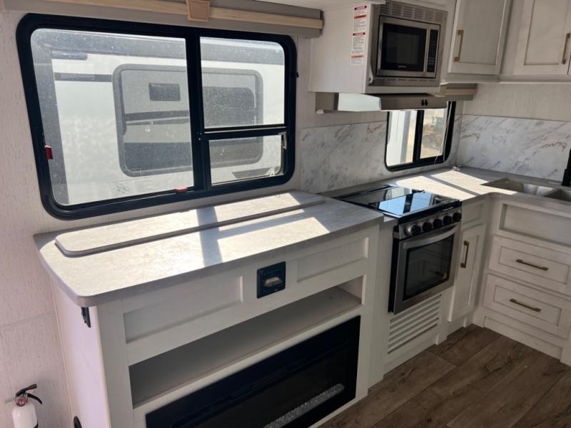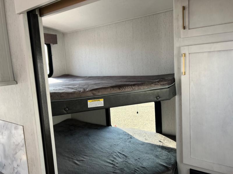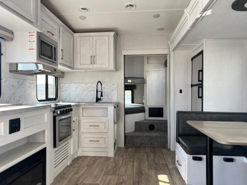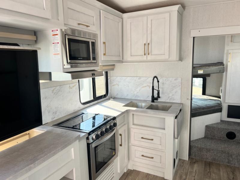 The whole gang can go camping in this fifth wheel with a rear private bunkhouse and front bedroom! There are double-size bunks for four to sleep on, and a wardrobe to store clothes out of the way, and a queen bed and more storage in the front bedroom. The main area offers theater seating and a free-standing dinette with four chairs to give you a place to dine, work and play cards, plus the chef can prepare and make meals either indoors with the glass top three burner cooktop and countertop extension or at the outside kitchen. And everyone can enjoy protection from the elements under the 21' power awning with LED lights and crank up the tunes for the outside speakers when wanting some fresh air.