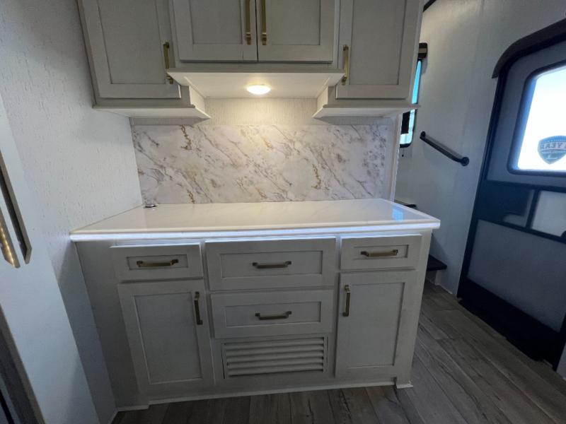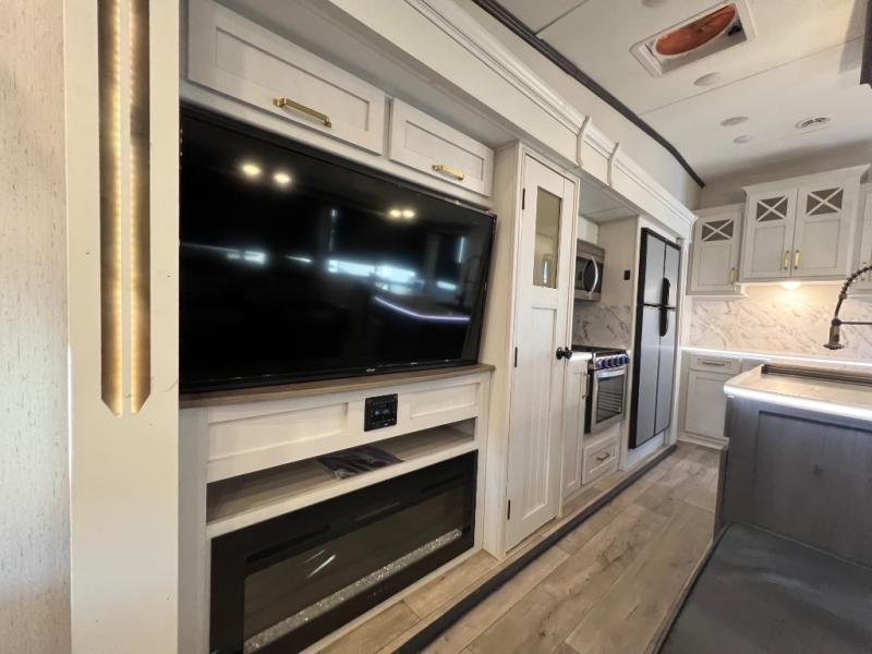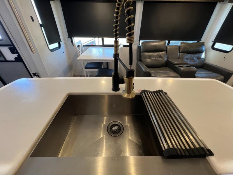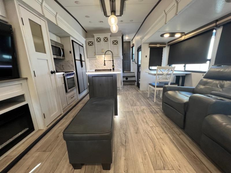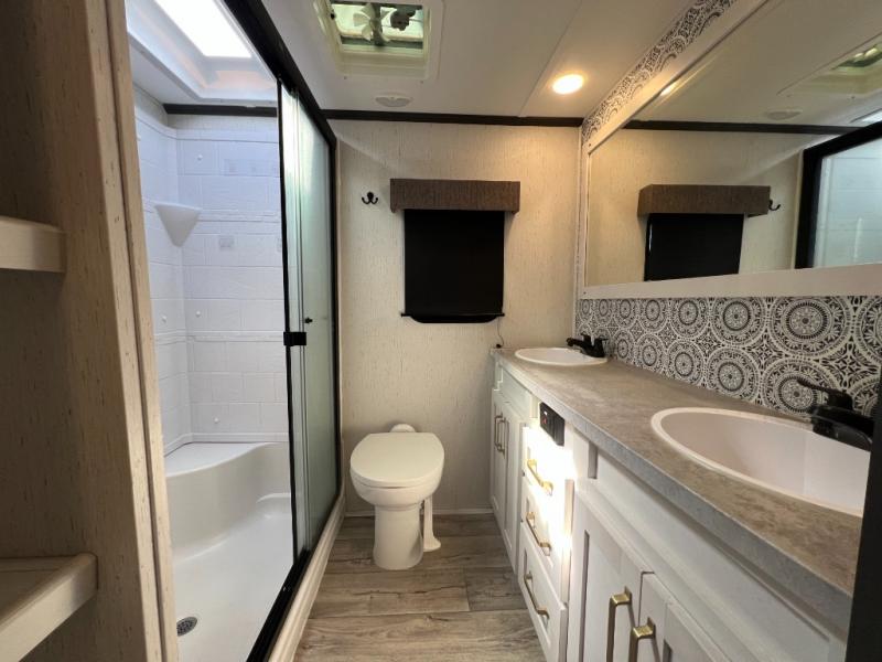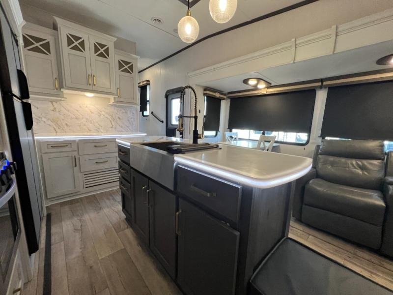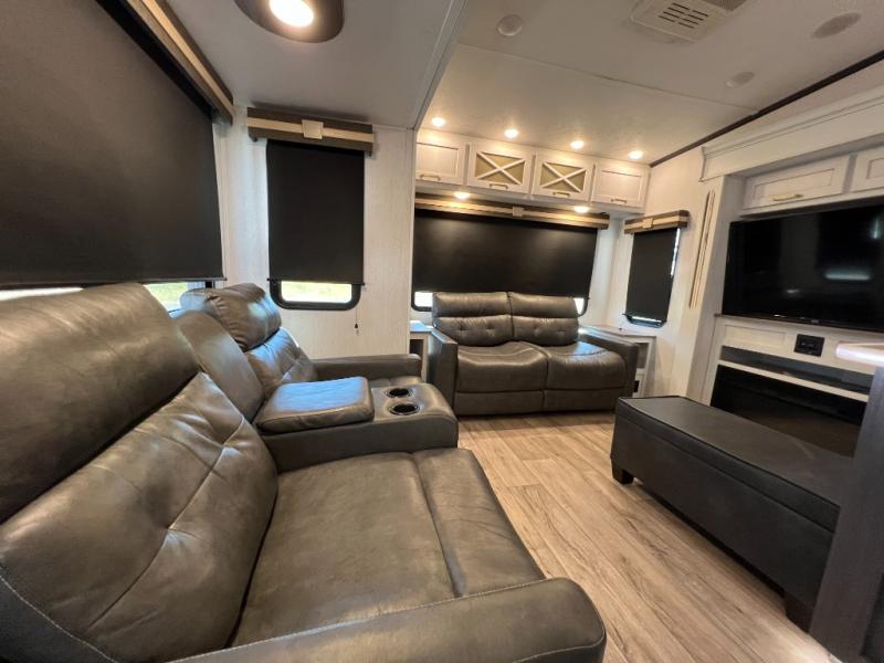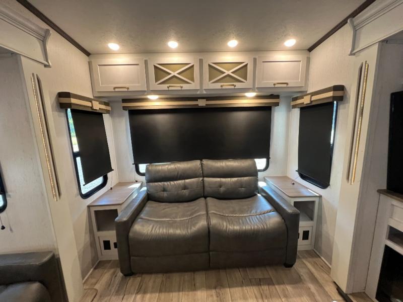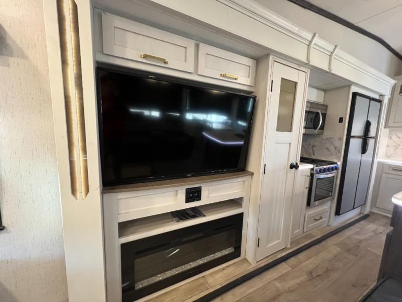 Two can get ready at once with a dual sink vanity in the full bathroom of this fifth wheel! Enjoy a good night's rest and walking around space with the king bed slide in the front private bedroom which also has a front wardrobe to keep your clothes looking their best, and a closet prepped for a washer/dryer option. The chef will have an easy time preparing meals in the kitchen with the island, the extra countertop space below the hutch, and the glass top three burner cooktop with 21" oven. The rear living area has a tri-fold sofa and theater seating across from an entertainment center with a fireplace and a 50" LED TV!