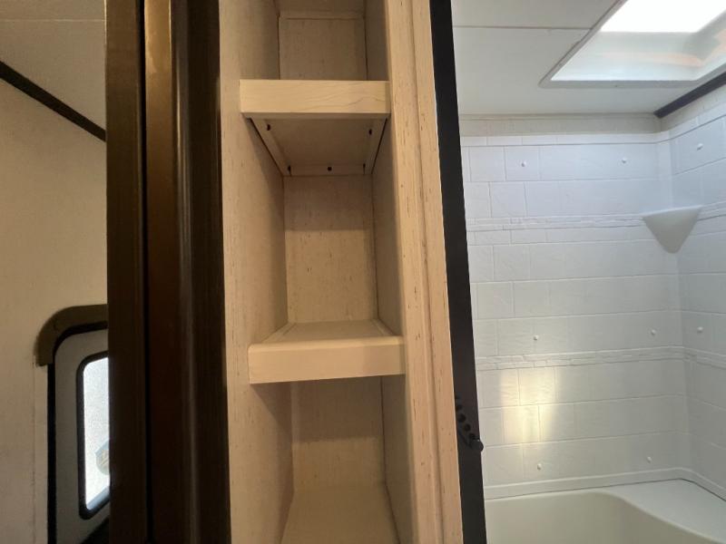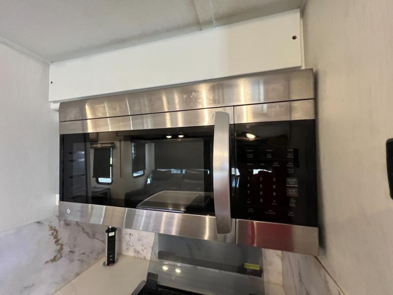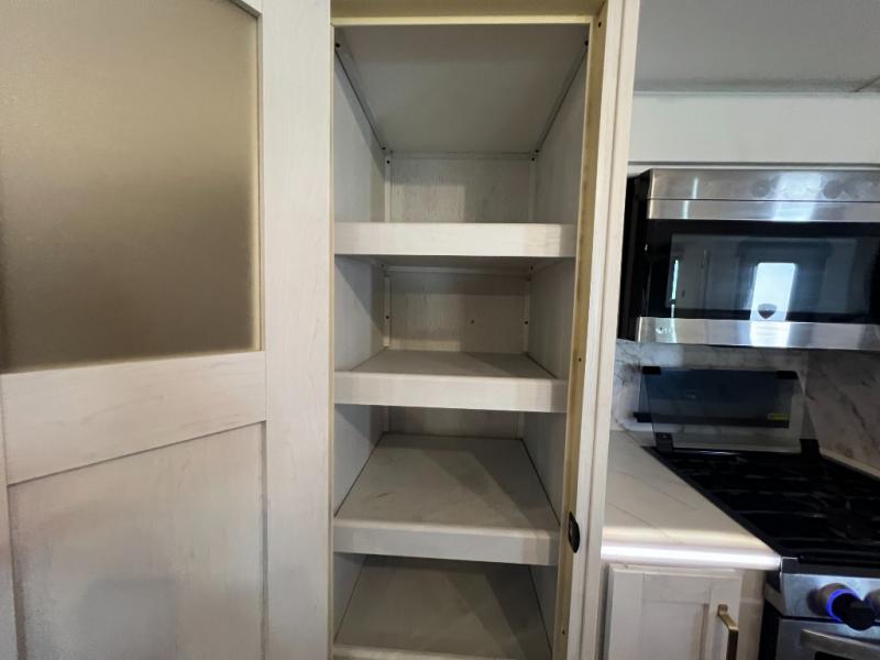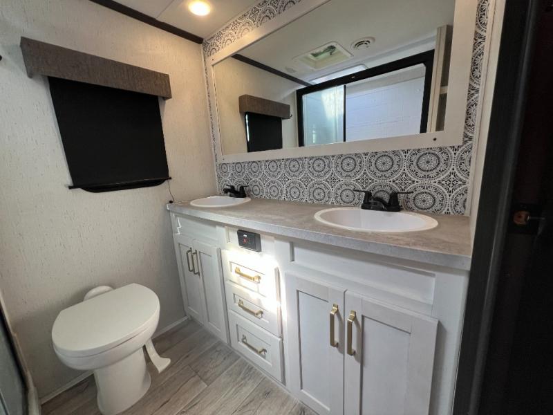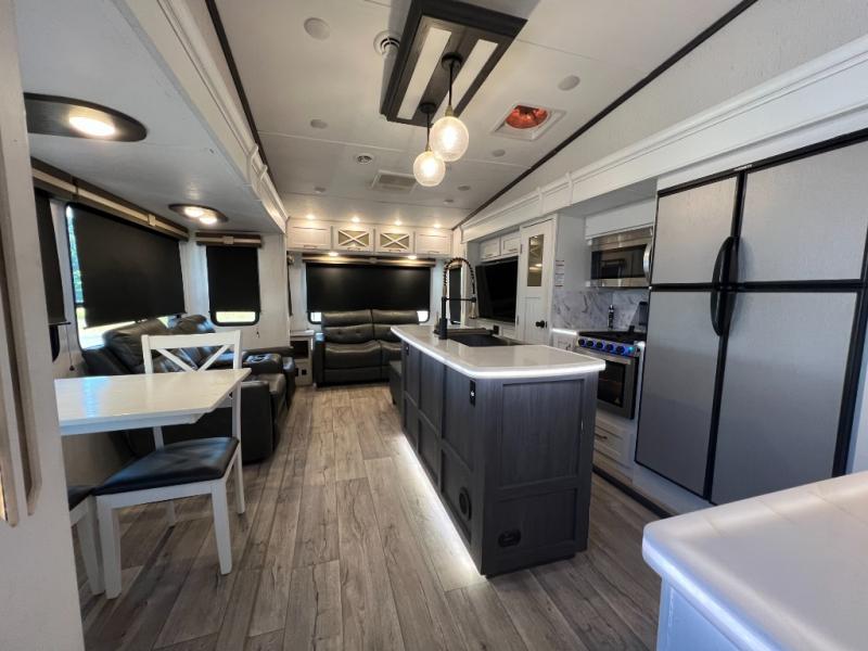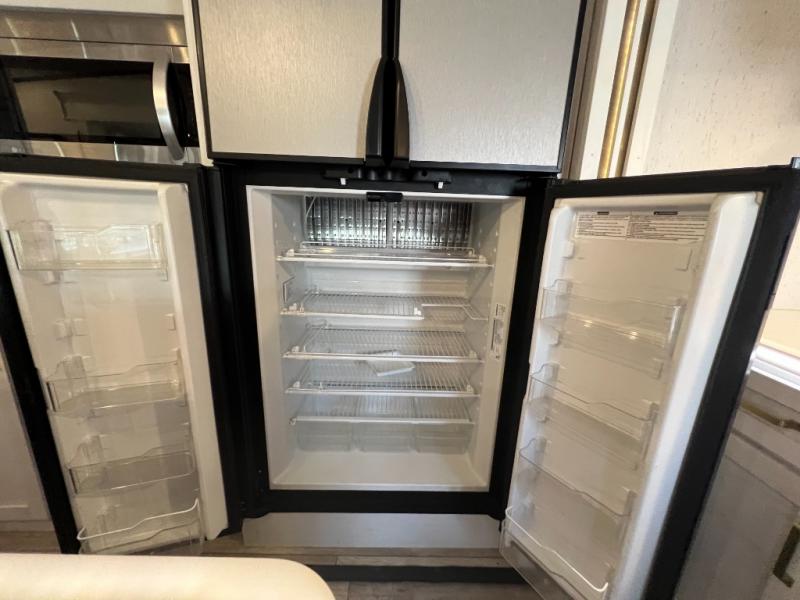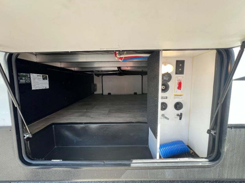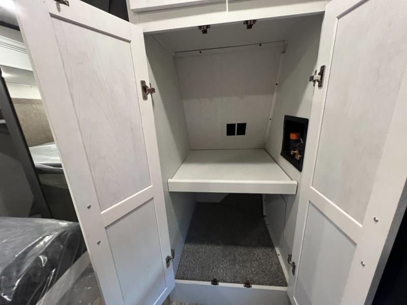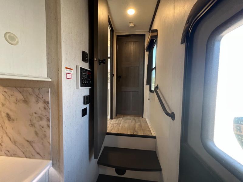 Two can get ready at once with a dual sink vanity in the full bathroom of this fifth wheel! Enjoy a good night's rest and walking around space with the king bed slide in the front private bedroom which also has a front wardrobe to keep your clothes looking their best, and a closet prepped for a washer/dryer option. The chef will have an easy time preparing meals in the kitchen with the island, the extra countertop space below the hutch, and the glass top three burner cooktop with 21" oven. The rear living area has a tri-fold sofa and theater seating across from an entertainment center with a fireplace and a 50" LED TV!