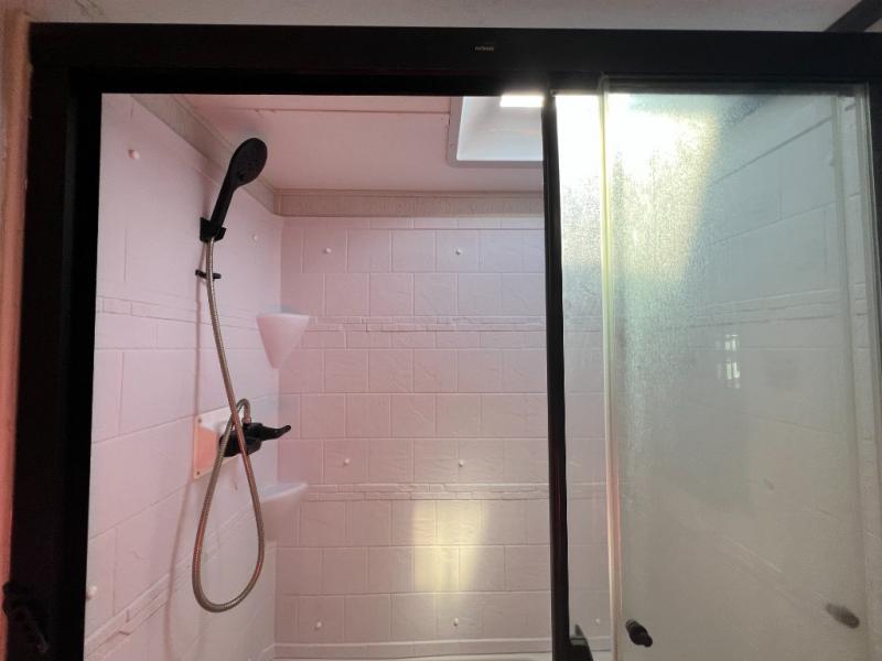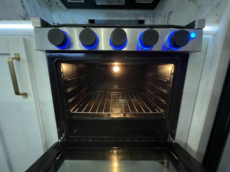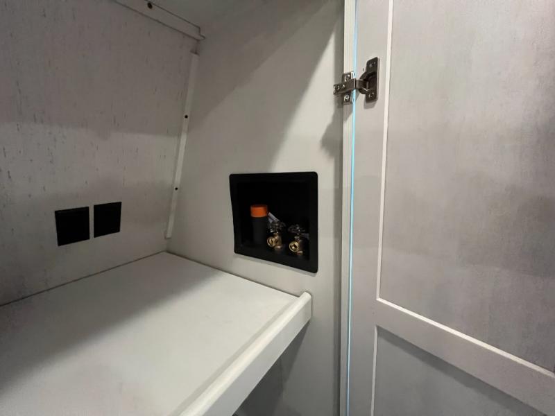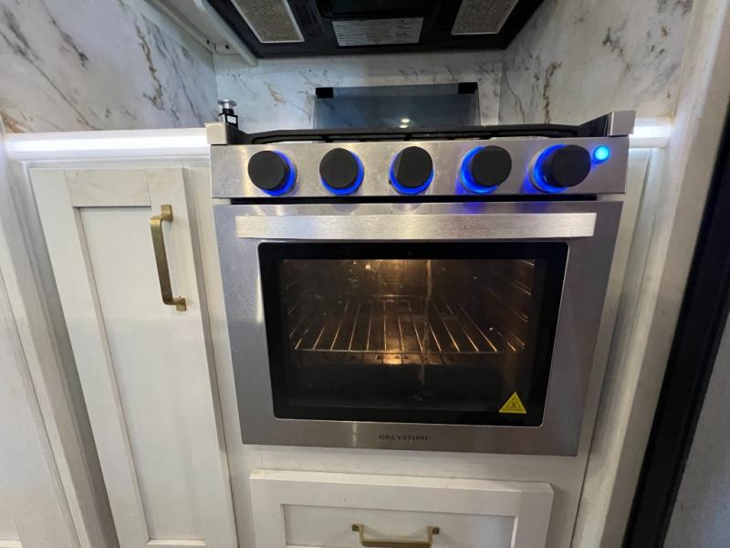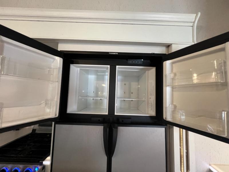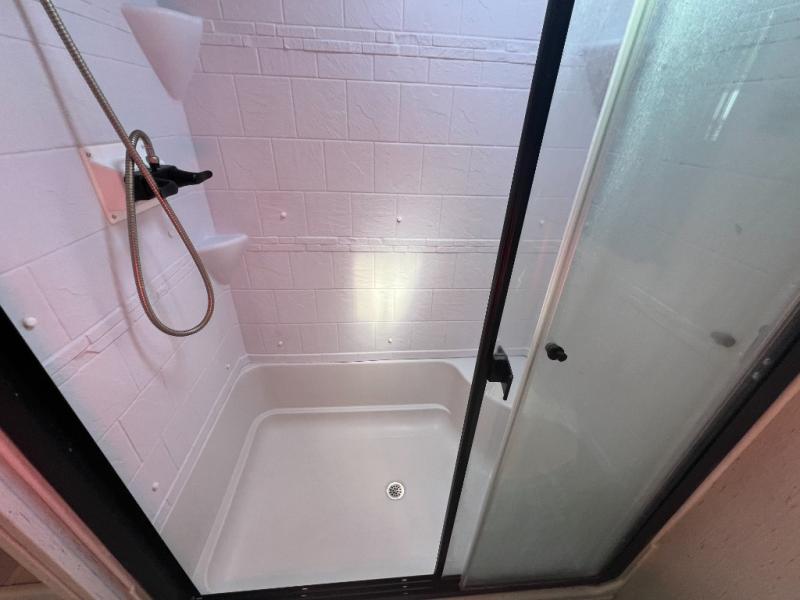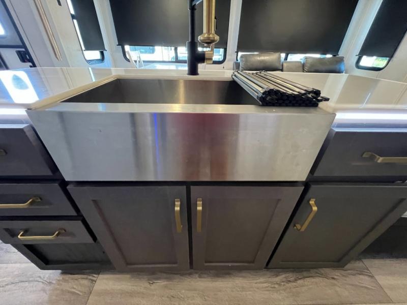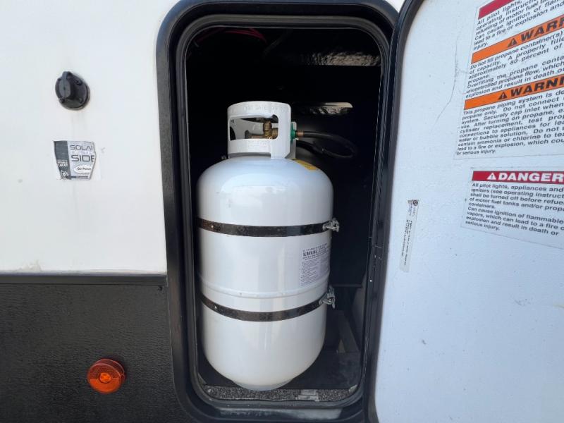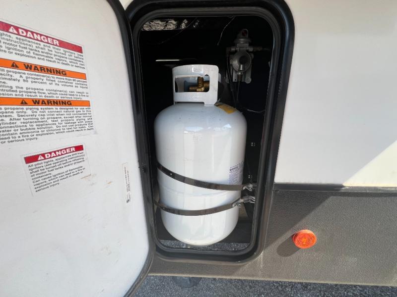 Two can get ready at once with a dual sink vanity in the full bathroom of this fifth wheel! Enjoy a good night's rest and walking around space with the king bed slide in the front private bedroom which also has a front wardrobe to keep your clothes looking their best, and a closet prepped for a washer/dryer option. The chef will have an easy time preparing meals in the kitchen with the island, the extra countertop space below the hutch, and the glass top three burner cooktop with 21" oven. The rear living area has a tri-fold sofa and theater seating across from an entertainment center with a fireplace and a 50" LED TV!