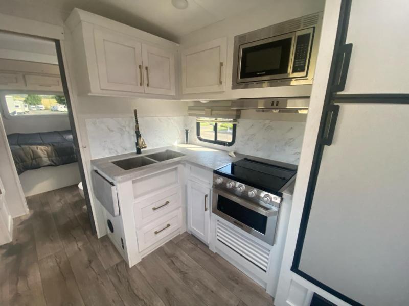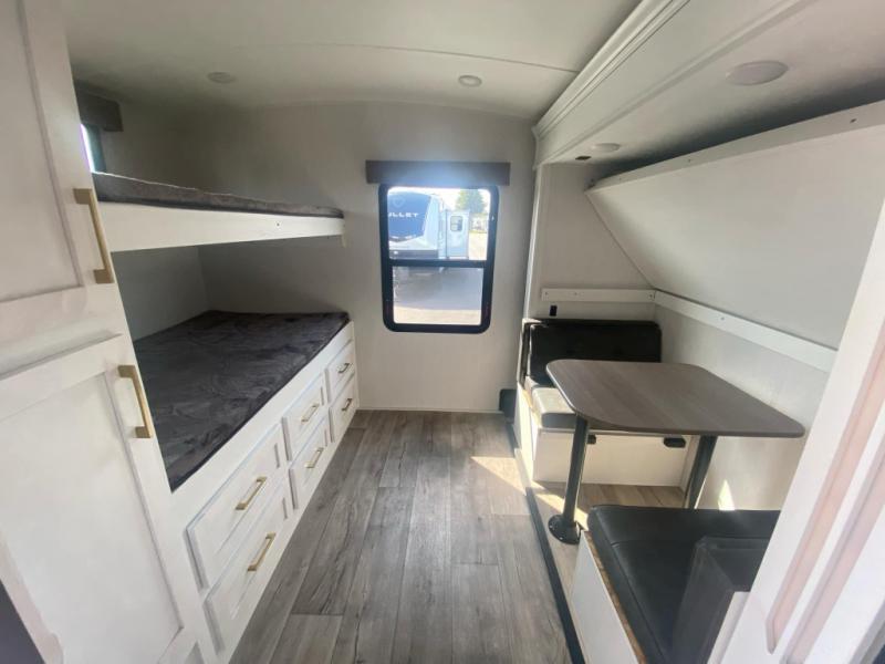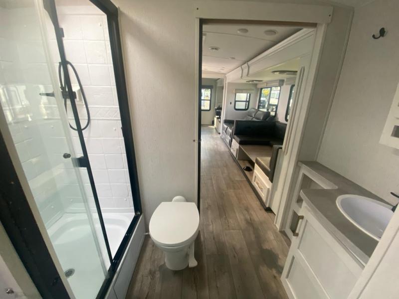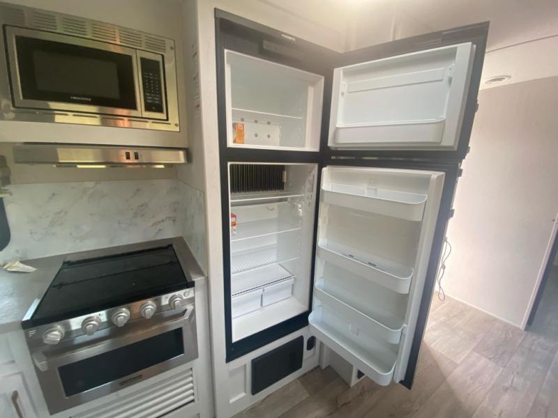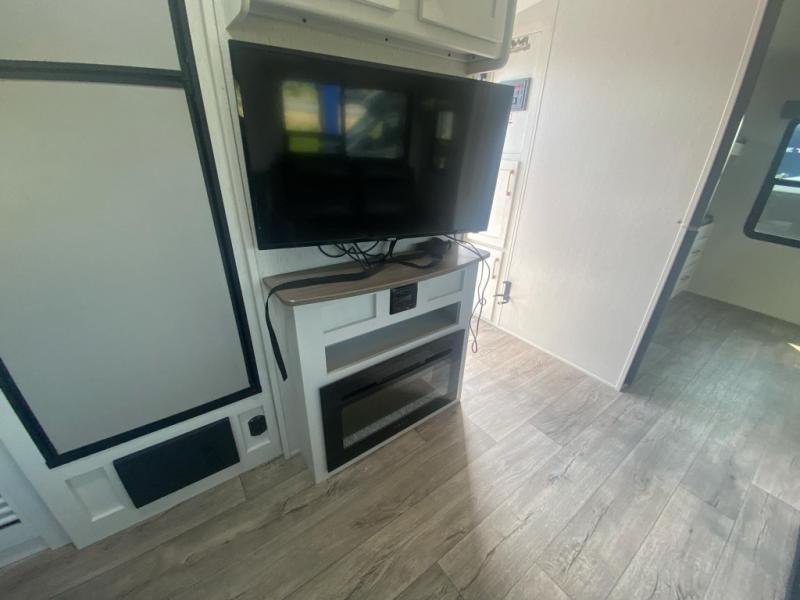 There are plenty of sleeping spaces for everyone in this travel trailer! From the rear private bunkhouse with a set of bunk beds along one side and a bunk bed above a sofa on the other to the front private bedroom with a king bed. You can even transform the tri-fold sofa and U-shaped dinette slide into extra sleeping spaces if needed. The walk-through bathroom has everything you will need to freshen up each morning. The chef will love cooking indoors with the glass top three burner cooktop with a 17" oven, yet may love cooking at the outdoor kitchen even more. Grab a snack from the walk-in pantry behind the entertainment center and watch your favorite movie on the 40" LED TV while a fire roars in the 30" glass fireplace!