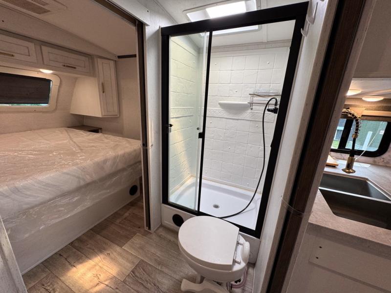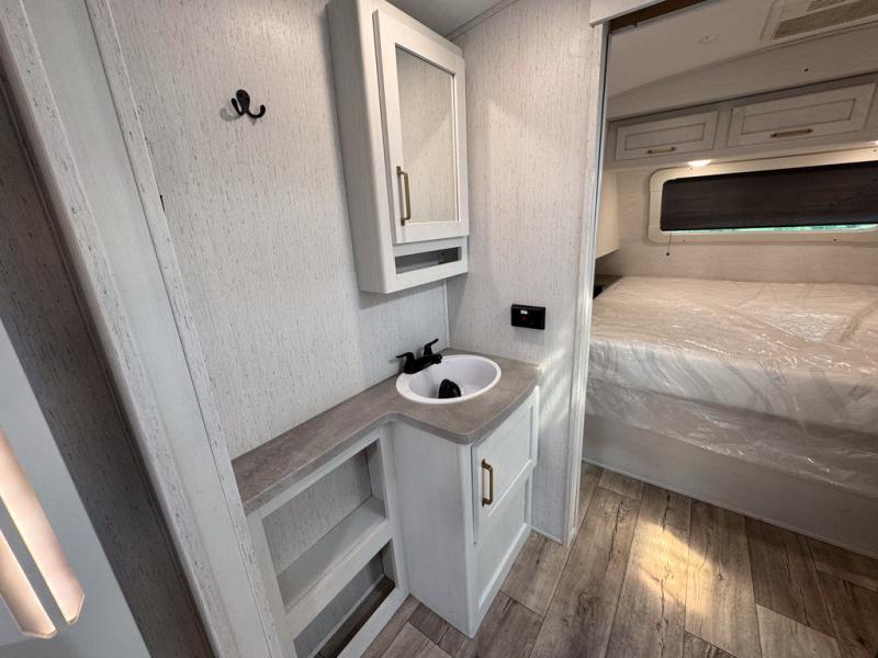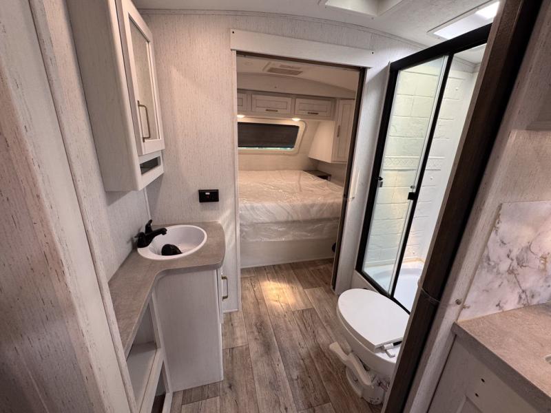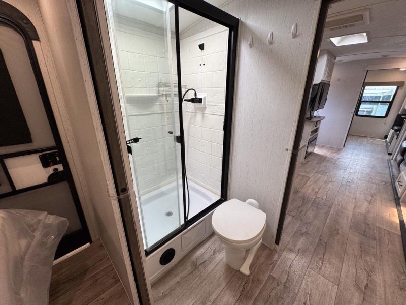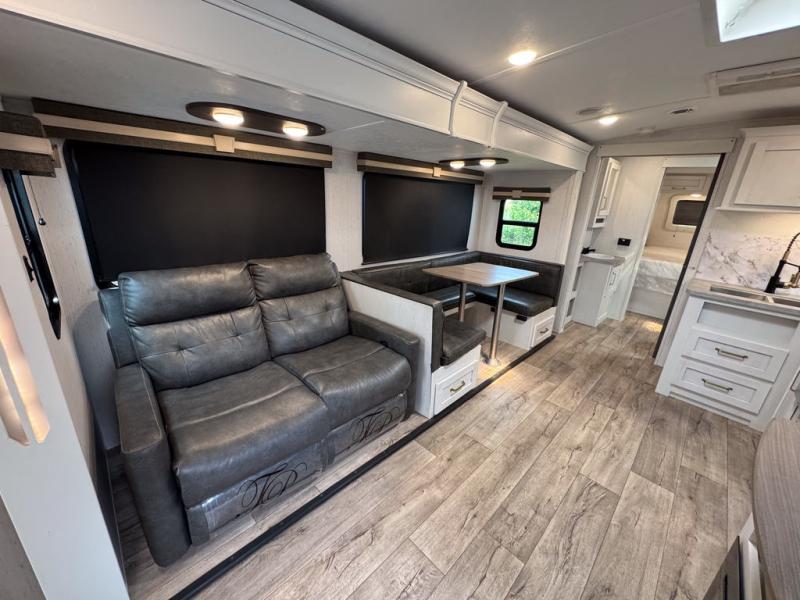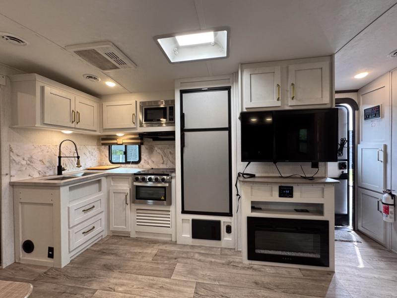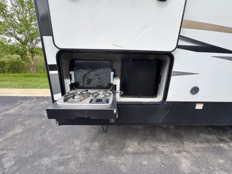 There are plenty of sleeping spaces for everyone in this travel trailer! From the rear private bunkhouse with a set of bunk beds along one side and a bunk bed above a sofa on the other to the front private bedroom with a king bed. You can even transform the tri-fold sofa and U-shaped dinette slide into extra sleeping spaces if needed. The walk-through bathroom has everything you will need to freshen up each morning. The chef will love cooking indoors with the glass top three burner cooktop with a 17" oven, yet may love cooking at the outdoor kitchen even more. Grab a snack from the walk-in pantry behind the entertainment center and watch your favorite movie on the 40" LED TV while a fire roars in the 30" glass fireplace!