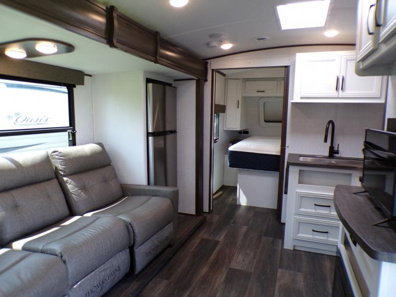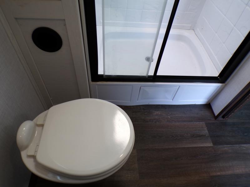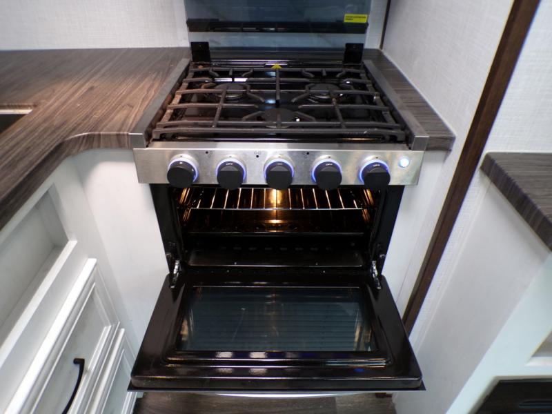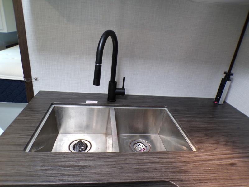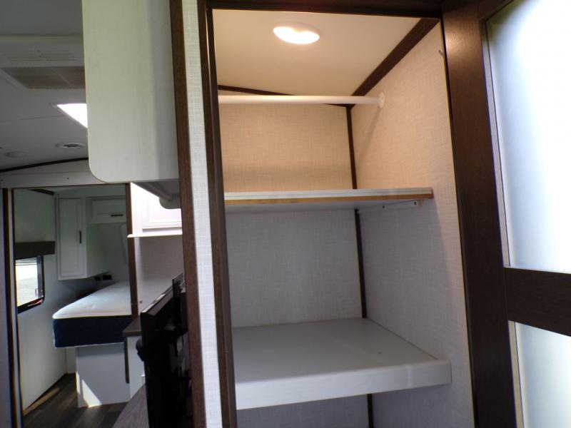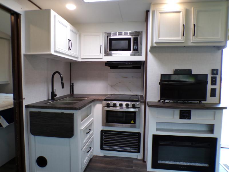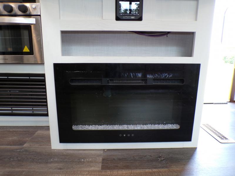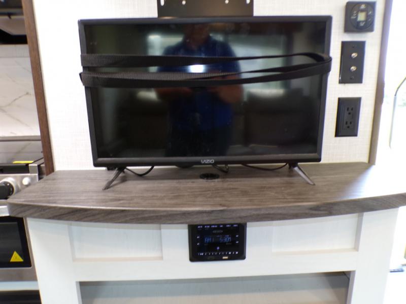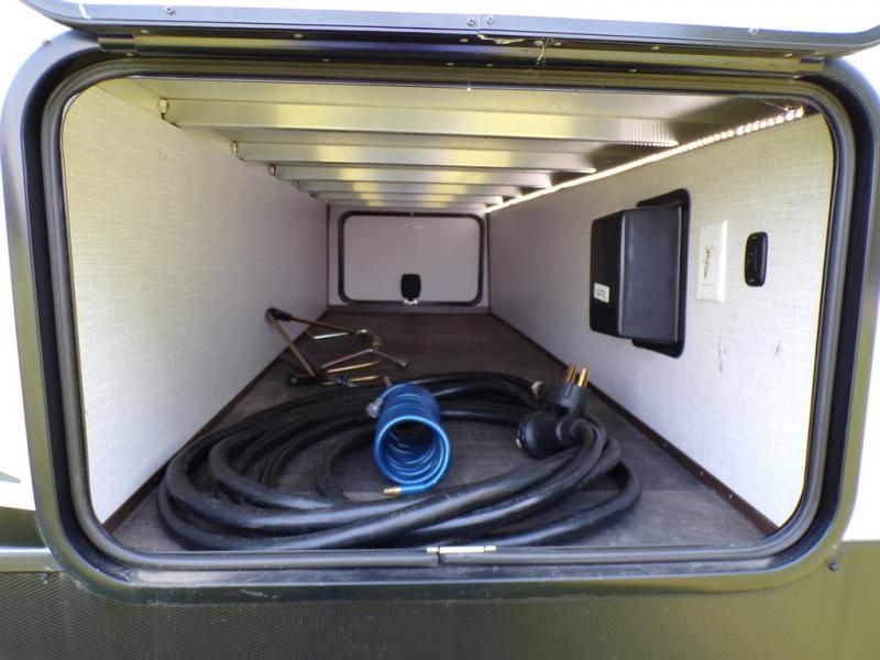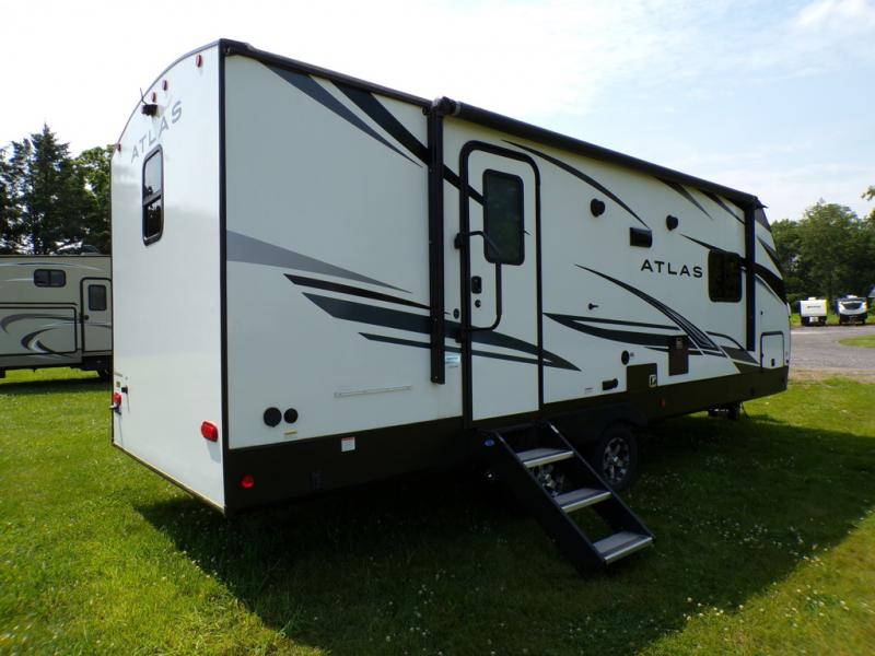 You and your spouse can have your own getaway whenever you want with this Atlas travel trailer! This trailer is perfectly suited for two people to enjoy camping, and it comes with everything needed to make you both feel comfortable, like a private bedroom with king-size bed, a 78" chaise lounge with removable table, a full rear bathroom, and a complete kitchen with countertop extension. You even have some extra amenities that put the cherry on top, like the entertainment center with an LED HDTV and fireplace below and the pop-up power station in the kitchen.