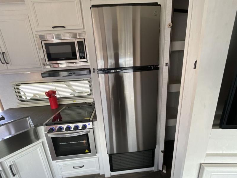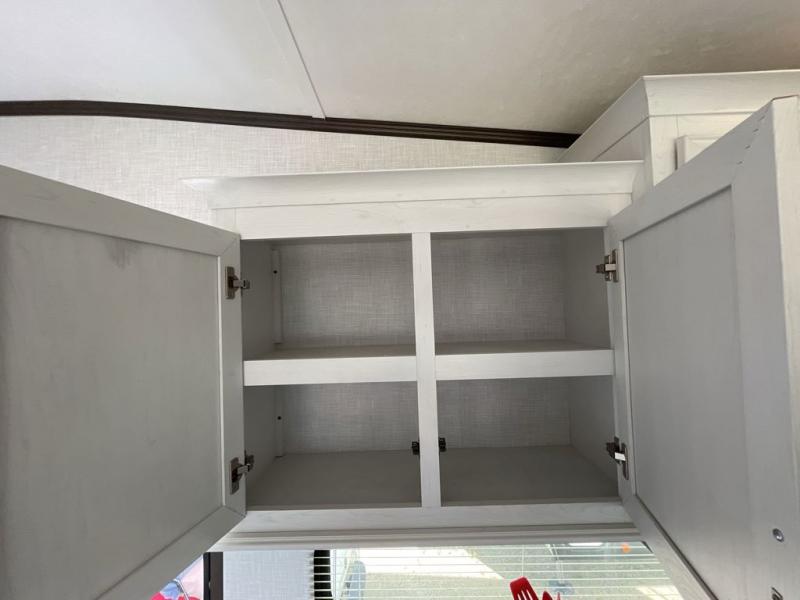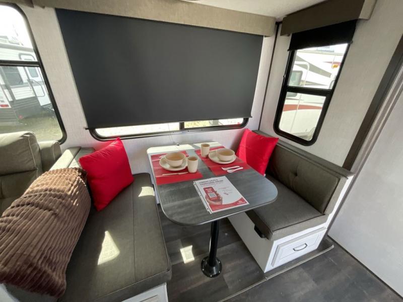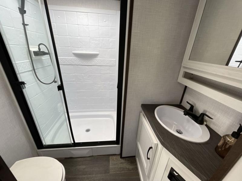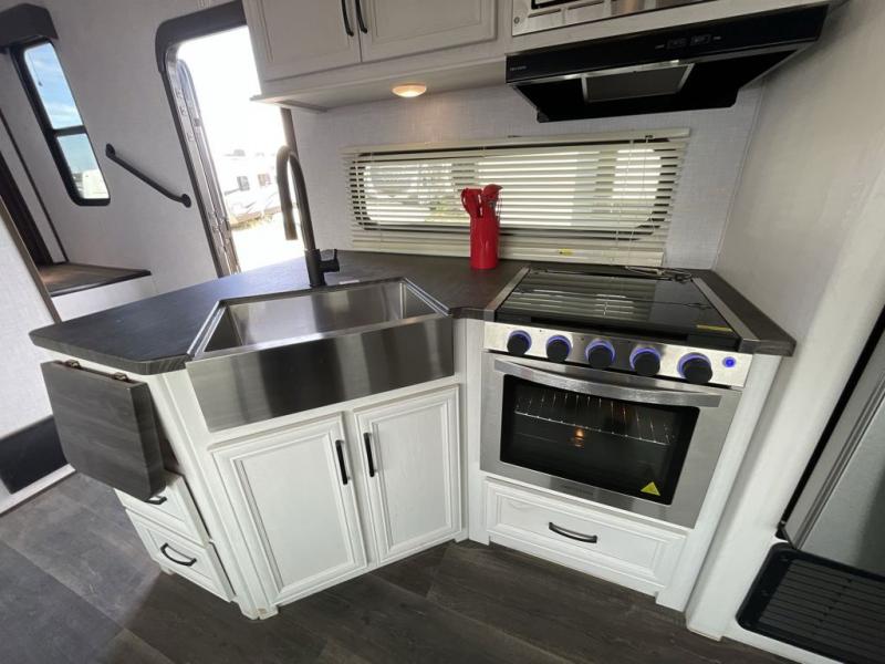 Each day you'll find another thing you love about this Atlas fifth wheel! Whether you're cooking inside on the recessed cooktop with large oven or outside at the outdoor kitchen, you'll find it quite easy to get meals together each day. The interior kitchen also has a pop-up power station that you can use to charge your phone while you cook. The booth dinette has storage drawers so that you can keep your favorite board games ready to go for game night, and the LED accent lights are on a motion sensor for convenience. Stay clean in the bathroom, and enjoy the added sunlight that comes from the 22" skylight. You'll also have great comfort as you sleep each night on the residential queen bed, and the wardrobe slide will stay out of the way so that you can walk around the bed on both sides.