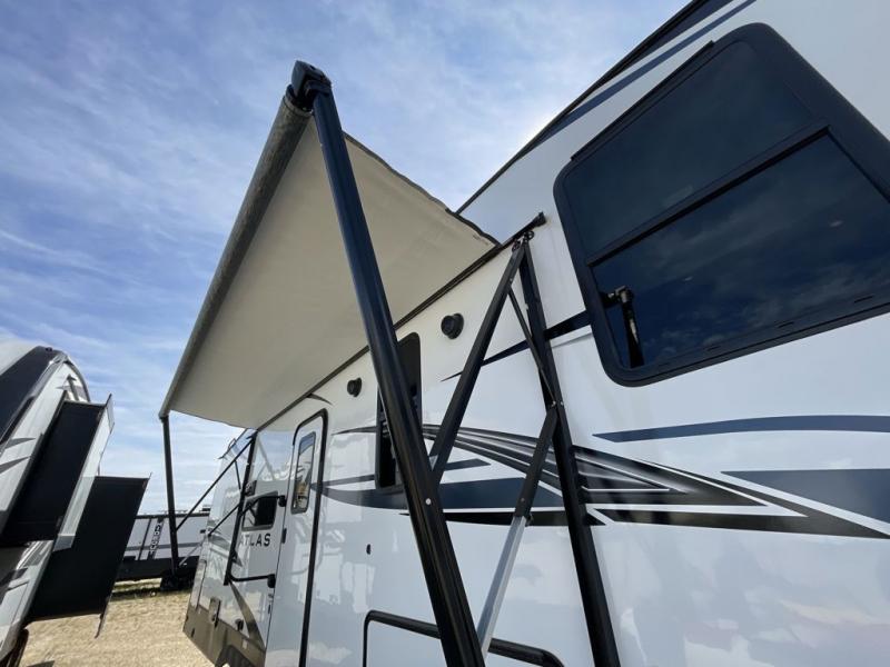 Journeys have never been more fun or packed with amenities than with the Dutchmen Atlas fifth wheel or travel trailer! These units come equipped with outside speakers, preparations for a backup camera, an oversized lighted pass-through storage, and a fully enclosed and heated underbelly. The friction-hinge entry door won't fly away when you open it, and the exterior spray port lets you hook up a hose to provide water when you need it. The fifth wheels have an electric four-point leveling system, and the travel trailers have electric stabilizer jacks. A painted fiberglass front cap protects the front portion of your Atlas, and the electric adjustable awning with LED lights is going to allow you to party outside with shade when you want it.