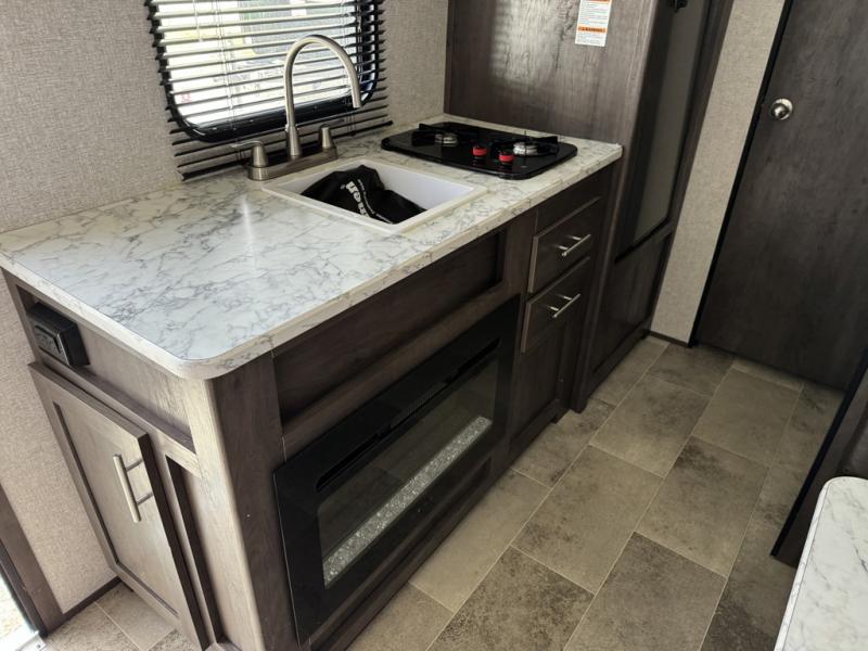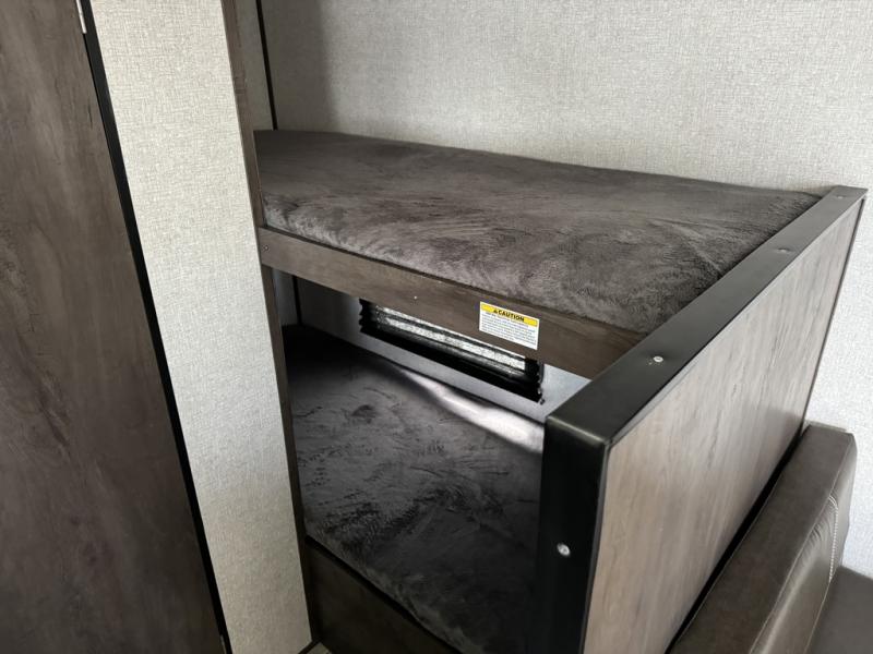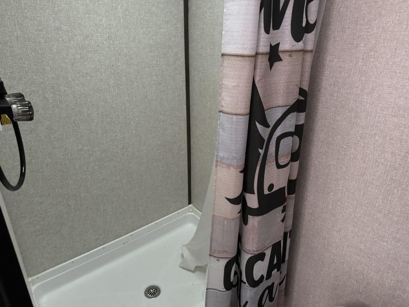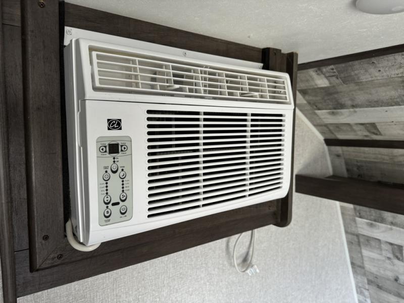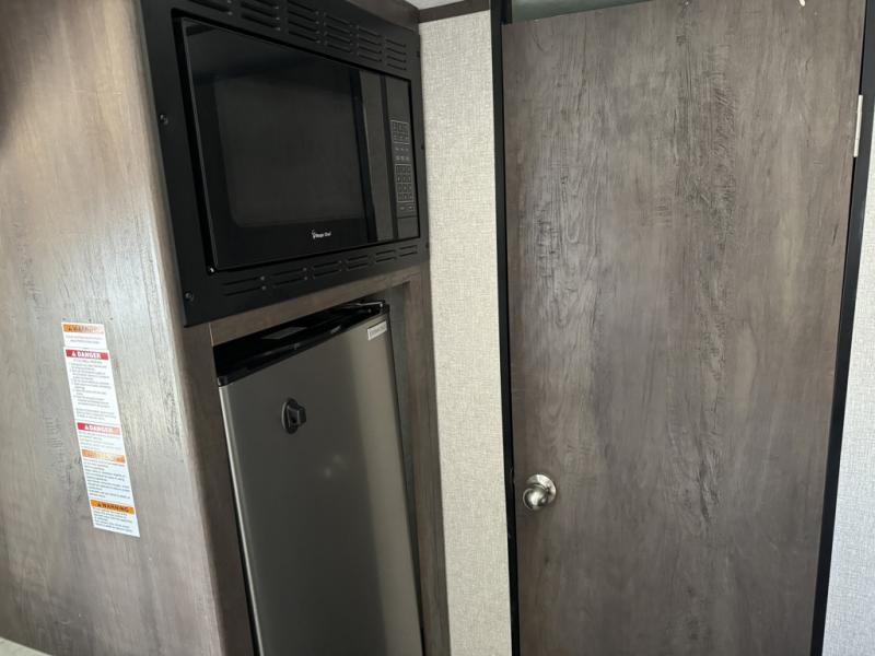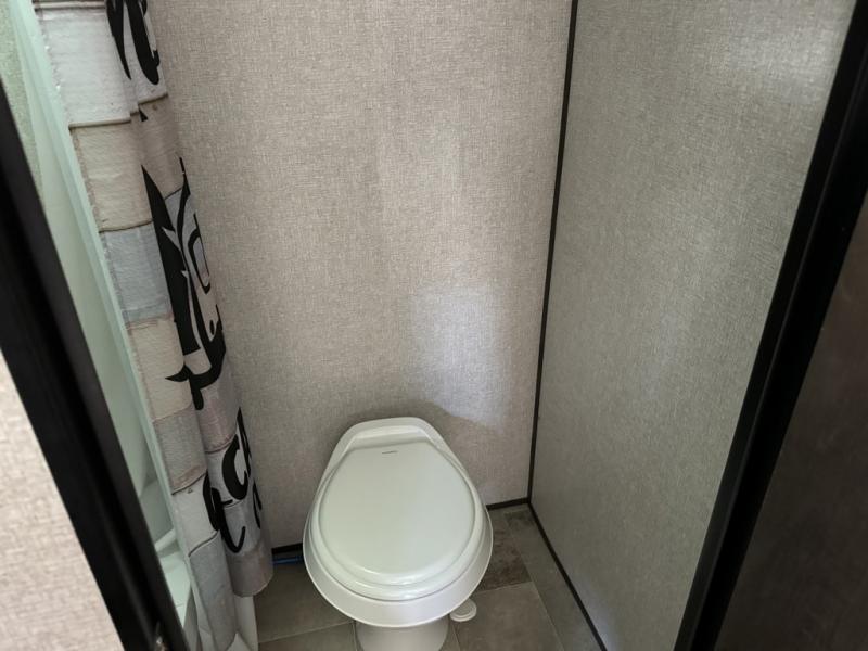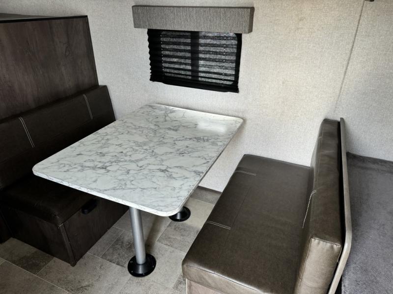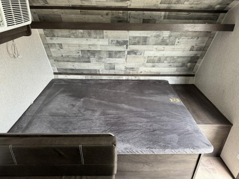 After making dinner on the two burner cooktop or inside the microwave, you can dine at the booth dinette or outside under the 8' power awning if you brought along your camping chairs. Either way you will be comfortable and the dinette may even sleep one person if needed. After playing outdoors all day, everyone can return to get cleaned up in the private toilet and shower room then fall asleep on the queen bed up front or the bunk beds in the rear. And everyone can wake up the next morning to do it over again.