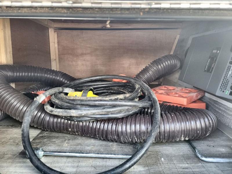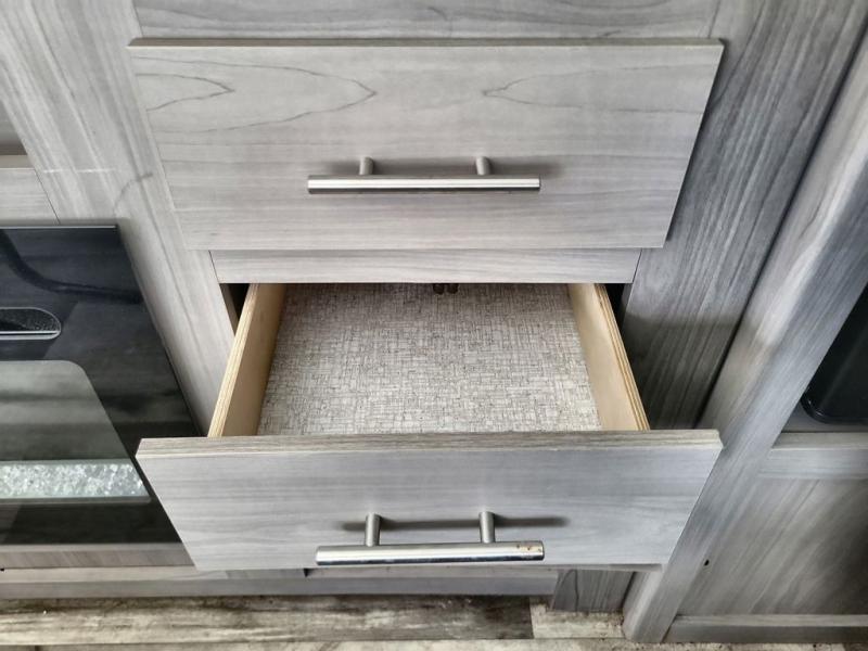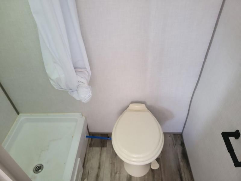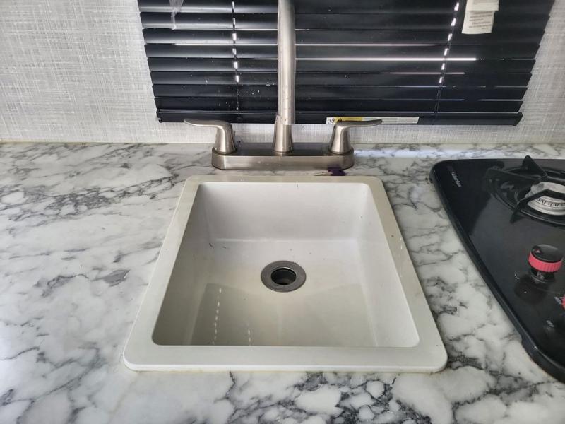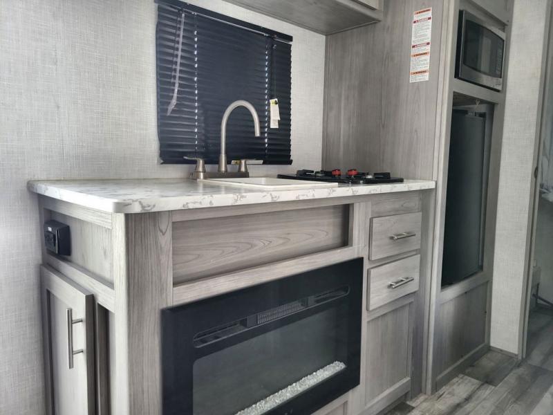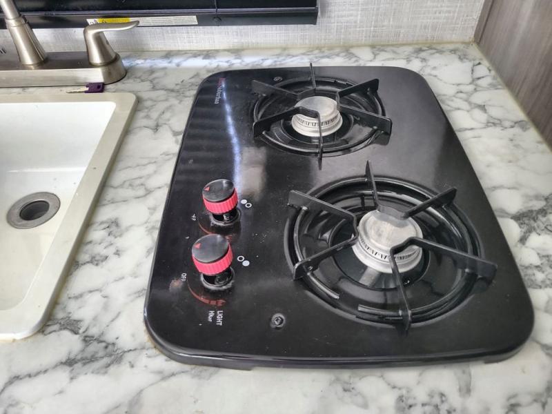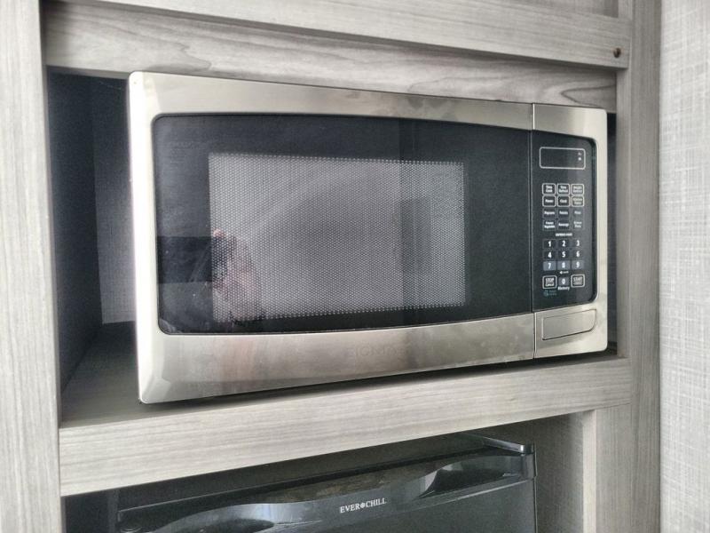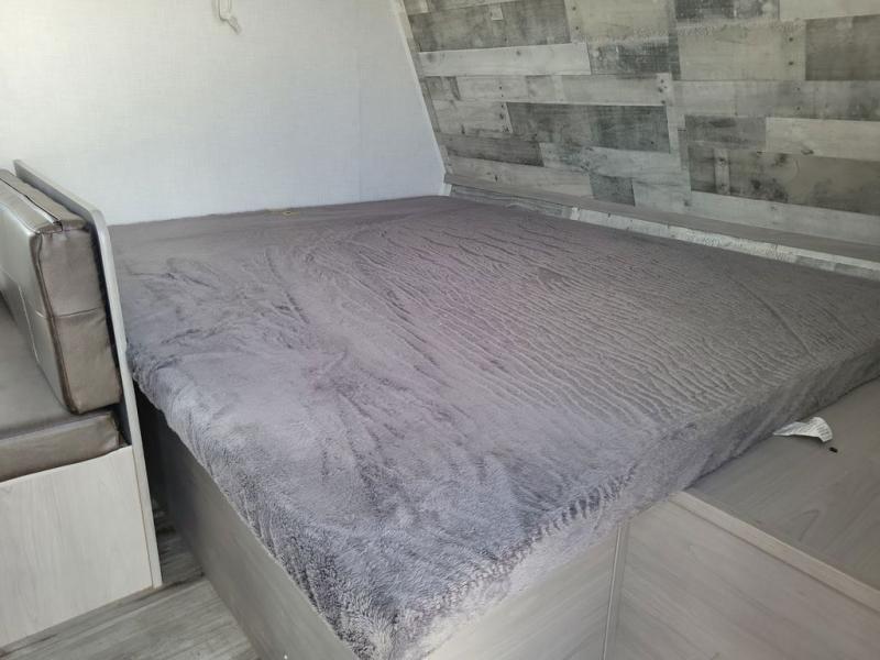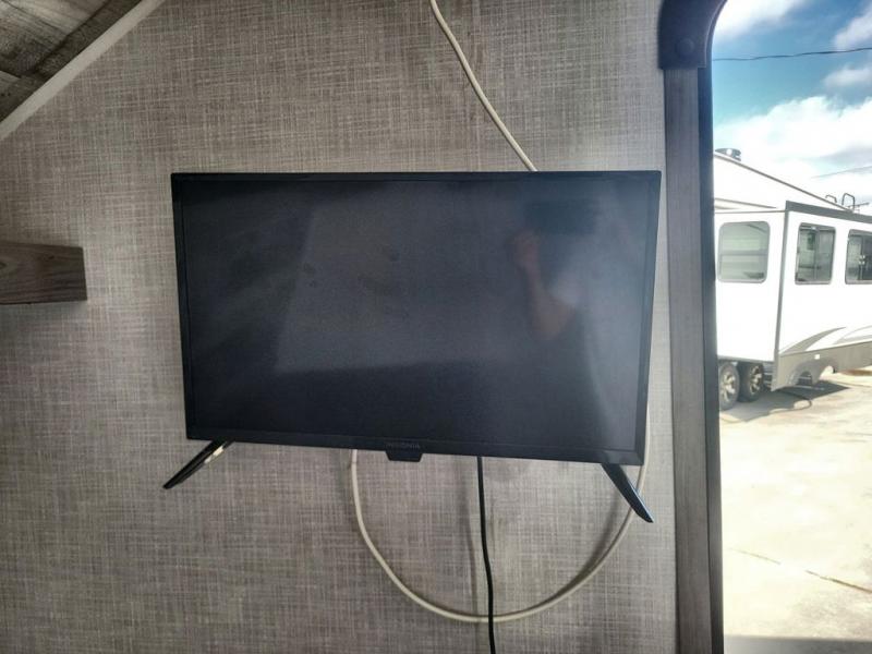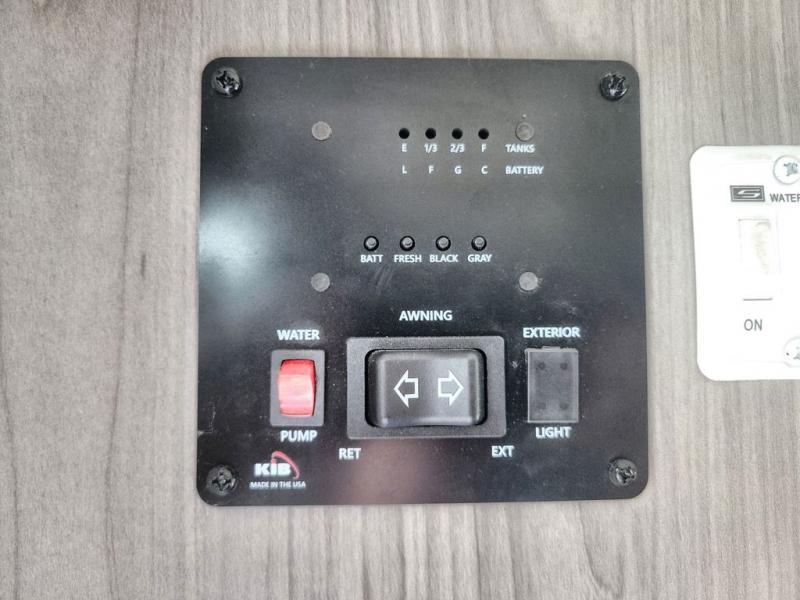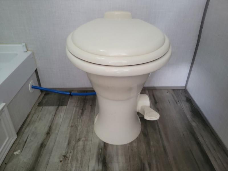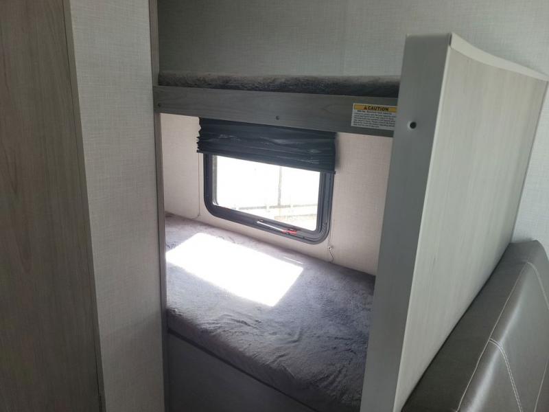 After making dinner on the two burner cooktop or inside the microwave, you can dine at the booth dinette or outside under the 8' power awning if you brought along your camping chairs. Either way you will be comfortable and the dinette may even sleep one person if needed. After playing outdoors all day, everyone can return to get cleaned up in the private toilet and shower room then fall asleep on the queen bed up front or the bunk beds in the rear. And everyone can wake up the next morning to do it over again.