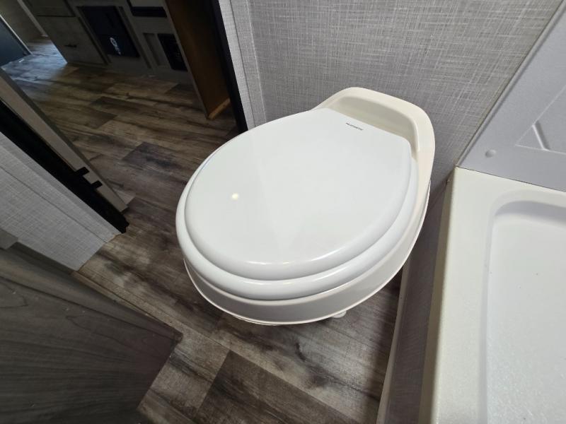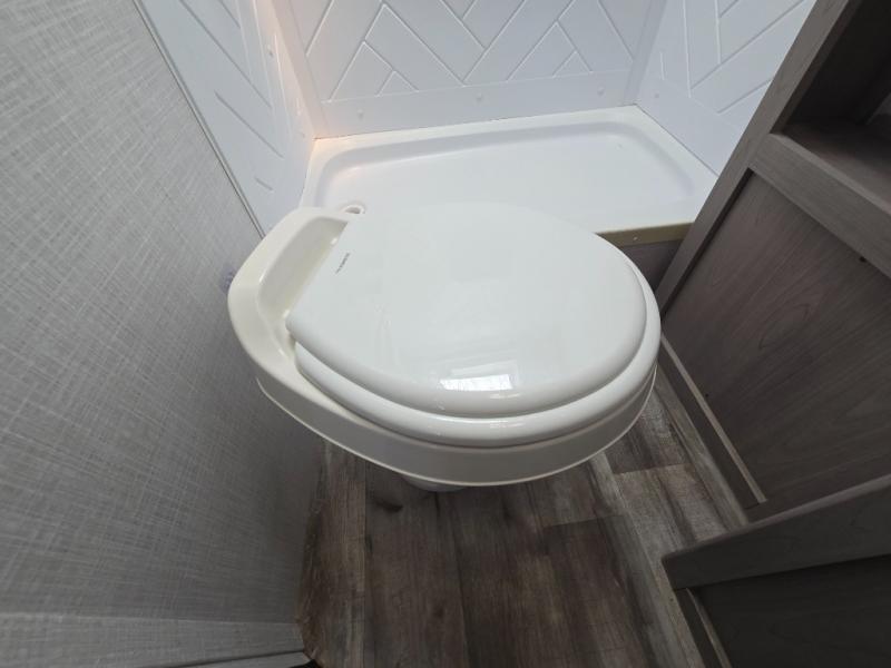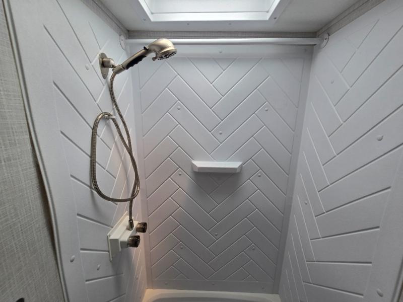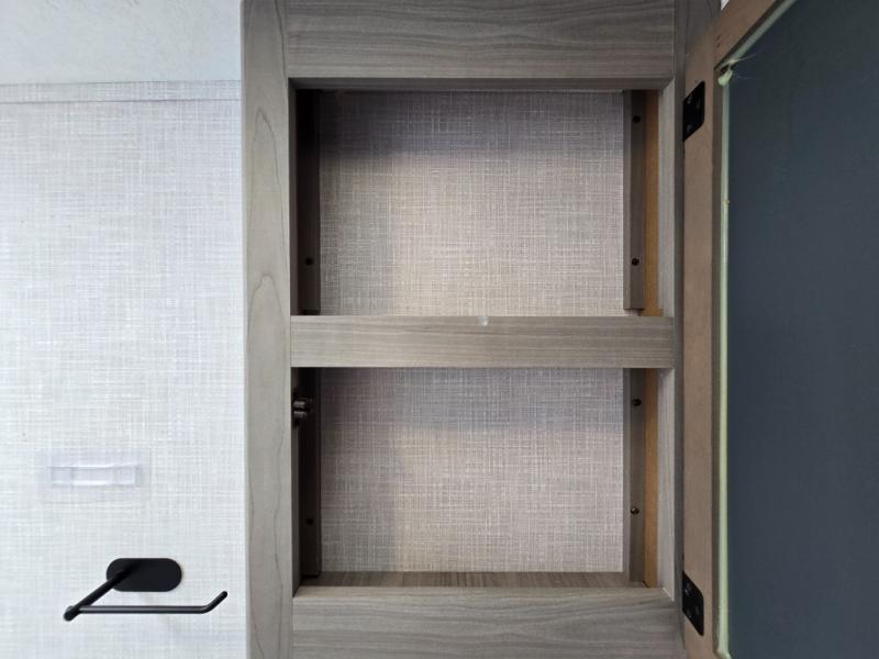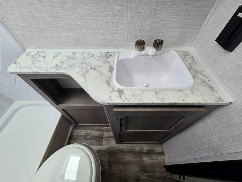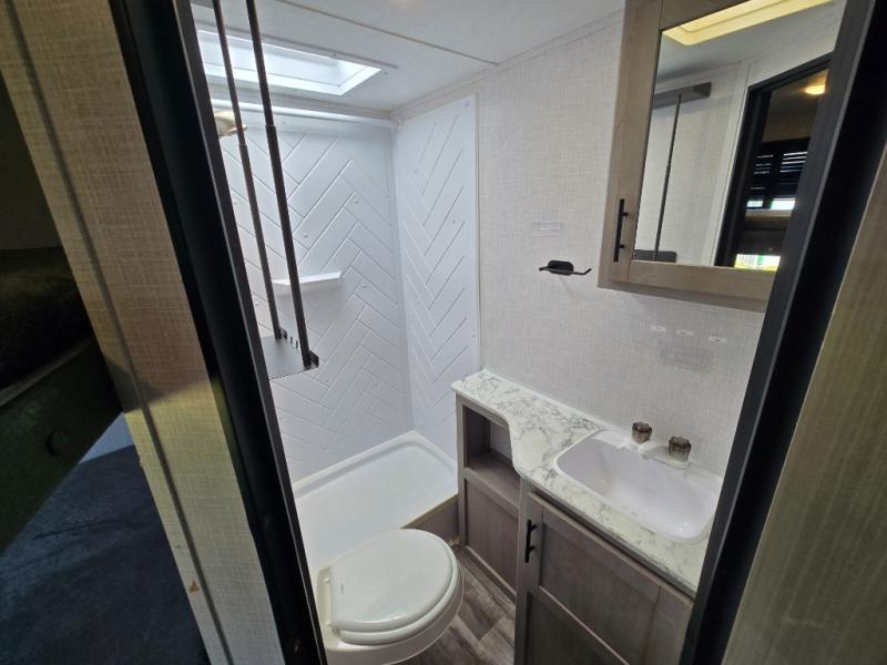 The full bathroom includes a shower, power vent fan, and wood-framed mirrored medicine cabinet, giving you everything you need to freshen up after a day of adventure.