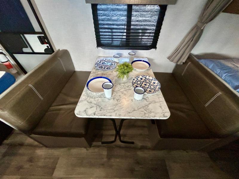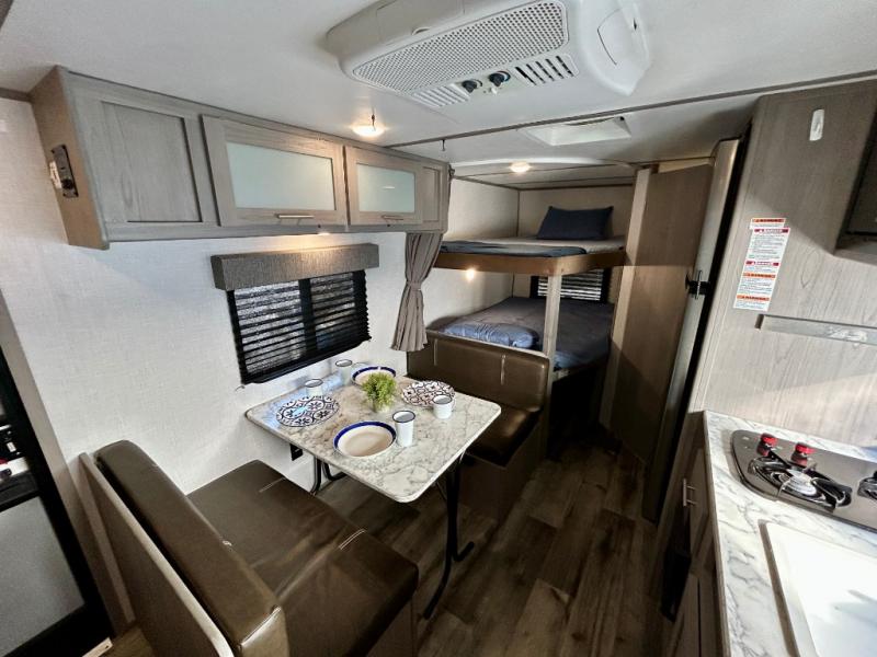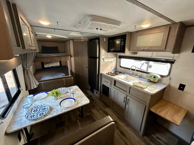 Camping trips to the lake are made cozy in this travel trailer that can sleep six people each night. The Murphy bed up front provides space to sleep at night, and in the morning you can fold it away to relax on the sofa. The kids are sure to love the bunk beds, and there is a booth dinette that can serve as additional sleeping space when it's not being use to dine at. This model includes an outdoor griddle with a refrigerator to prepare breakfast outdoors, and the 10' power awning with LED lights will provide an outdoor living space.
