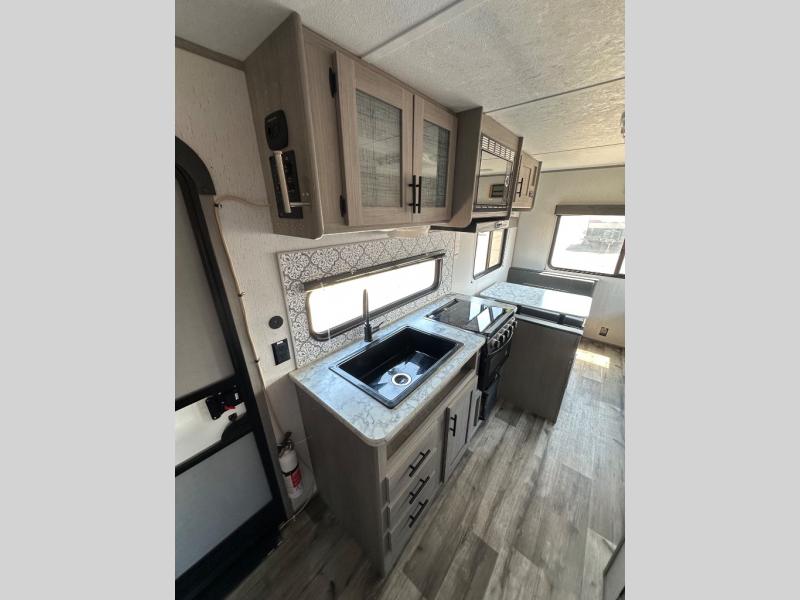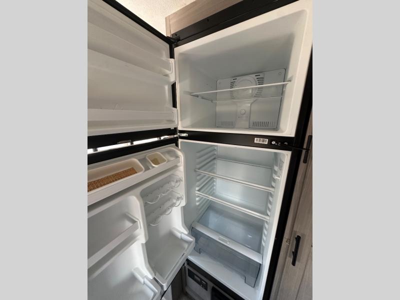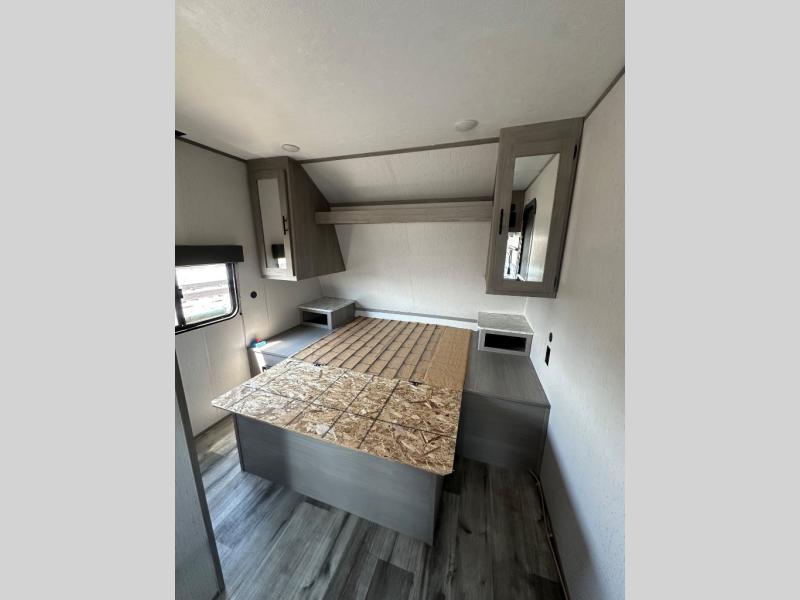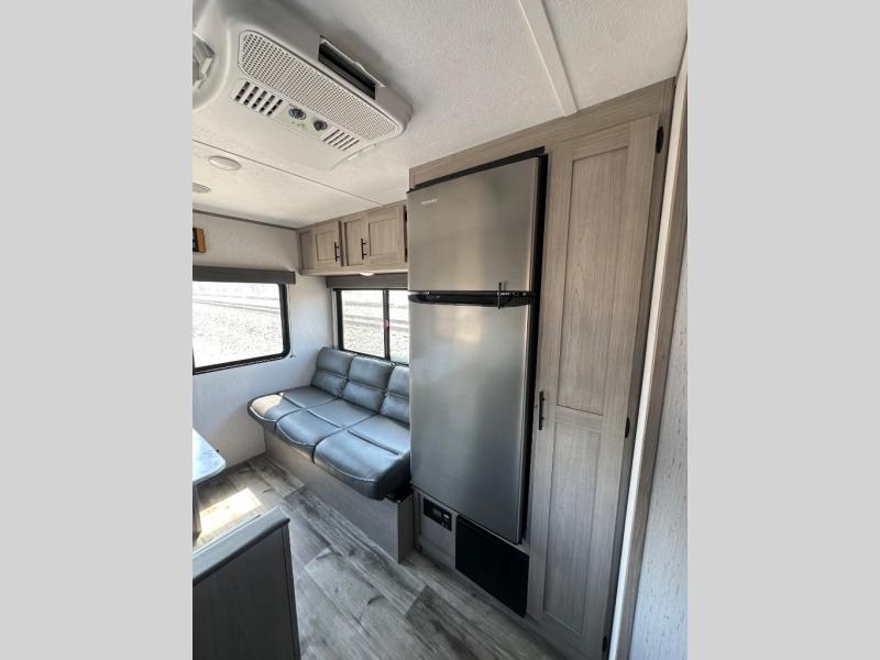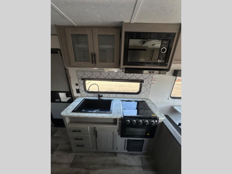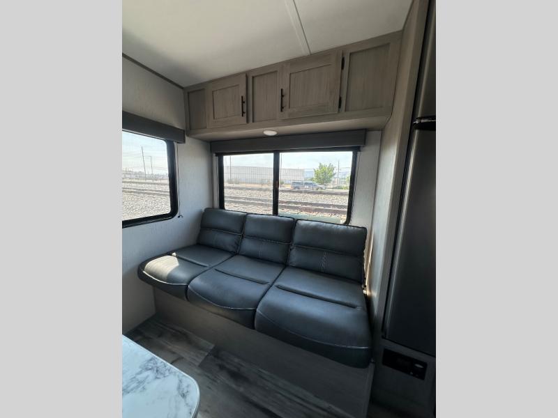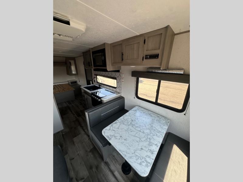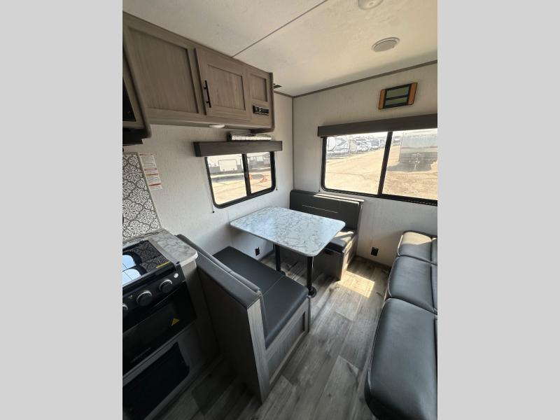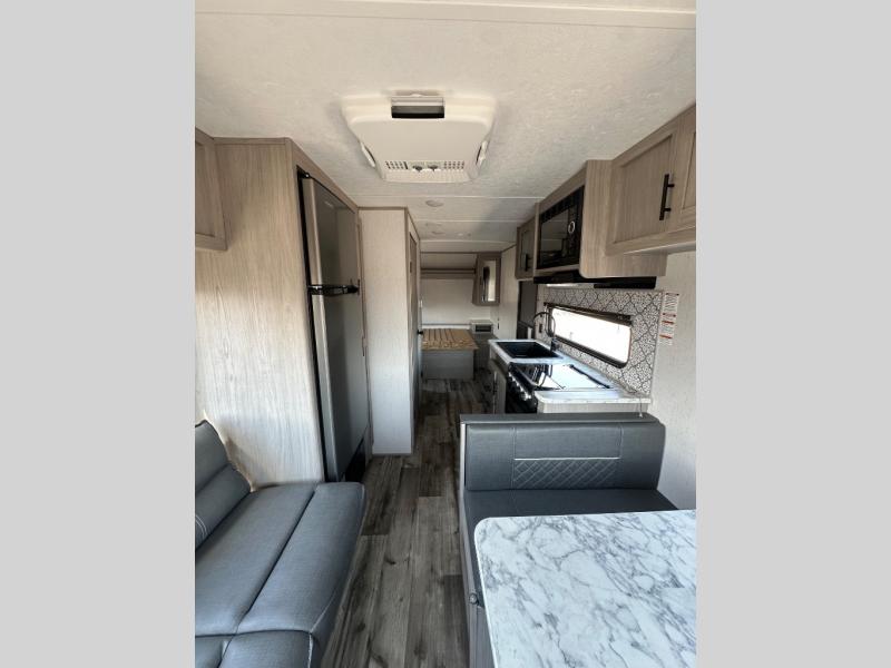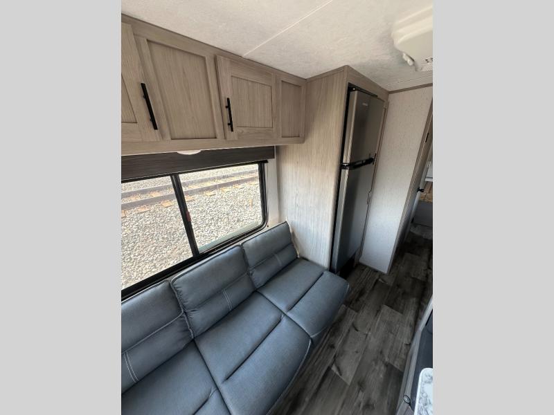 Your tent-camping days are over with this travel trailer in tow! Once you arrive at your destination, grab your fishing poles from the pass-through storage and head down to the lake. The full bath will allow you to freshen up when you return, plus there is a bath skylight for added standing space. The chef of your group can prepare dinner on the cooktop or oven, and perishables can be stored in the 10 cu. ft. refrigerator. There is a booth dinette where you can dine at, and a reclining sofa for extra seating space. You will love having your own queen bed up front with dual wardrobes on either side, and your guests can sleep on the furniture in the back!