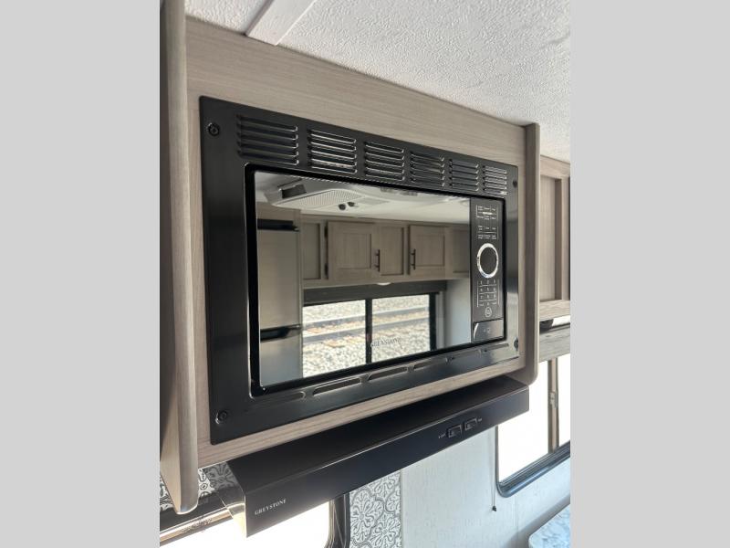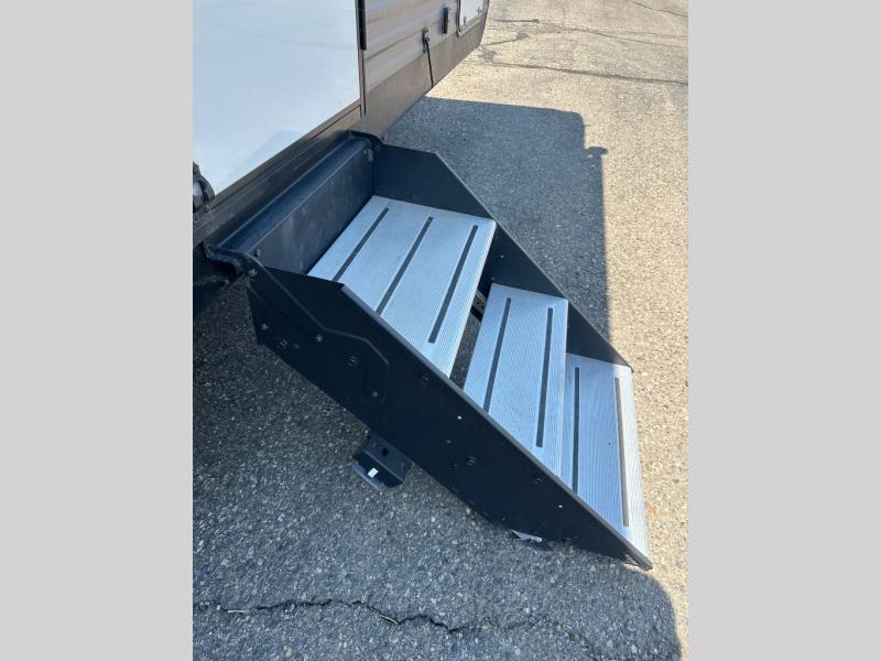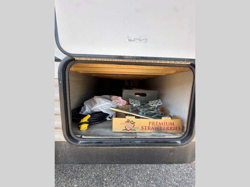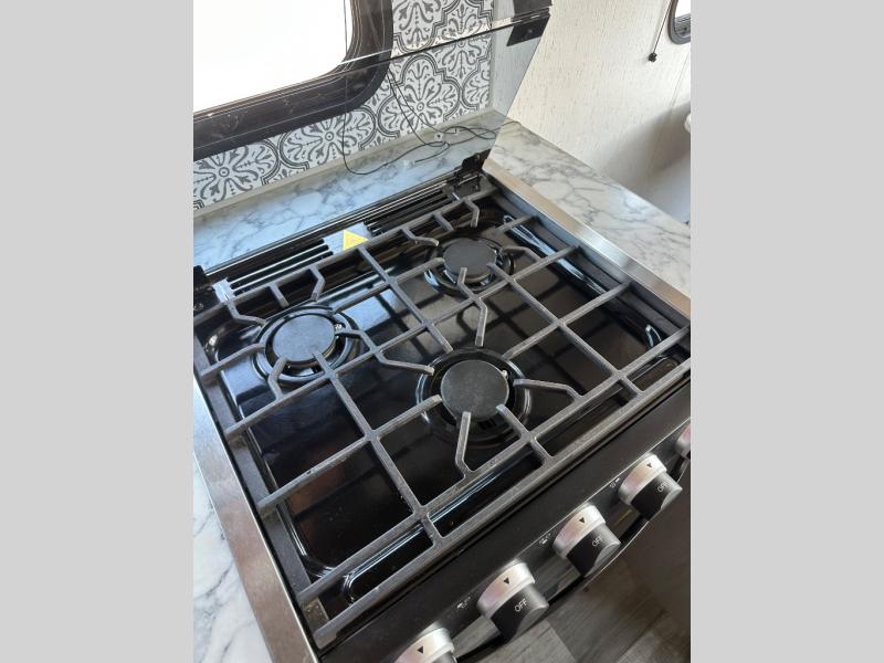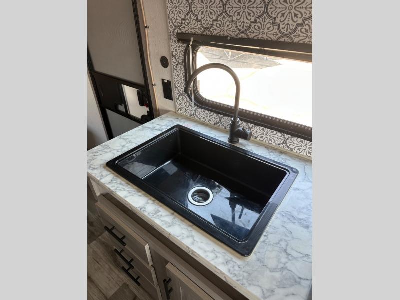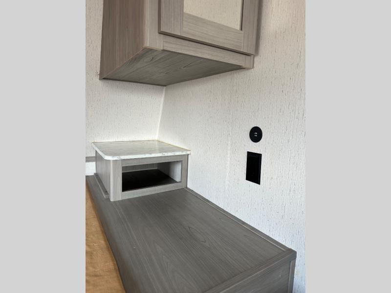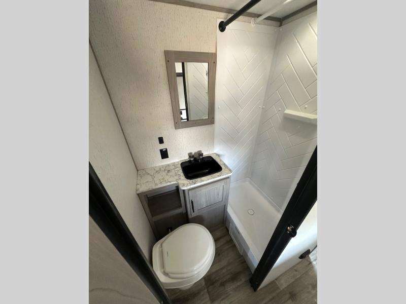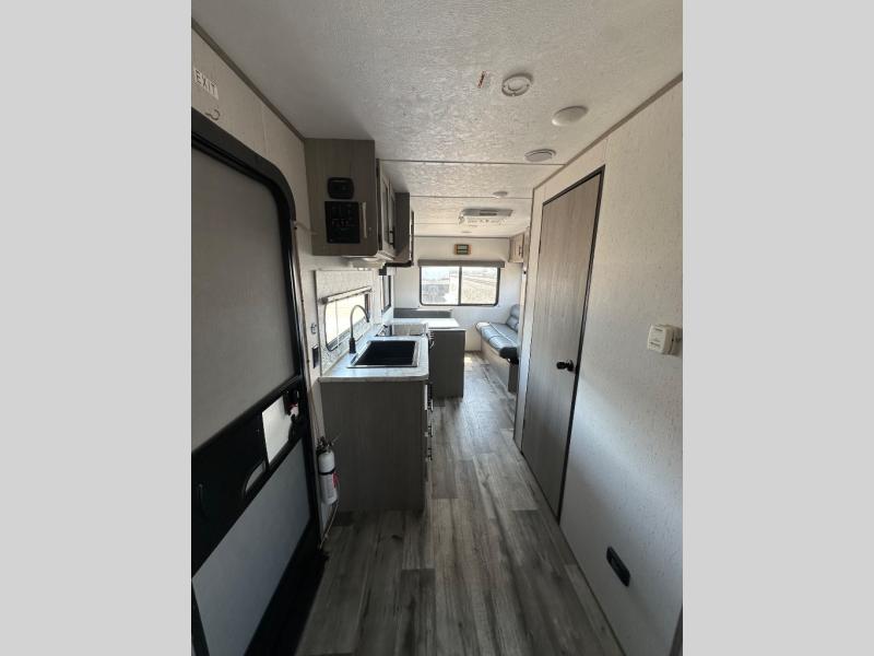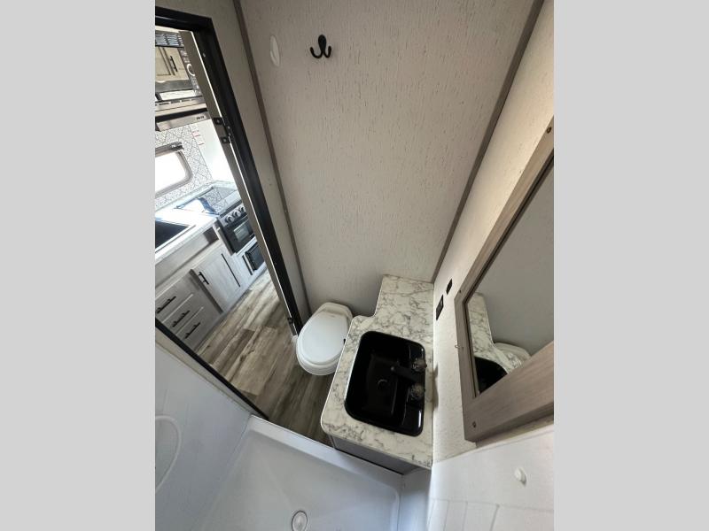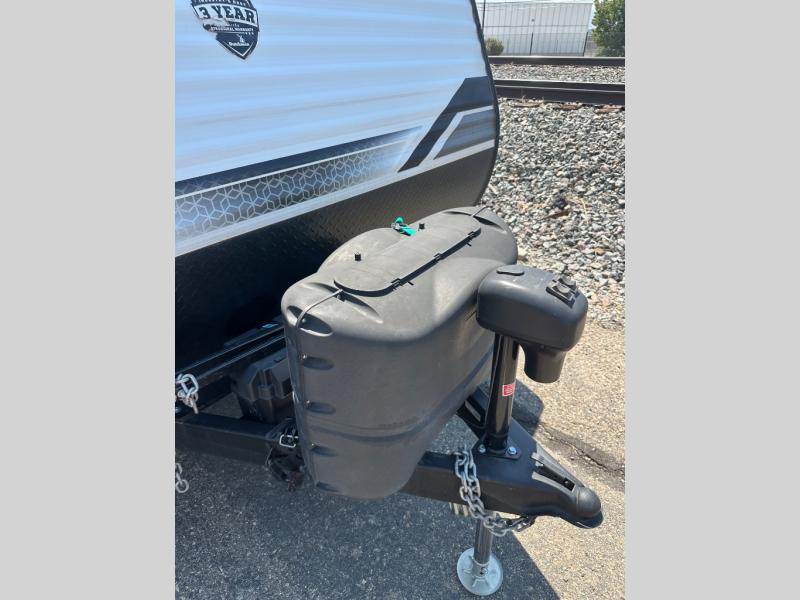 Your tent-camping days are over with this travel trailer in tow! Once you arrive at your destination, grab your fishing poles from the pass-through storage and head down to the lake. The full bath will allow you to freshen up when you return, plus there is a bath skylight for added standing space. The chef of your group can prepare dinner on the cooktop or oven, and perishables can be stored in the 10 cu. ft. refrigerator. There is a booth dinette where you can dine at, and a reclining sofa for extra seating space. You will love having your own queen bed up front with dual wardrobes on either side, and your guests can sleep on the furniture in the back!