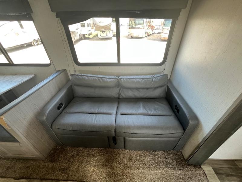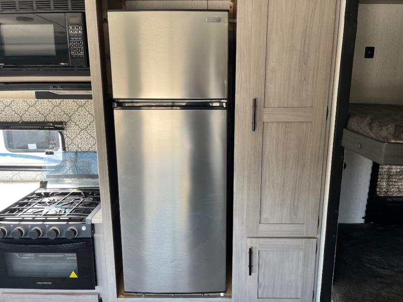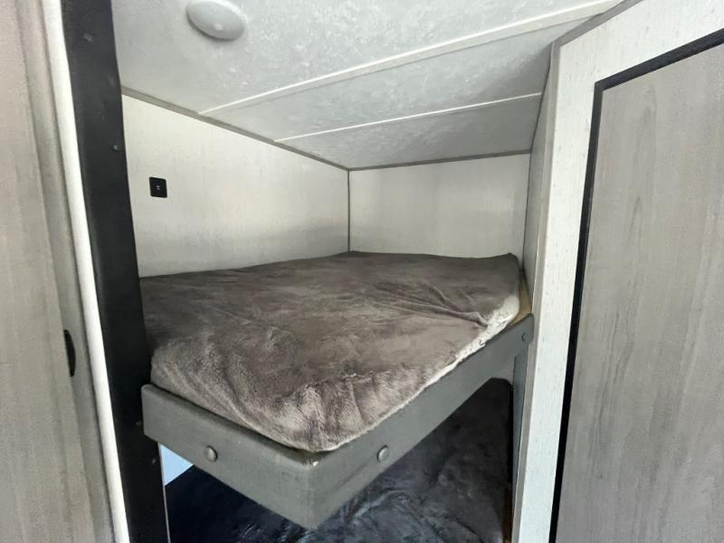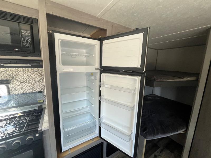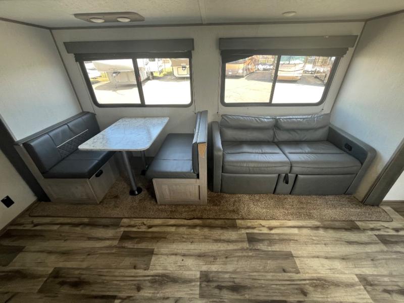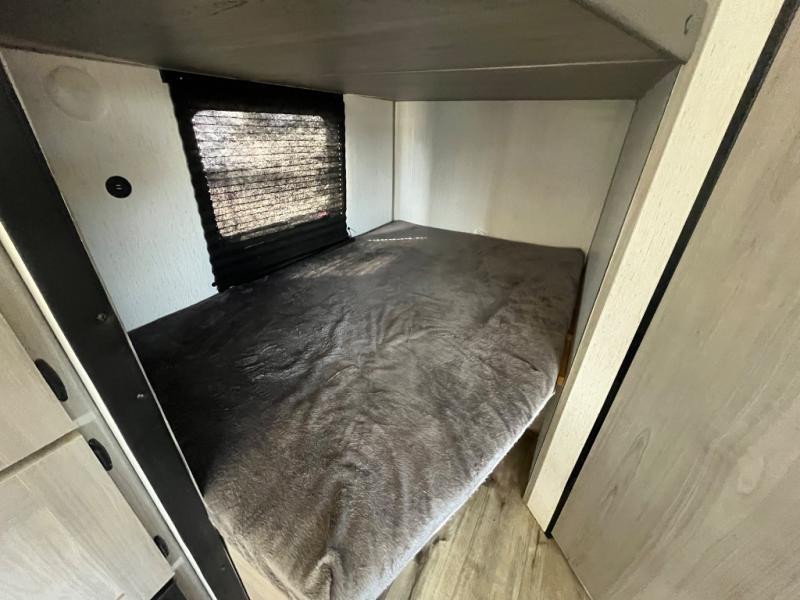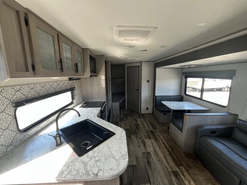 Family fun is found in this spacious travel trailer with double-size bunks, a large slide out, and a private bedroom up front! You can relax on the sofa or play a card game at the booth dinette, or you can visit outdoors under the 14' power awning with LED lights. The cooktop and oven will be perfect to prepare at-home meals on, and there is plenty of counter space to cut fresh fruits and vegetables. This model includes a full bath for convenience, and you'll love how the shower skylight allows natural light in. The queen bed in the bedroom will make this model feel more like home, and the little ones will love to climb into double-size bunks each night. And don't overlook the pass-through storage for fishing poles and hiking gear!