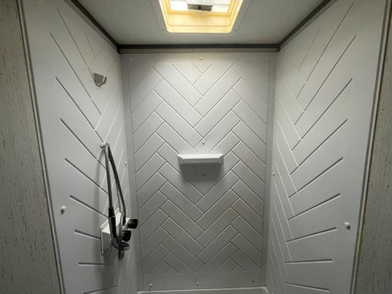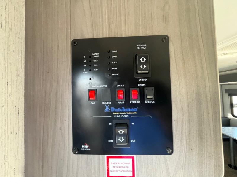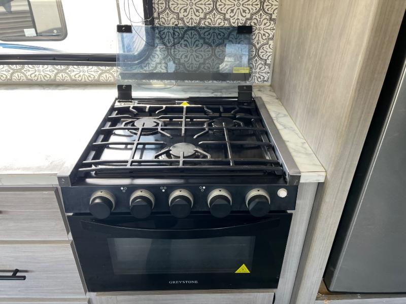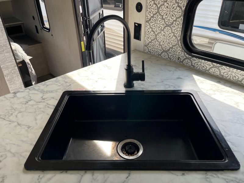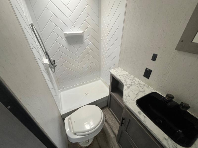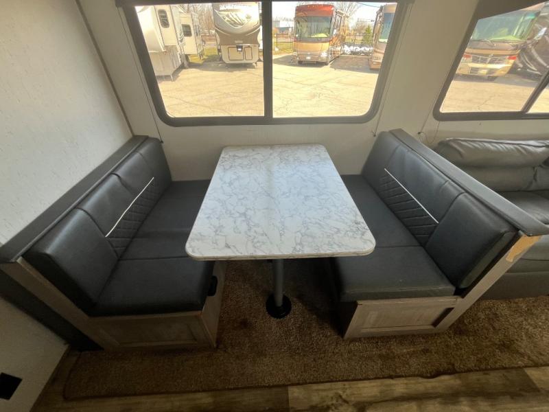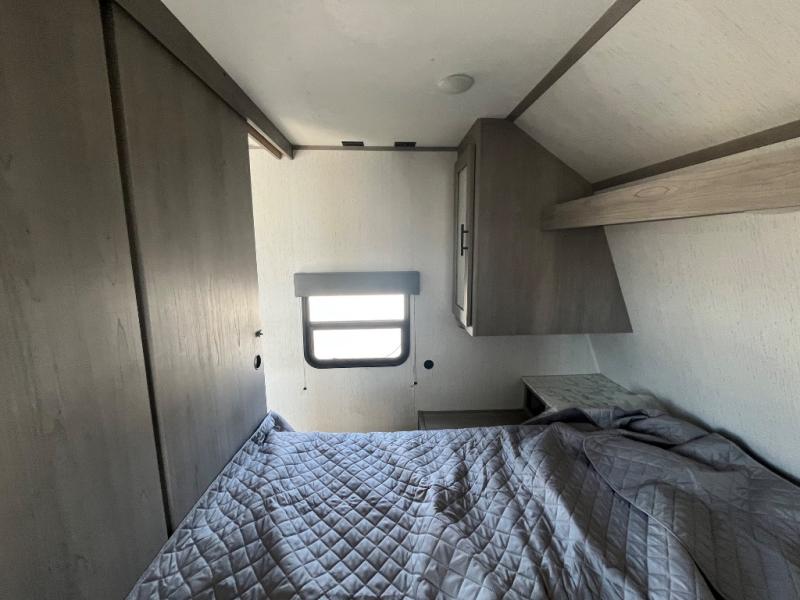 Family fun is found in this spacious travel trailer with double-size bunks, a large slide out, and a private bedroom up front! You can relax on the sofa or play a card game at the booth dinette, or you can visit outdoors under the 14' power awning with LED lights. The cooktop and oven will be perfect to prepare at-home meals on, and there is plenty of counter space to cut fresh fruits and vegetables. This model includes a full bath for convenience, and you'll love how the shower skylight allows natural light in. The queen bed in the bedroom will make this model feel more like home, and the little ones will love to climb into double-size bunks each night. And don't overlook the pass-through storage for fishing poles and hiking gear!