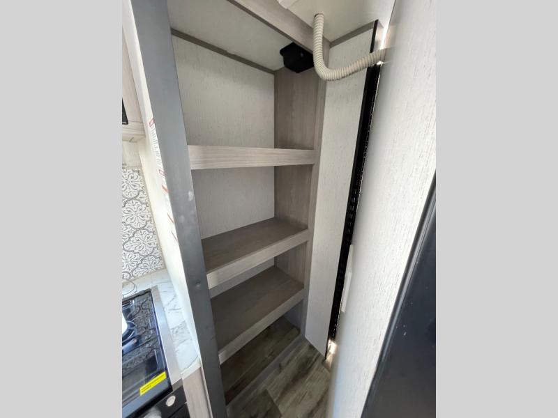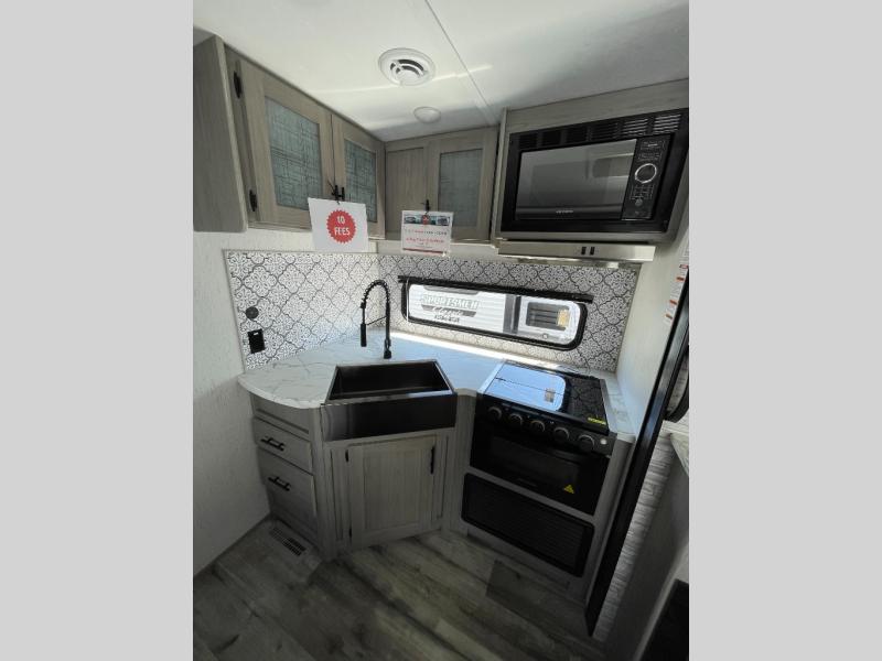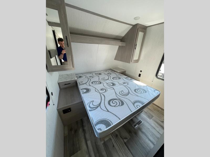 If you enjoy making memories and telling lots of stories, then take this trailer with you on your next trip! You will be able to offer sleeping space for four on the double-size bunks in the rear next to the entry and the full bathroom, plus the conventional U-shaped dinette once easily setup for bedtime gives two more a space to call theirs. Of course, the front bedroom with a queen bed and dual wardrobes will be all yours especially when you want privacy. Everyone can gather around the U-shaped dinette to visit, plan the day's activities, and enjoy the fireplace while the cook makes meals using the kitchen appliances. And don't forget about the outside kitchen when cooking, and the power awning when you want to relax outside.