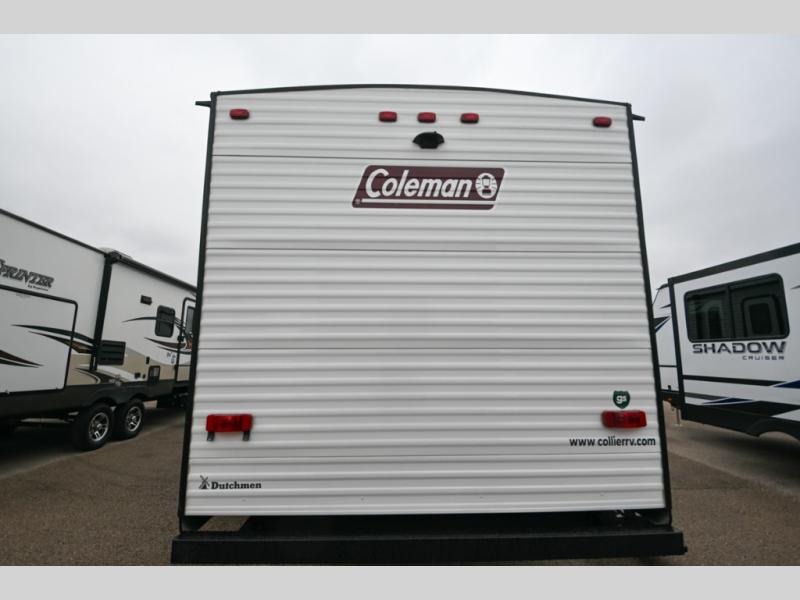With any Coleman Lantern Series travel trailer and toy hauler travel trailer, the interior will impress with upgraded residential grade linoleum and Eyewear luxury furniture for style and durability, the undermounted large kitchen sink with stainless steel high-rise kitchen faucet, and seamless countertops, plus the hard valances in the living room and master bedroom and the AM/FM/CD/AUX/Bluetooth stereo. The Dutchmen construction advantage is included and provides a durable roof structure with a TPO roof, 3/8" decking, fiberglass insulation, and a lauan interior panel, plus an insulated structure with a metal exterior panel, a wood frame with R7 thermal insulation and an lauan interior panel. Also included is the Blade air flow system which helps reduce air turbulence and noise with duct elbows and wyes that feature enlarged inlets. Choose a Coleman Lantern Series because you appreciate quality, value and design when you camp!
