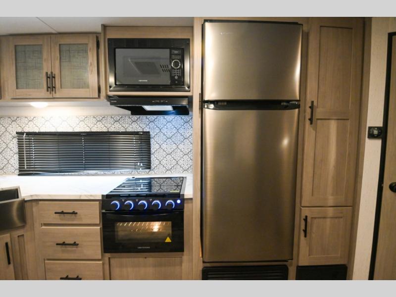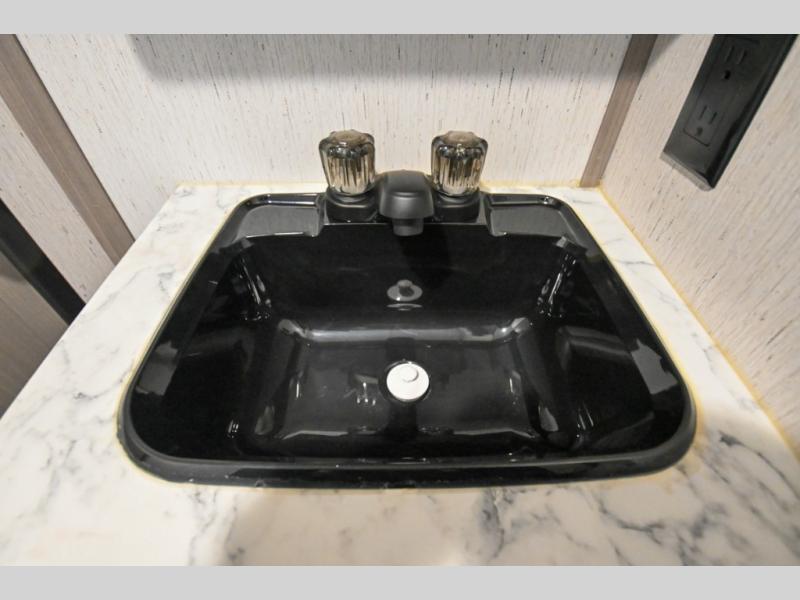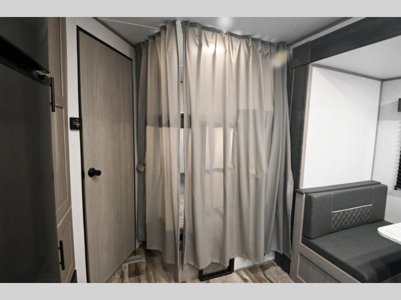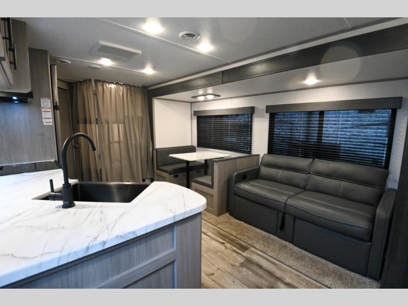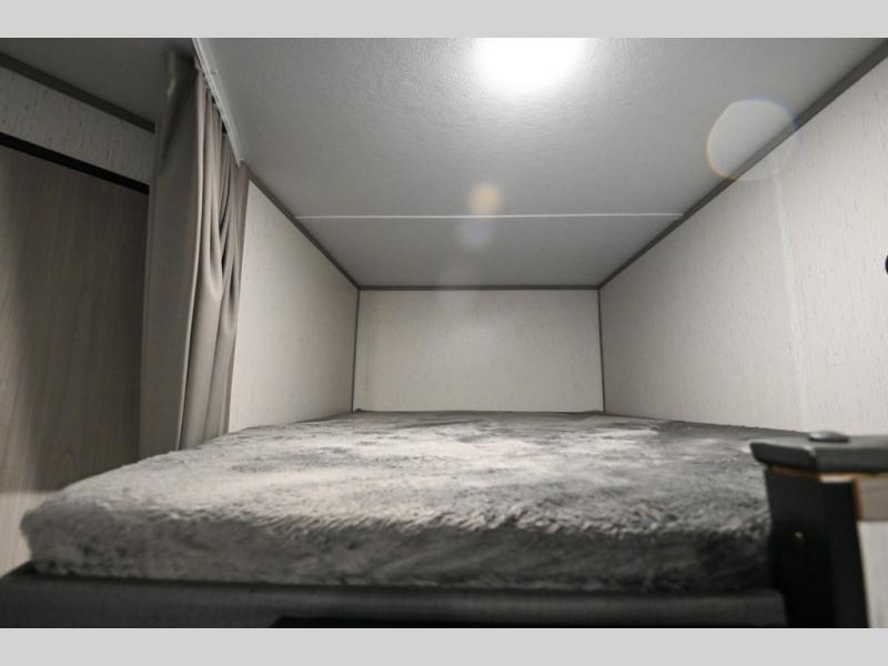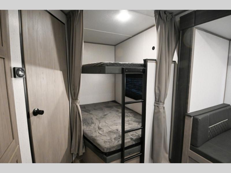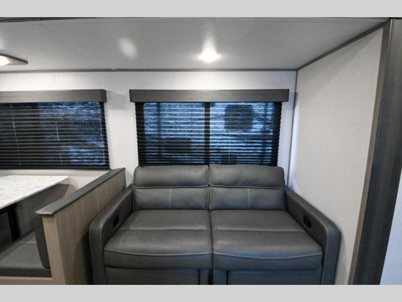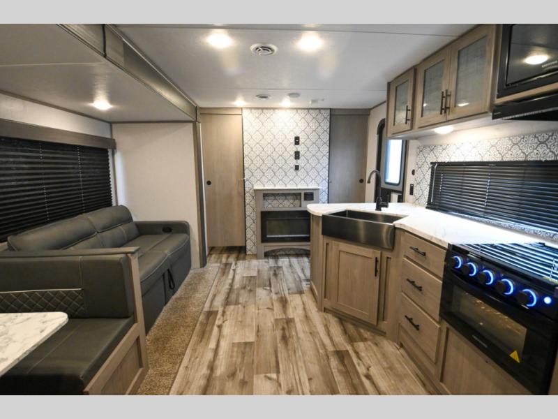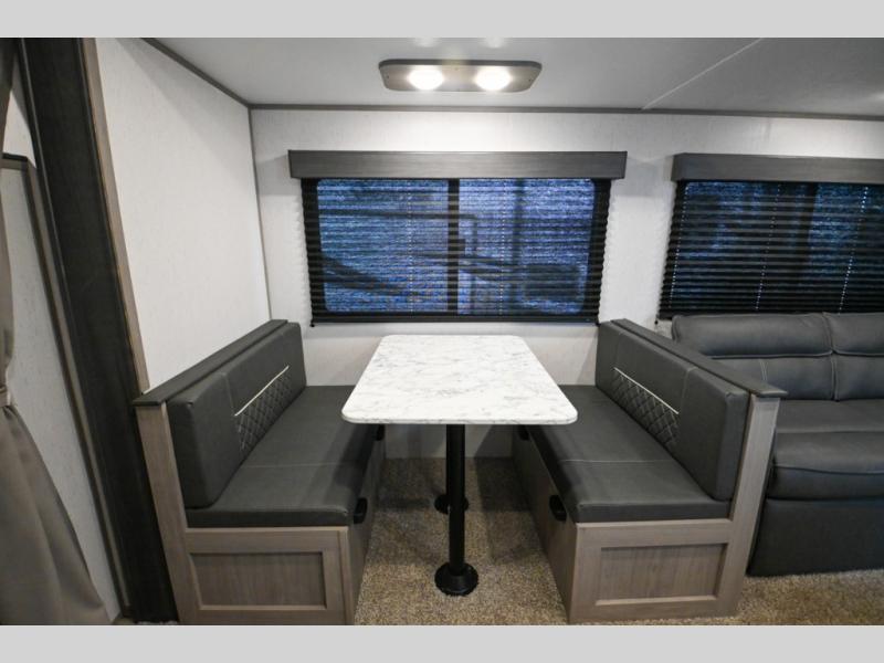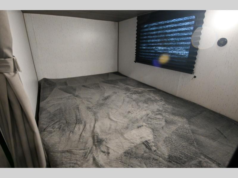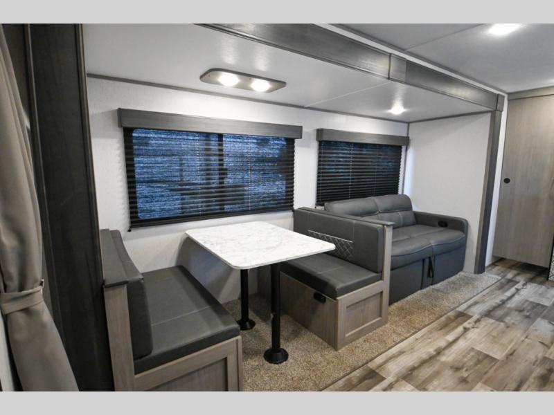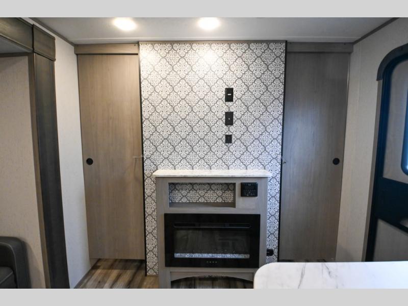 Camp comfortably with your larger group in this trailer that gives you privacy in the front bedroom with a queen bed and dual access, rear double-size bunks next to the full bathroom with the second entry/exit door to the trailer that is super convenient, and a furniture slide that includes a booth dinette and a reclining sofa that some will surely love sleeping on. The main area also includes a fireplace and kitchen appliances including a 10 cu. ft. refrigerator, a farm style sink with high rise faucet, and storage. There is more storage found outside in the pass-through compartment allowing you to take along the larger camping items like camp chairs and tables, charcoal and even fishing poles.