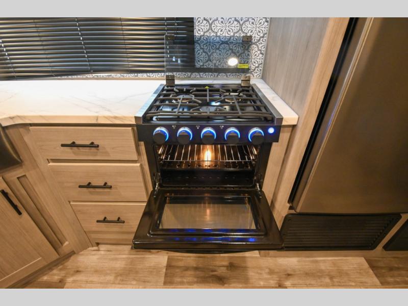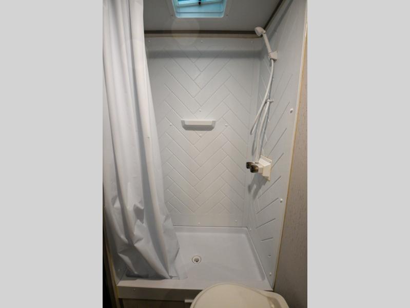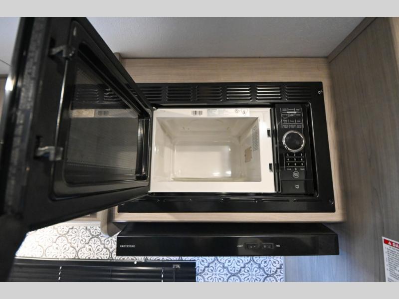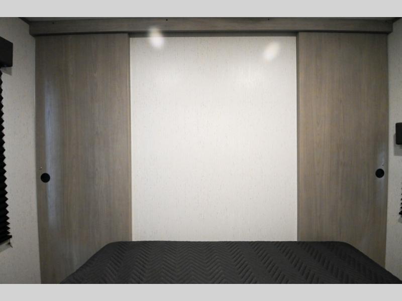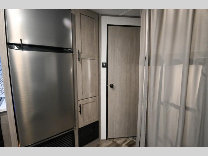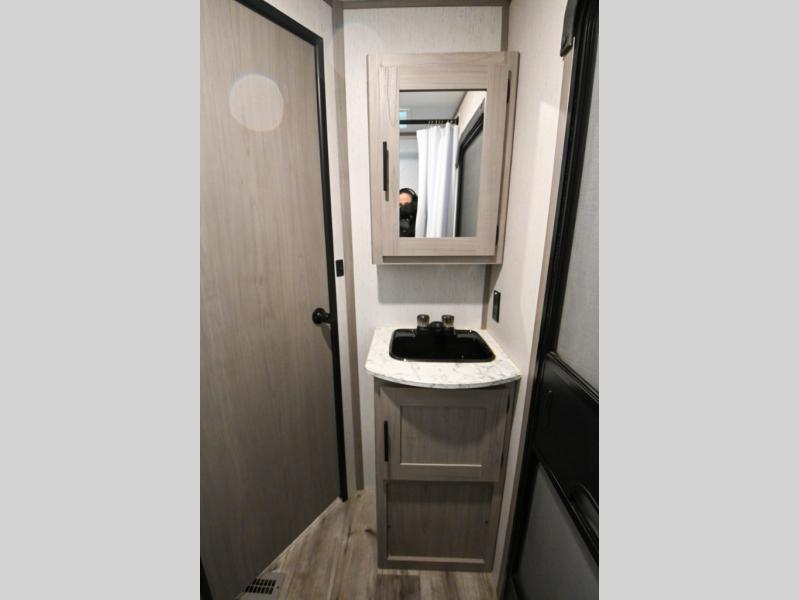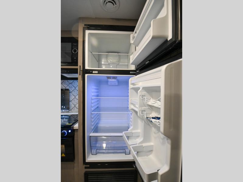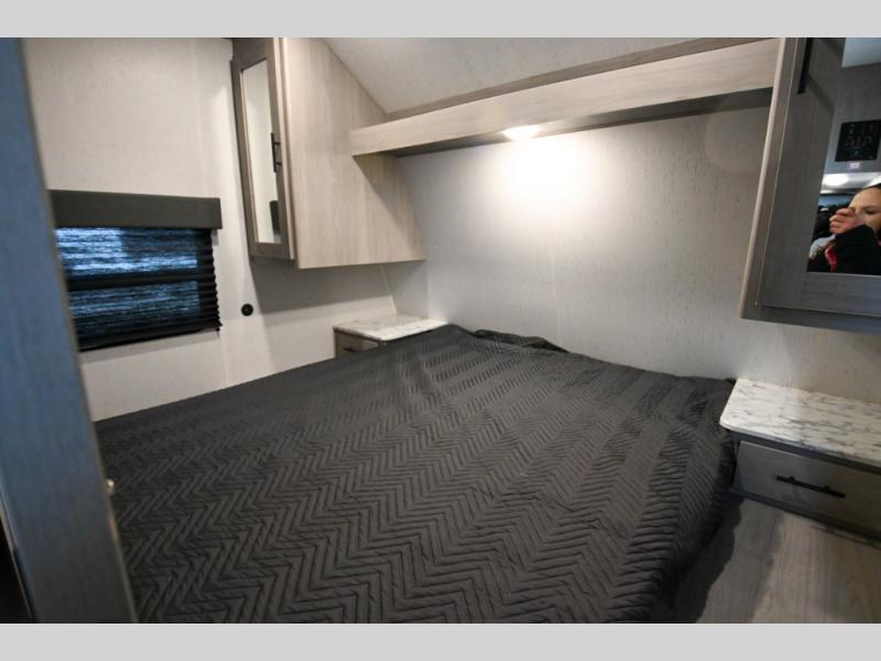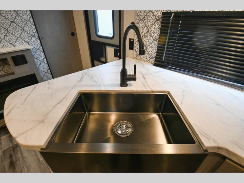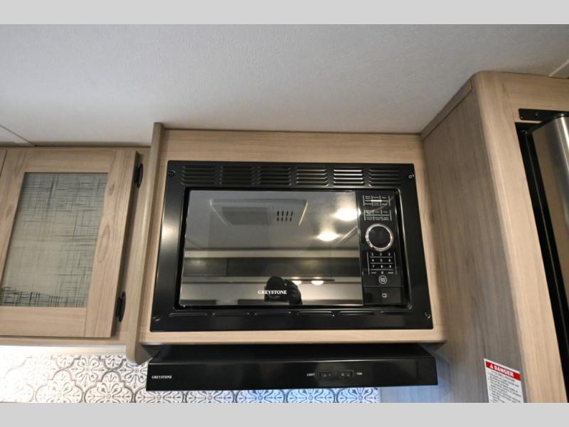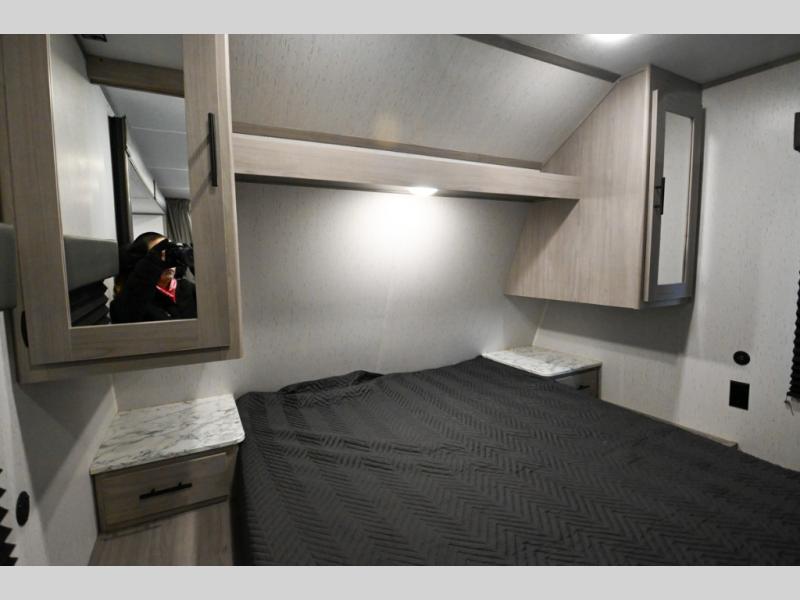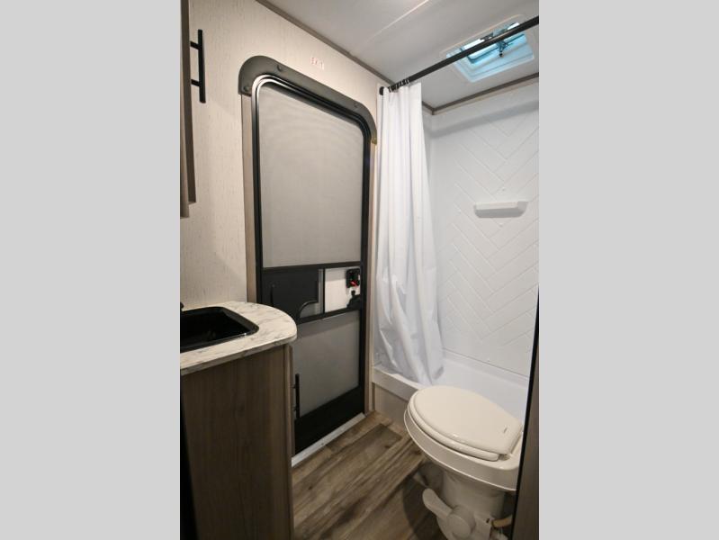 Camp comfortably with your larger group in this trailer that gives you privacy in the front bedroom with a queen bed and dual access, rear double-size bunks next to the full bathroom with the second entry/exit door to the trailer that is super convenient, and a furniture slide that includes a booth dinette and a reclining sofa that some will surely love sleeping on. The main area also includes a fireplace and kitchen appliances including a 10 cu. ft. refrigerator, a farm style sink with high rise faucet, and storage. There is more storage found outside in the pass-through compartment allowing you to take along the larger camping items like camp chairs and tables, charcoal and even fishing poles.