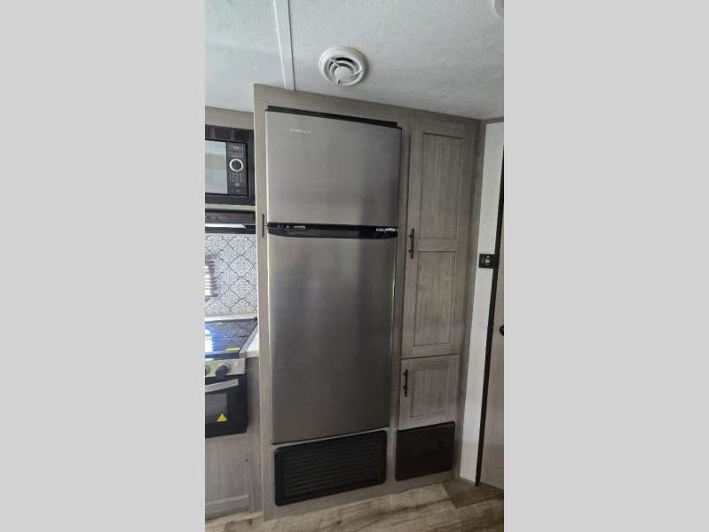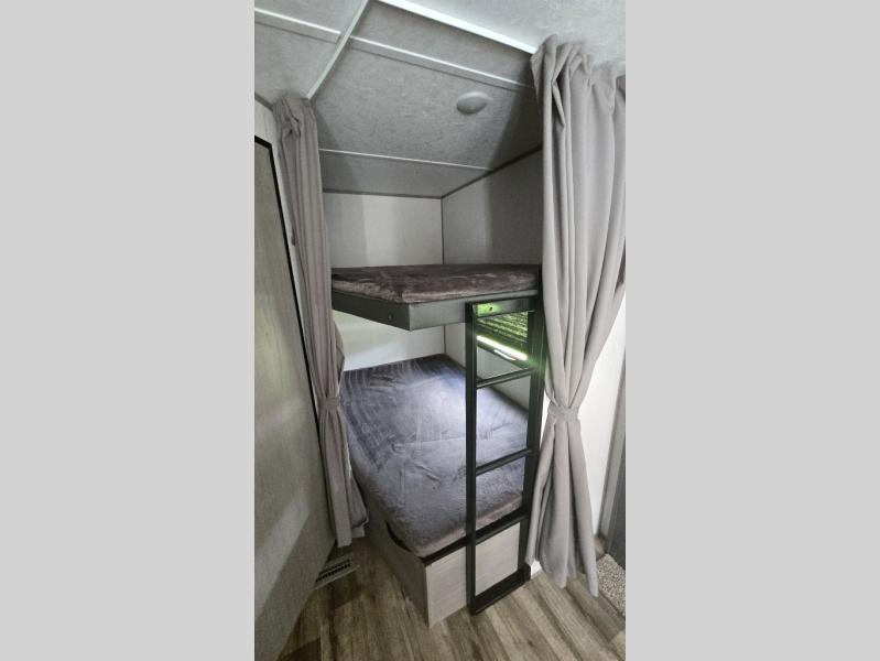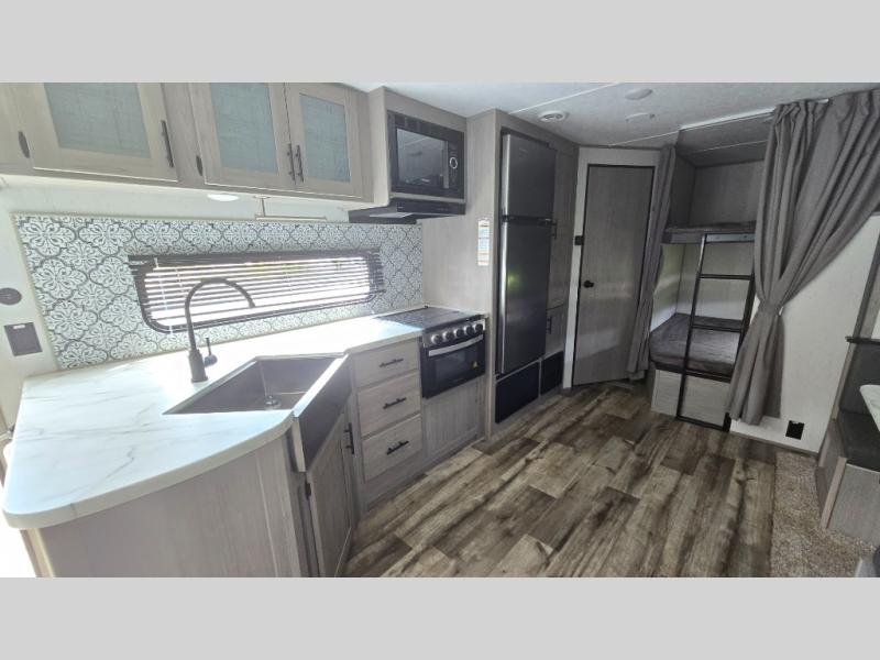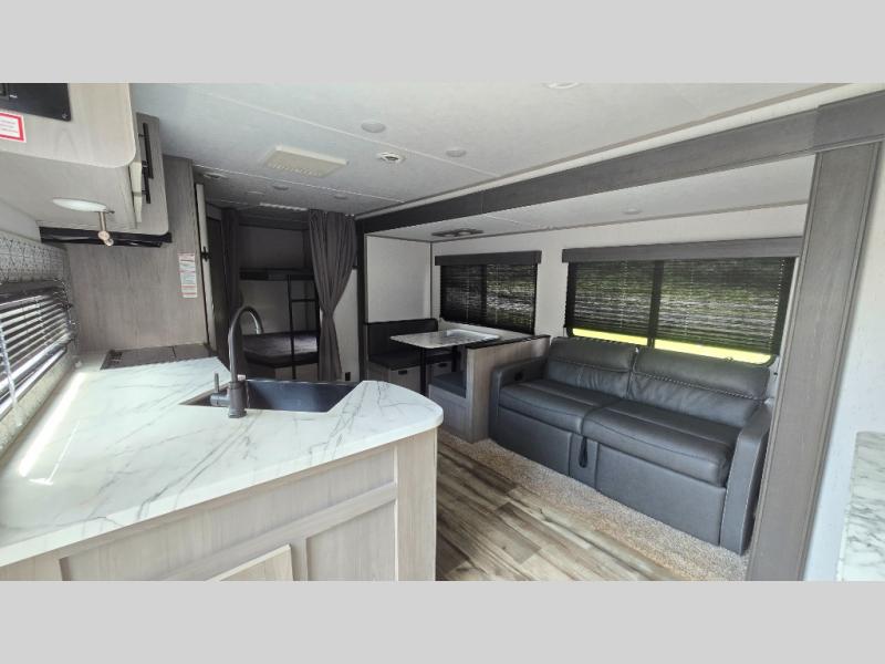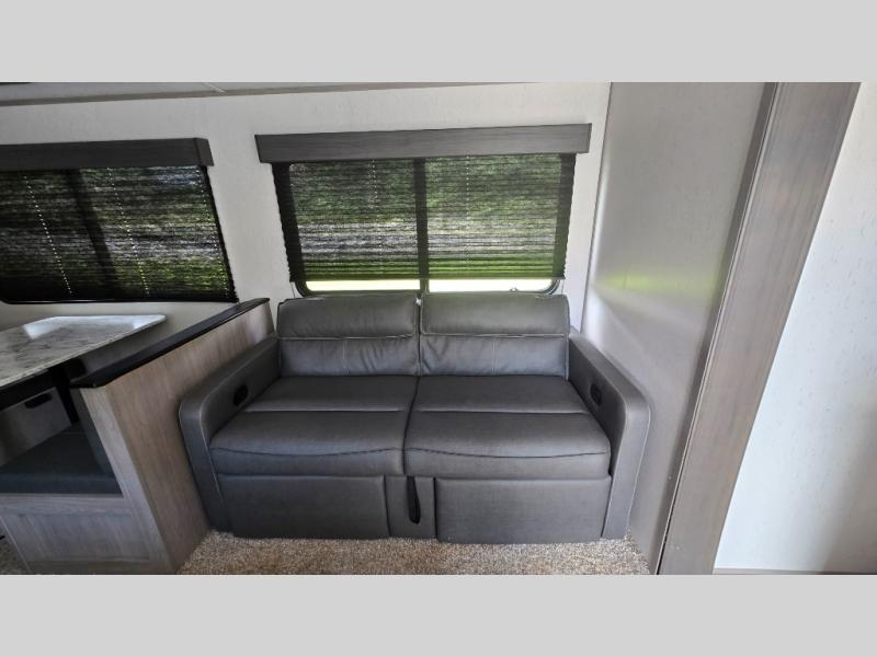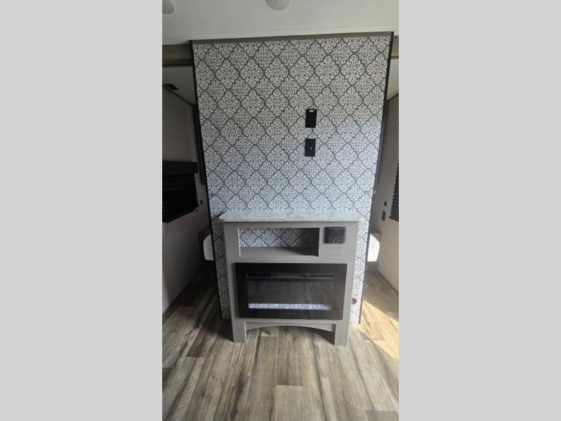 Camp comfortably with your larger group in this trailer that gives you privacy in the front bedroom with a queen bed and dual access, rear double-size bunks next to the full bathroom with the second entry/exit door to the trailer that is super convenient, and a furniture slide that includes a booth dinette and a reclining sofa that some will surely love sleeping on. The main area also includes a fireplace and kitchen appliances including a 10 cu. ft. refrigerator, a farm style sink with high rise faucet, and storage. There is more storage found outside in the pass-through compartment allowing you to take along the larger camping items like camp chairs and tables, charcoal and even fishing poles.