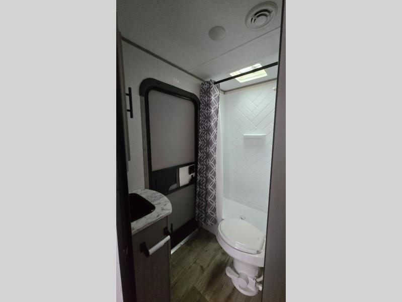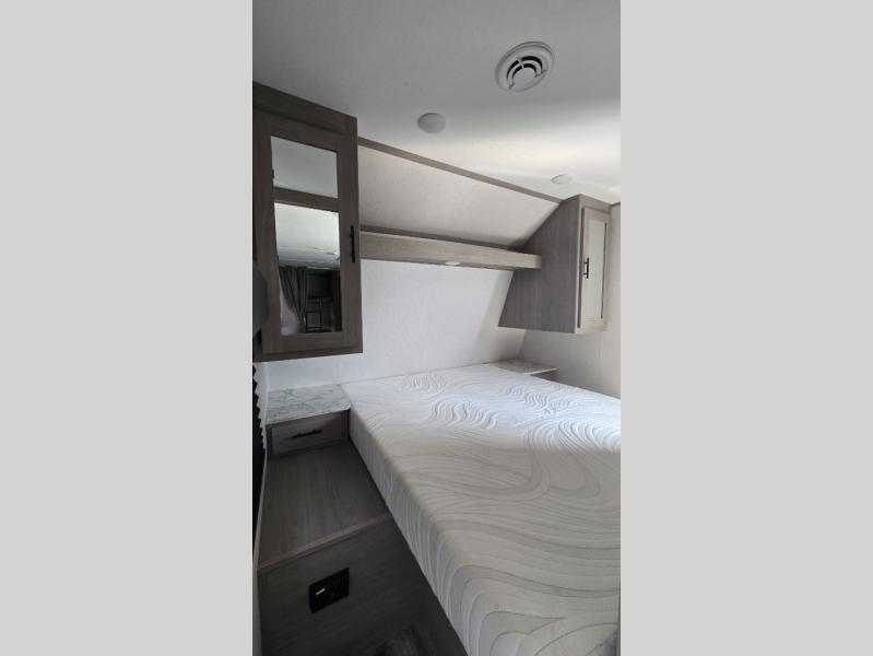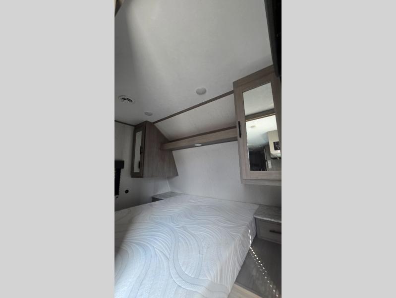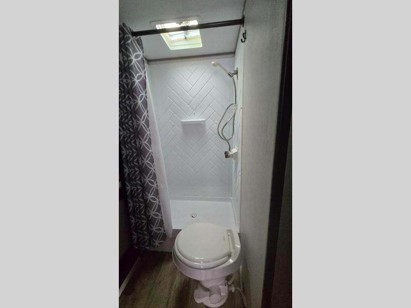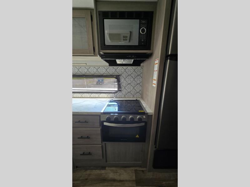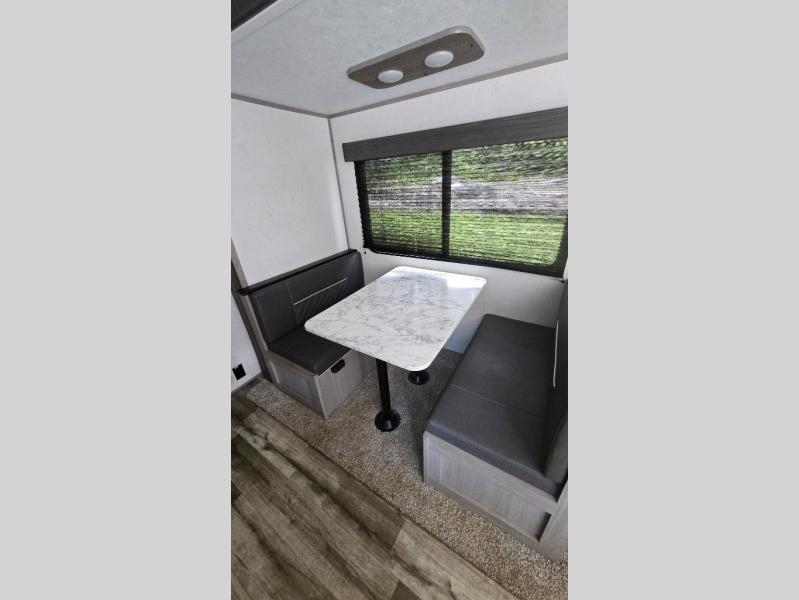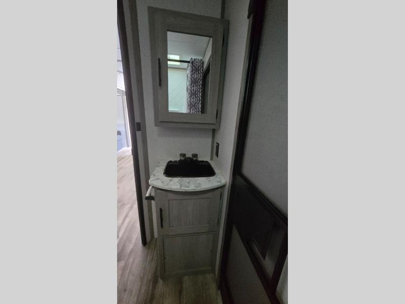 Camp comfortably with your larger group in this trailer that gives you privacy in the front bedroom with a queen bed and dual access, rear double-size bunks next to the full bathroom with the second entry/exit door to the trailer that is super convenient, and a furniture slide that includes a booth dinette and a reclining sofa that some will surely love sleeping on. The main area also includes a fireplace and kitchen appliances including a 10 cu. ft. refrigerator, a farm style sink with high rise faucet, and storage. There is more storage found outside in the pass-through compartment allowing you to take along the larger camping items like camp chairs and tables, charcoal and even fishing poles.