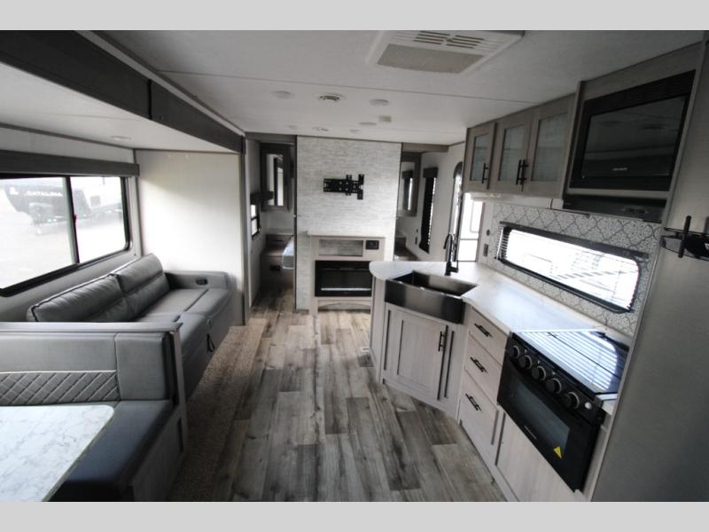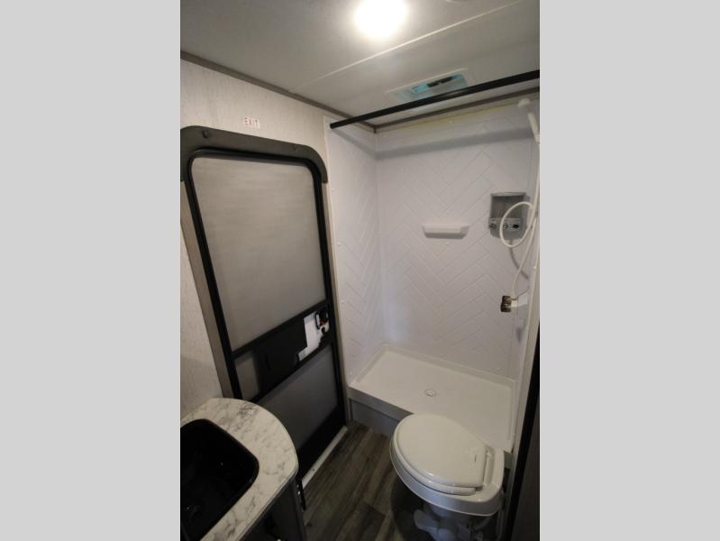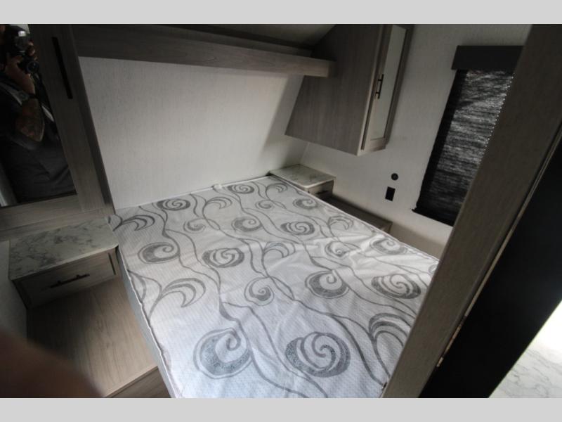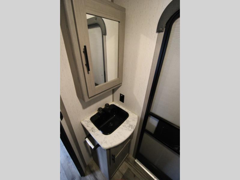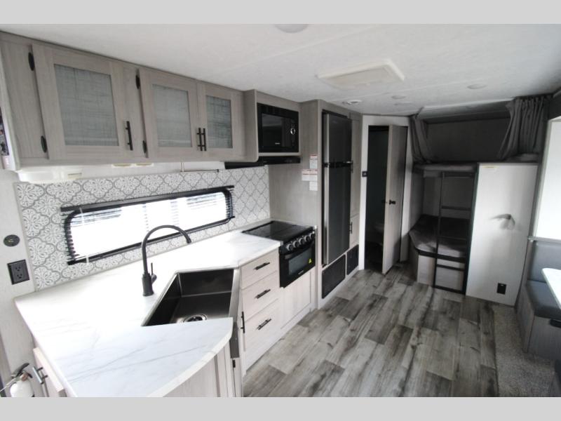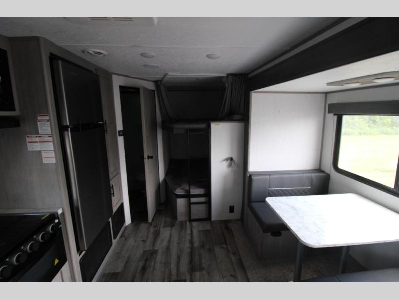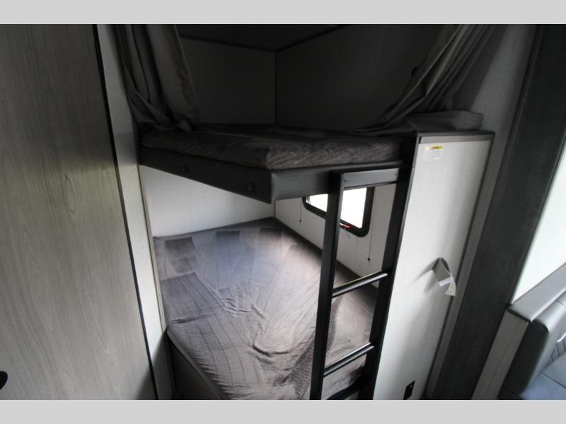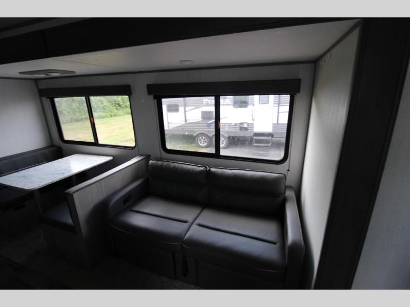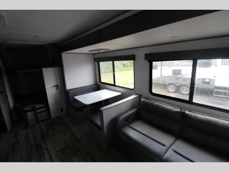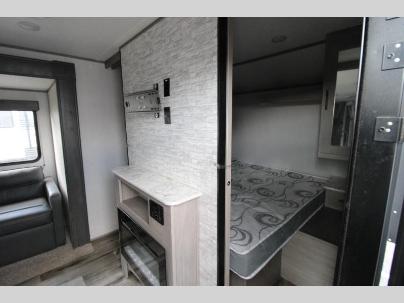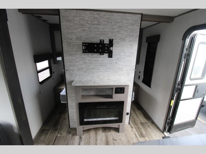 Camp comfortably with your larger group in this trailer that gives you privacy in the front bedroom with a queen bed and dual access, rear double-size bunks next to the full bathroom with the second entry/exit door to the trailer that is super convenient, and a furniture slide that includes a booth dinette and a reclining sofa that some will surely love sleeping on. The main area also includes a fireplace and kitchen appliances including a 10 cu. ft. refrigerator, a farm style sink with high rise faucet, and storage. There is more storage found outside in the pass-through compartment allowing you to take along the larger camping items like camp chairs and tables, charcoal and even fishing poles.