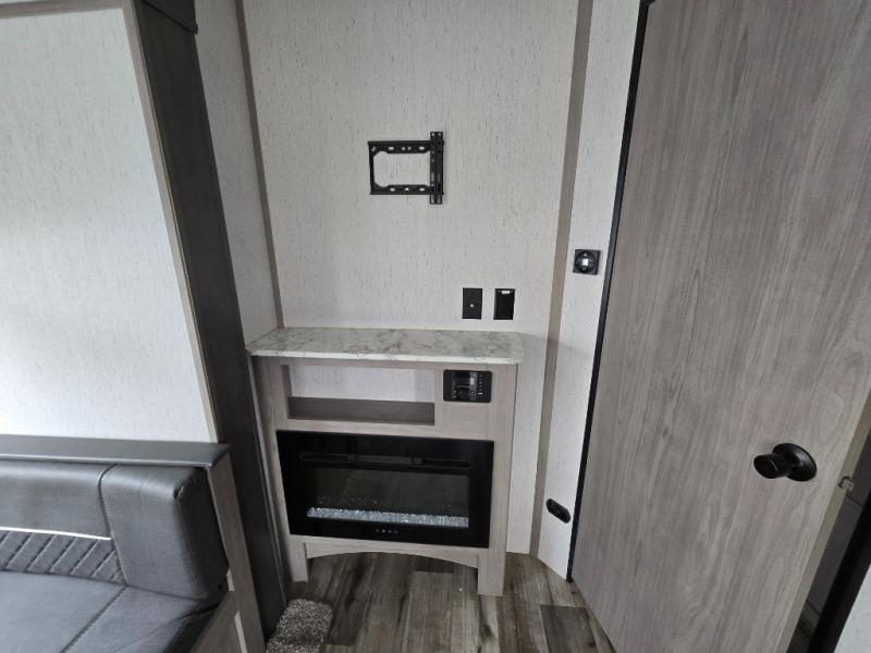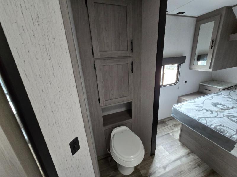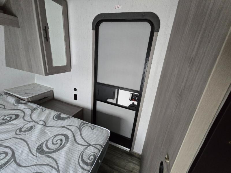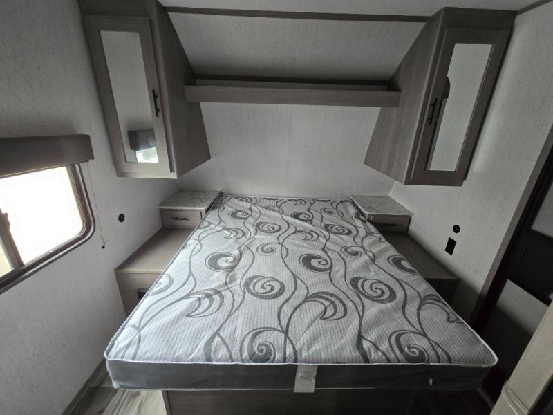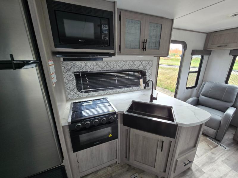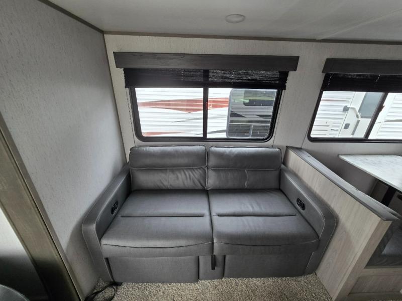 Relax and unwind inside this trailer after a fun day outdoors exploring! You and your person can sit in the swivel rockers as you enter the trailer or make a meal using the kitchen appliances and farm style sink with high rise faucet. Dine inside at the booth dinette or while in the reclining sofa, or eat outside while under the 16' power awning. Your camping chairs can be taken from the front pass-through compartment to help create an outdoor living area under the awning. If you need a restroom break, you can enter the second entry/exit for the trailer into the front bedroom to reach the walk-through bathroom. And the bedroom provides a queen bed, clothing storage and privacy at night.