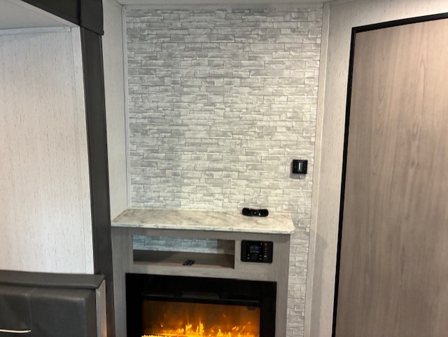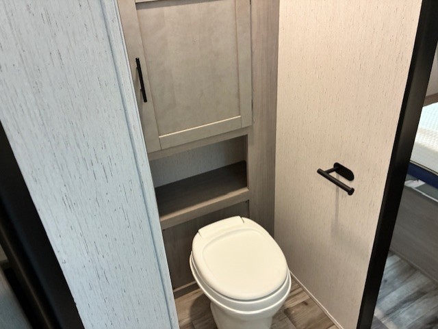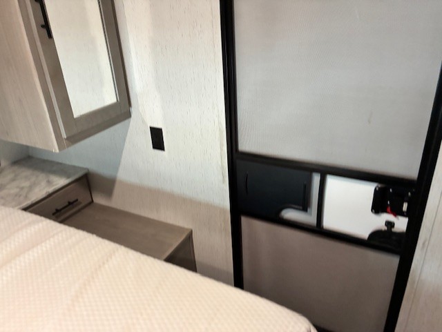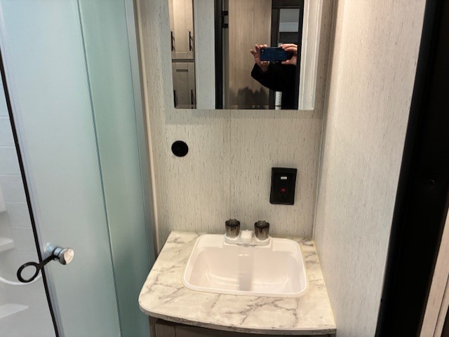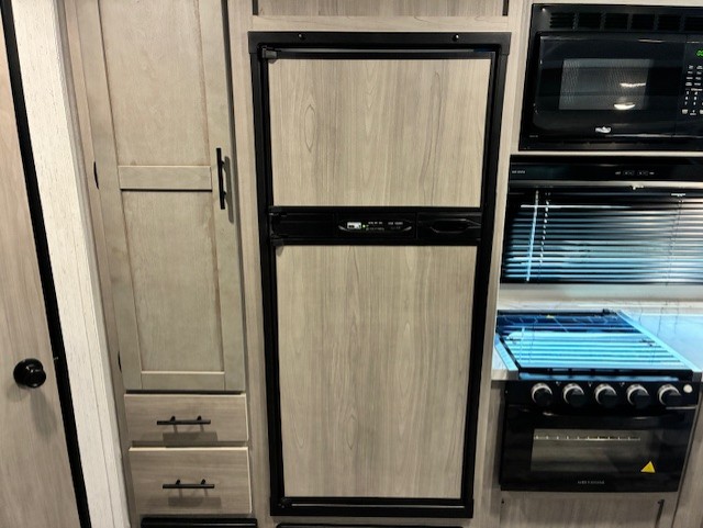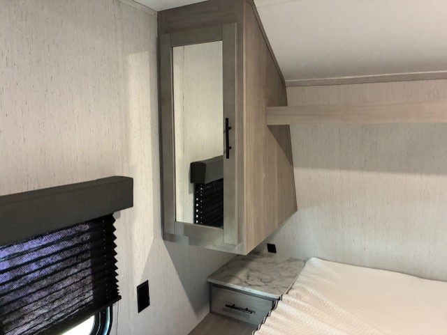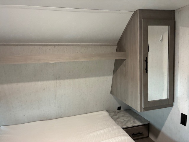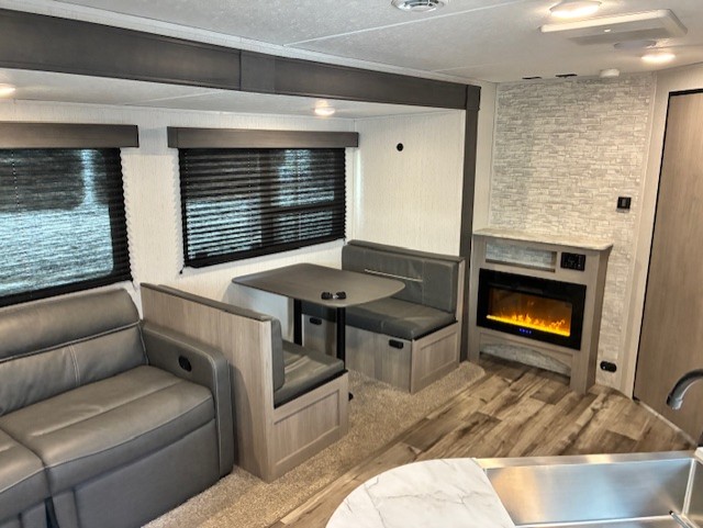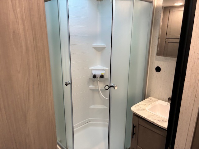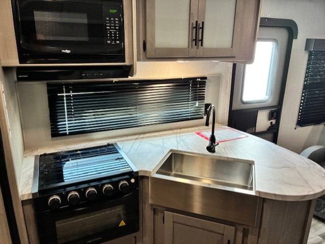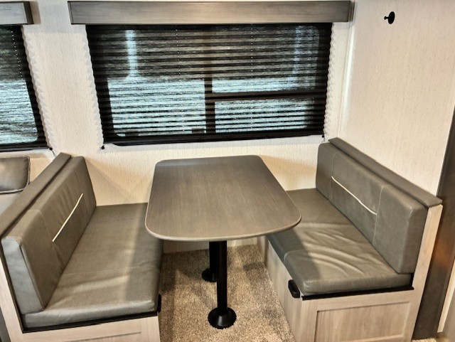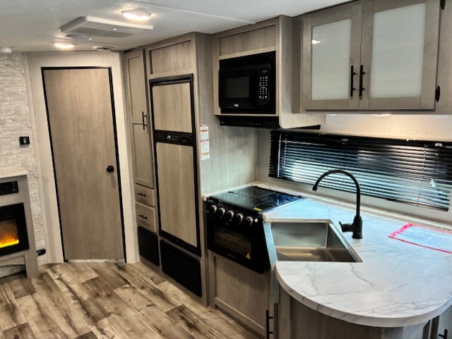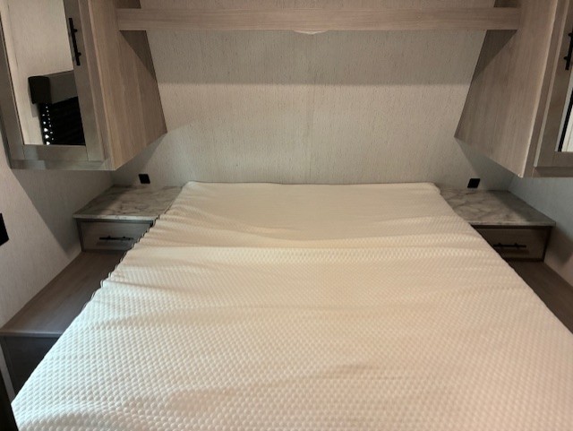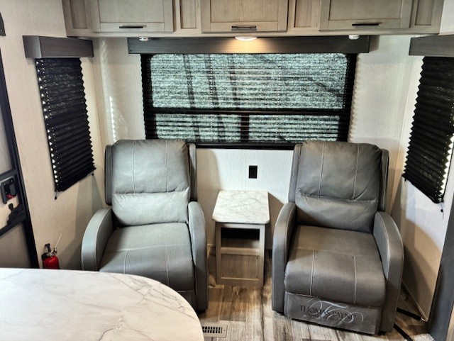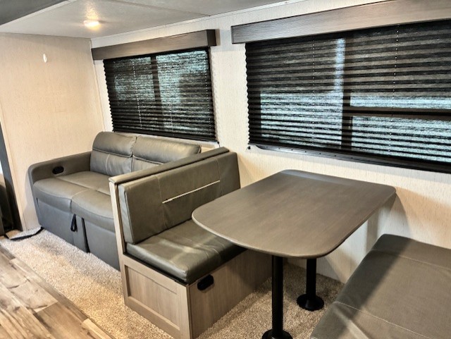 Relax and unwind inside this trailer after a fun day outdoors exploring! You and your person can sit in the swivel rockers as you enter the trailer or make a meal using the kitchen appliances and farm style sink with high rise faucet. Dine inside at the booth dinette or while in the reclining sofa, or eat outside while under the 16' power awning. Your camping chairs can be taken from the front pass-through compartment to help create an outdoor living area under the awning. If you need a restroom break, you can enter the second entry/exit for the trailer into the front bedroom to reach the walk-through bathroom. And the bedroom provides a queen bed, clothing storage and privacy at night.