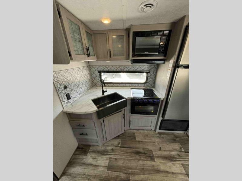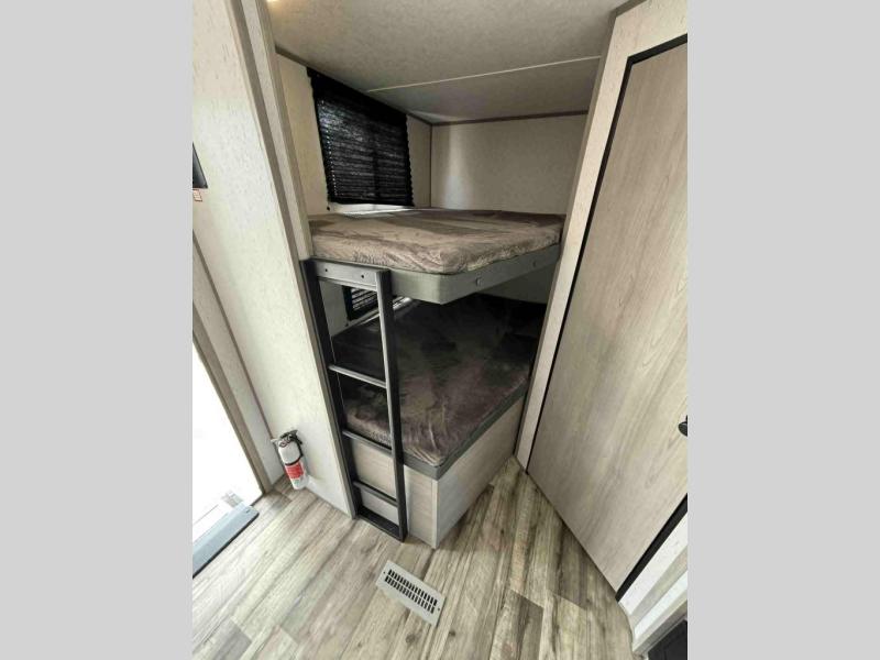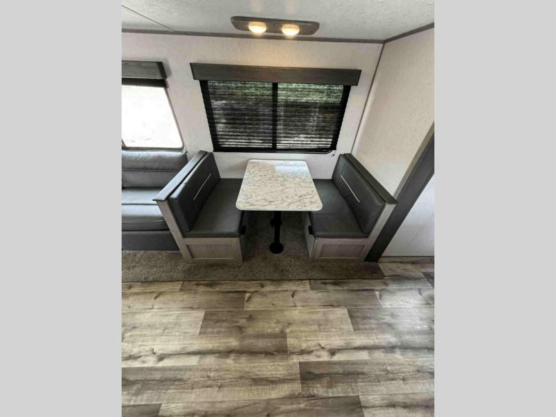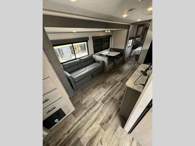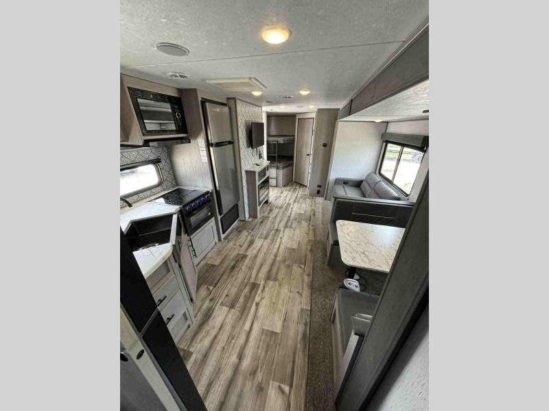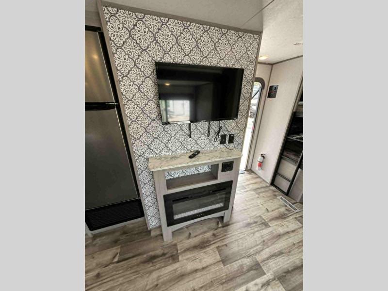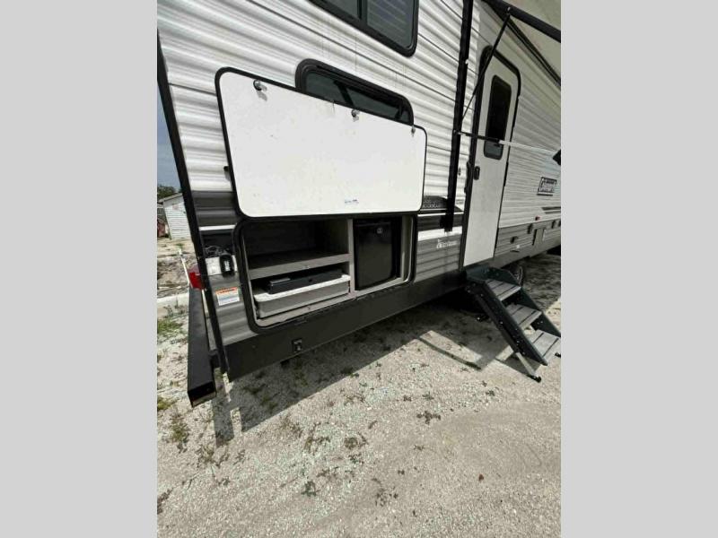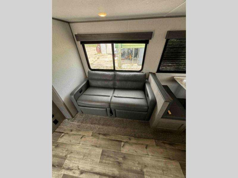 Looking for adventure and new scenery and want conveniences of home in a trailer for when you are ready to relax? Well this trailer allows you to make meals indoors with the kitchen appliances and outdoors on the outside kitchen, to relax on your own reclining sofa or at the booth dinette, and to get clean up in your own full bathroom. And the dual entry doors allow you access to the main area and the double-size bunk beds as well as the front bedroom. The cook will enjoy having a farm style sink with high rise faucet, and an L-shaped counter top to prepare and serve meals as well as a 10 cu. ft. refrigerator to store leftovers. And when you all are ready for bed, four can claim the double-size bunks, two can enjoy privacy in the bedroom on a queen bed, and some will enjoy staying in the main area to sleep on the furniture. There are many more features to enjoy such as the power tongue jack when setting up, the outside shower when your shoes are too dirty to bring inside, and the USB ports when you cellphone battery is low.