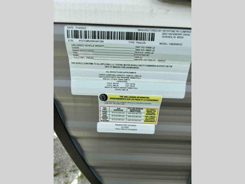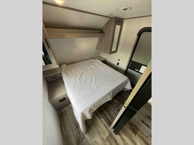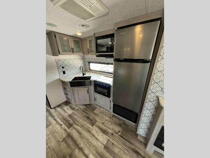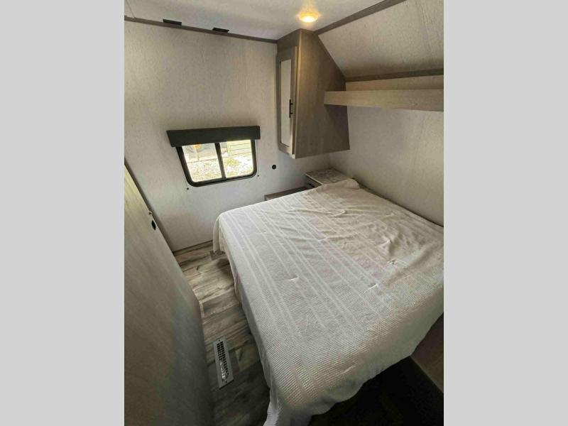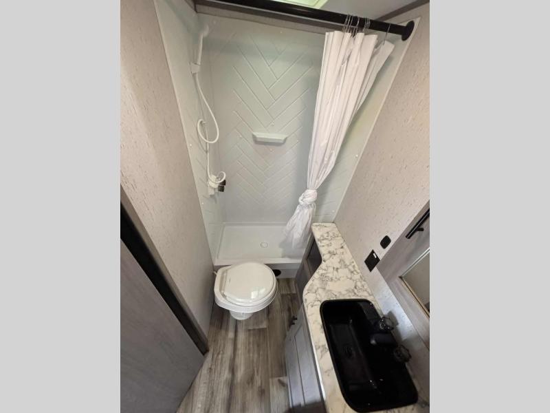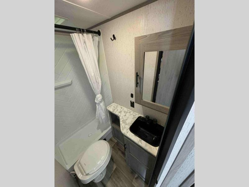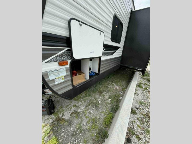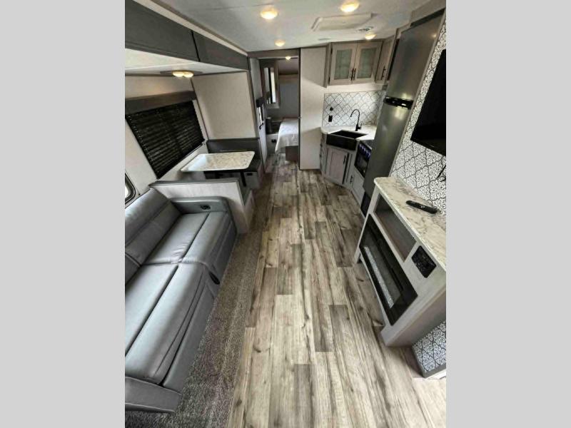 Looking for adventure and new scenery and want conveniences of home in a trailer for when you are ready to relax? Well this trailer allows you to make meals indoors with the kitchen appliances and outdoors on the outside kitchen, to relax on your own reclining sofa or at the booth dinette, and to get clean up in your own full bathroom. And the dual entry doors allow you access to the main area and the double-size bunk beds as well as the front bedroom. The cook will enjoy having a farm style sink with high rise faucet, and an L-shaped counter top to prepare and serve meals as well as a 10 cu. ft. refrigerator to store leftovers. And when you all are ready for bed, four can claim the double-size bunks, two can enjoy privacy in the bedroom on a queen bed, and some will enjoy staying in the main area to sleep on the furniture. There are many more features to enjoy such as the power tongue jack when setting up, the outside shower when your shoes are too dirty to bring inside, and the USB ports when you cellphone battery is low.