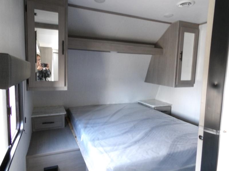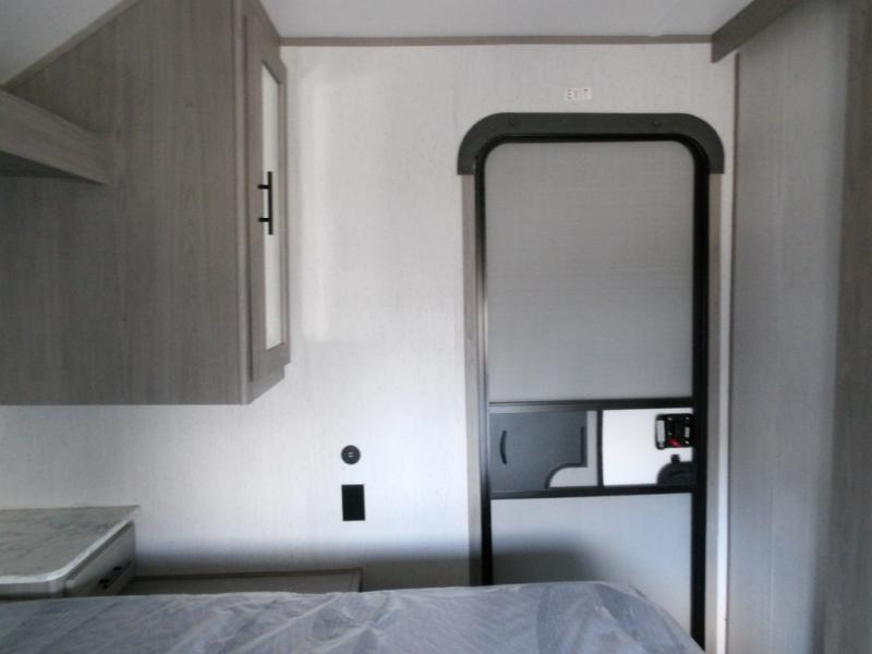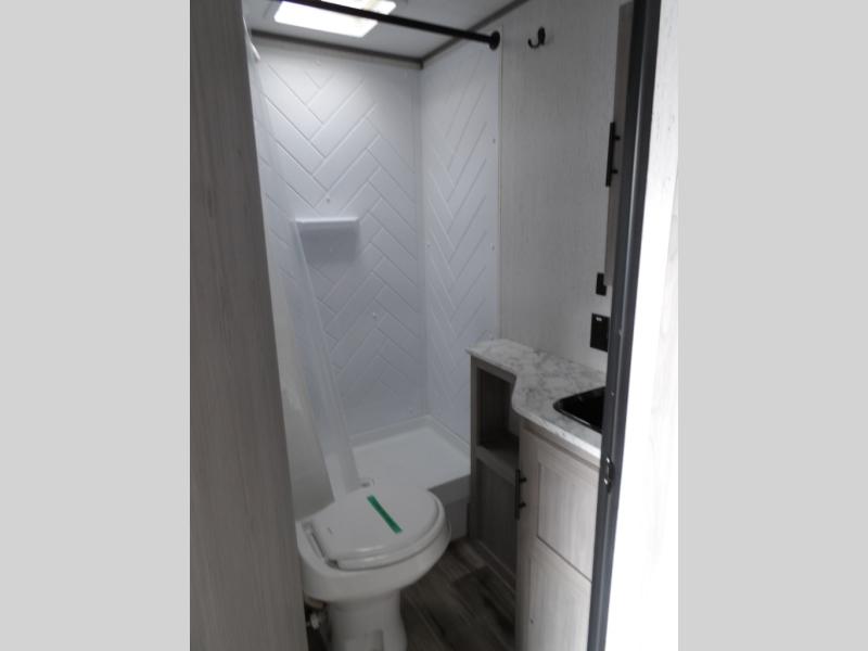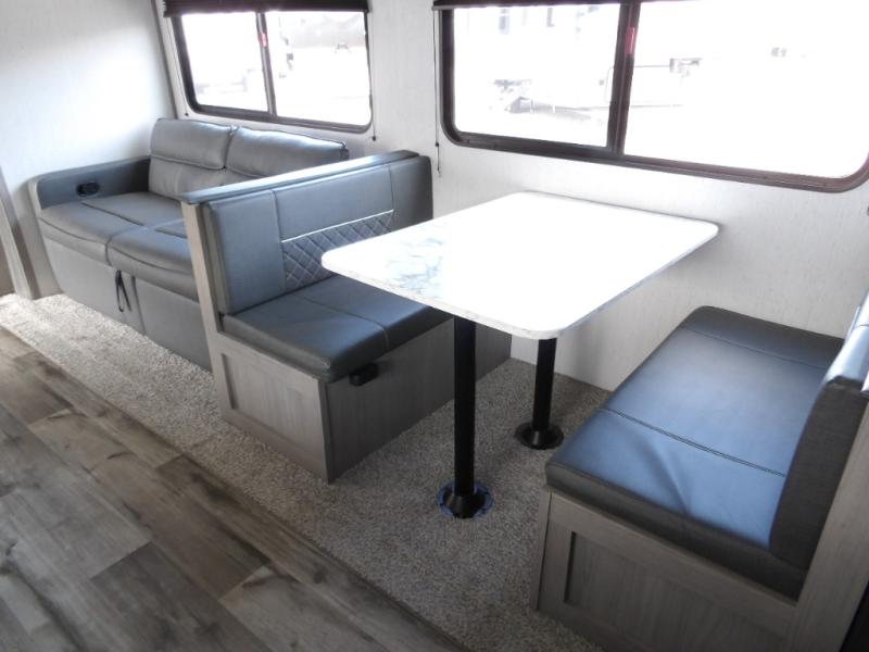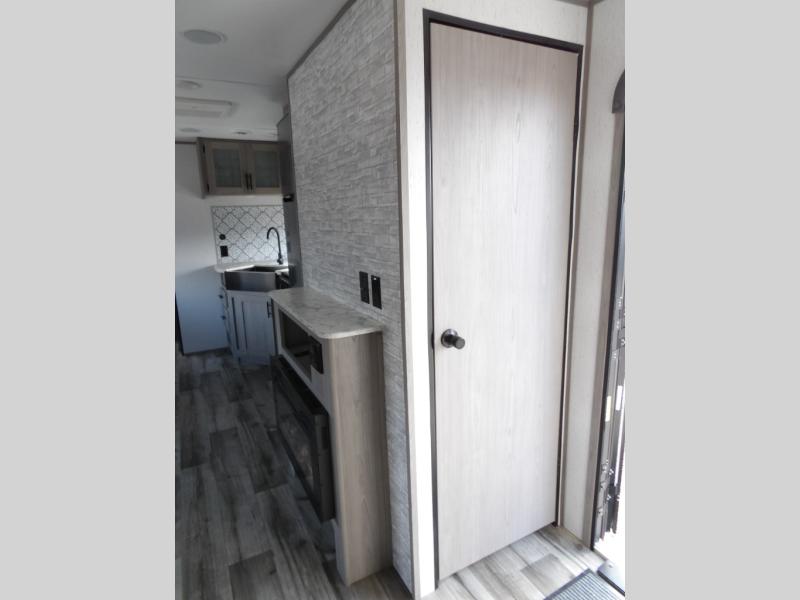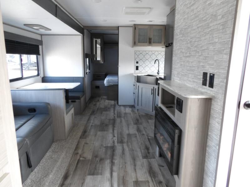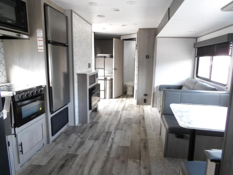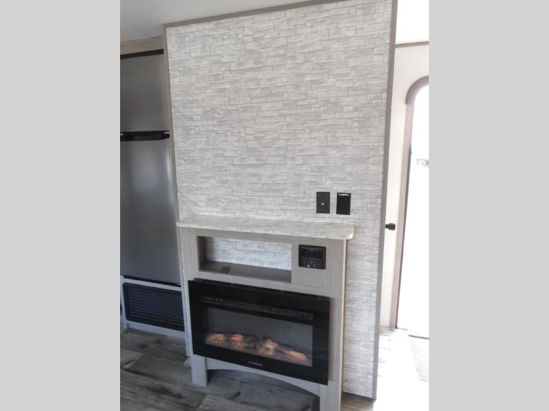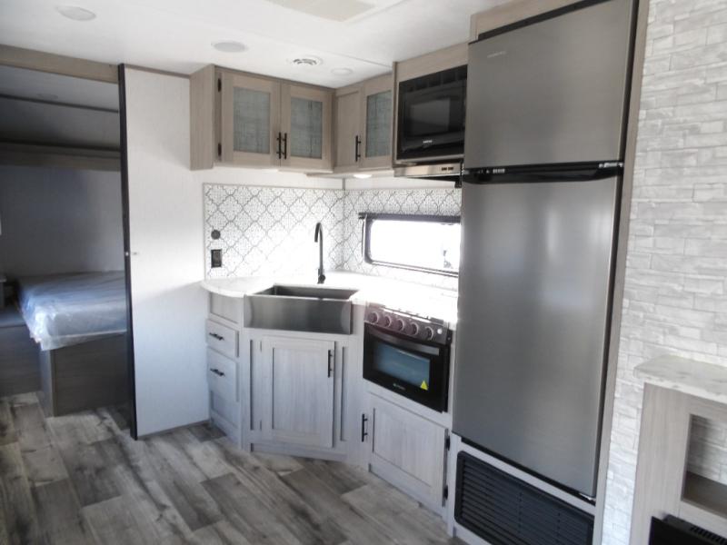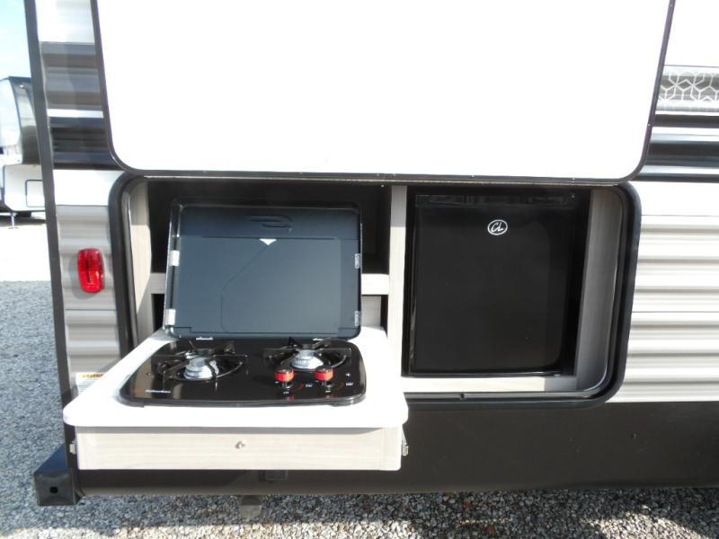 Looking for adventure and new scenery and want conveniences of home in a trailer for when you are ready to relax? Well this trailer allows you to make meals indoors with the kitchen appliances and outdoors on the outside kitchen, to relax on your own reclining sofa or at the booth dinette, and to get clean up in your own full bathroom. And the dual entry doors allow you access to the main area and the double-size bunk beds as well as the front bedroom. The cook will enjoy having a farm style sink with high rise faucet, and an L-shaped counter top to prepare and serve meals as well as a 10 cu. ft. refrigerator to store leftovers. And when you all are ready for bed, four can claim the double-size bunks, two can enjoy privacy in the bedroom on a queen bed, and some will enjoy staying in the main area to sleep on the furniture. There are many more features to enjoy such as the power tongue jack when setting up, the outside shower when your shoes are too dirty to bring inside, and the USB ports when you cellphone battery is low.