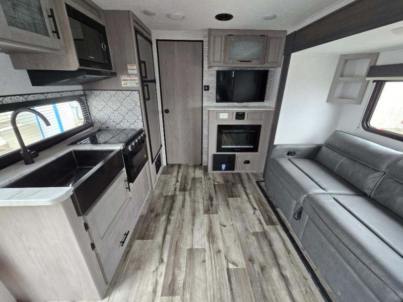 The Dutchmen Coleman Light travel trailer features an upgraded kitchen package with residential appliances, high-rise faucets, and a stainless steel farm-style sink. The fully enclosed underbelly allows all of your trailer's vital functions to be kept out of the freezing cold, and you'll have great stability as you enter your trailer by using the solid entry steps. Each model includes power stabilizer jacks, a power tongue jack, dual 20-LB propane tanks, a residential queen bed, and preparations for Wi-Fi 4G LTE. There is an aerodynamic front fiberglass cap, exterior speakers, solar charging connection, and aluminum wheels.