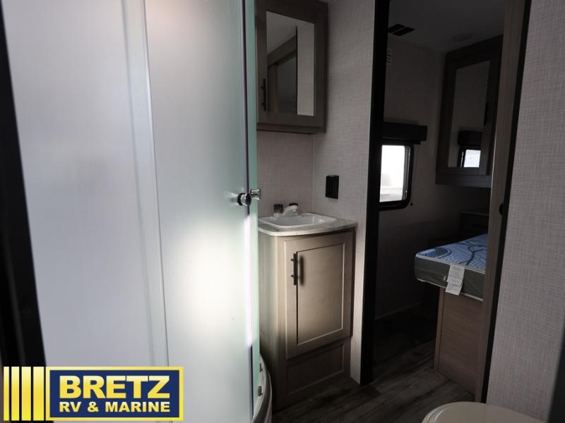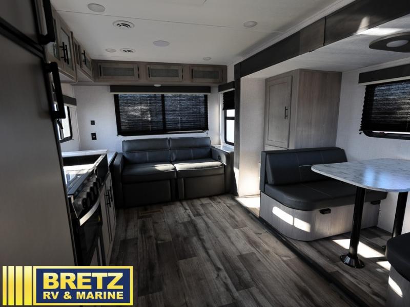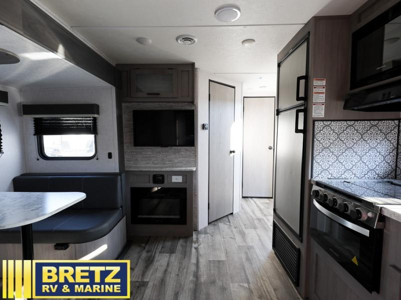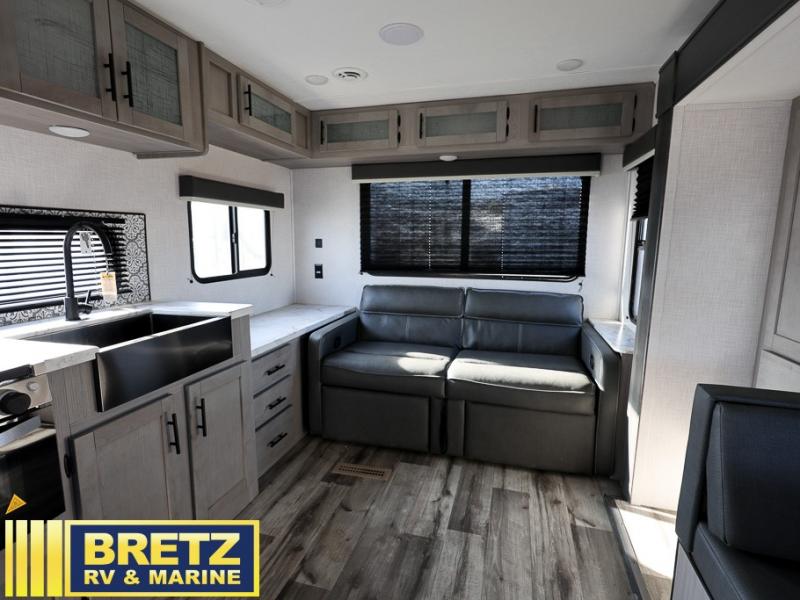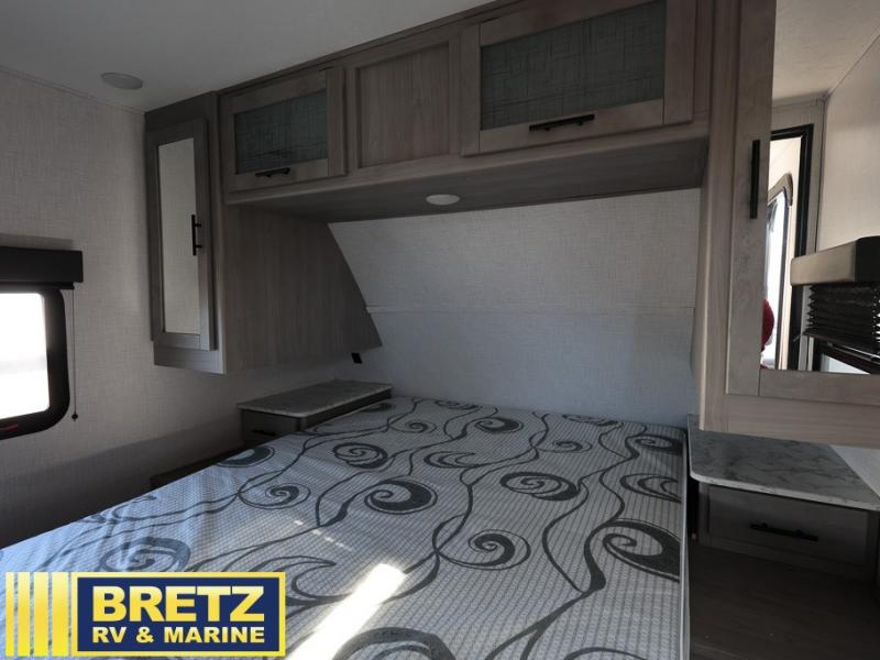 The Dutchmen Coleman Light travel trailer features an upgraded kitchen package with residential appliances, high-rise faucets, and a stainless steel farm-style sink. The fully enclosed underbelly allows all of your trailer's vital functions to be kept out of the freezing cold, and you'll have great stability as you enter your trailer by using the solid entry steps. Each model includes power stabilizer jacks, a power tongue jack, dual 20-LB propane tanks, a residential queen bed, and preparations for Wi-Fi 4G LTE. There is an aerodynamic front fiberglass cap, exterior speakers, solar charging connection, and aluminum wheels.