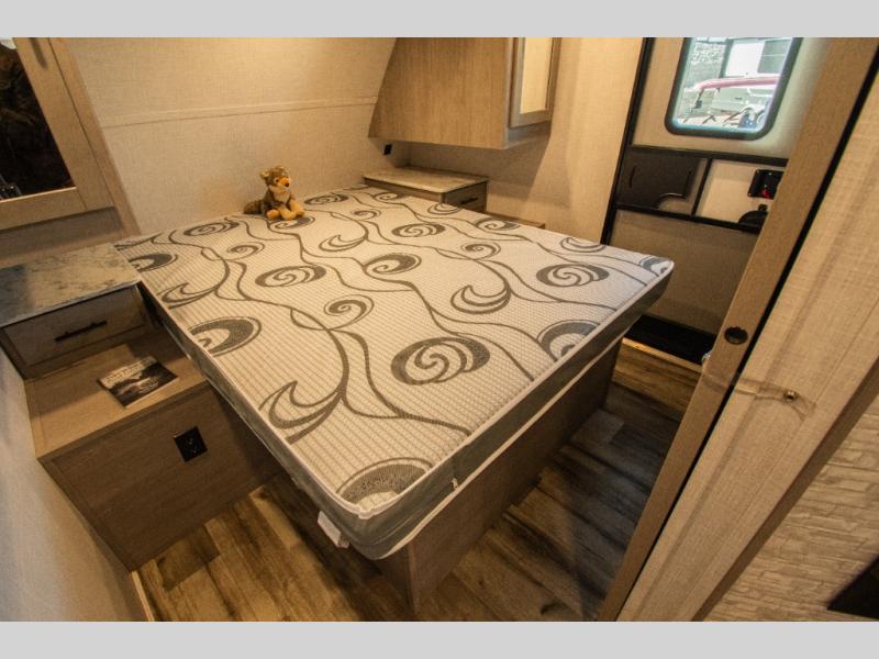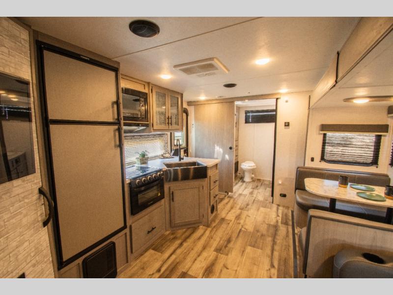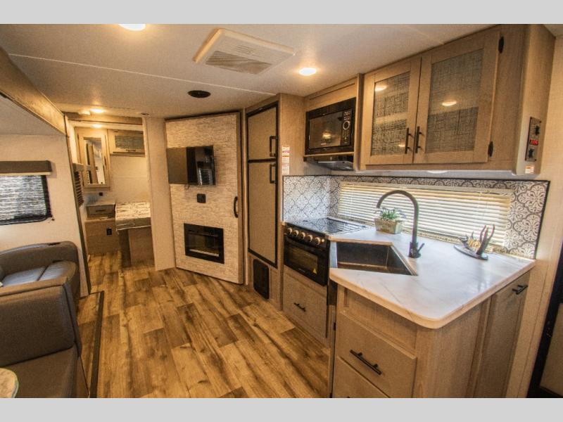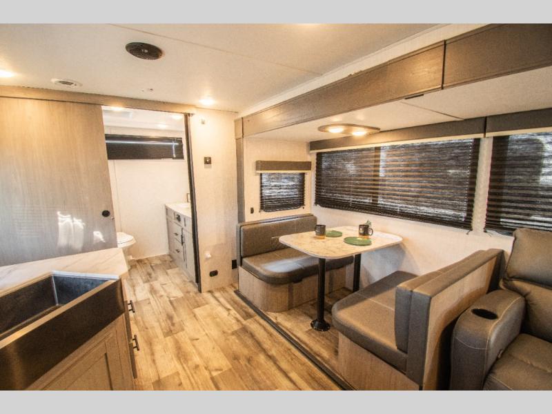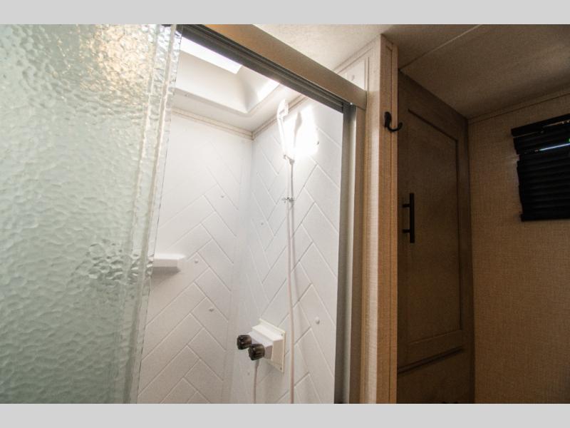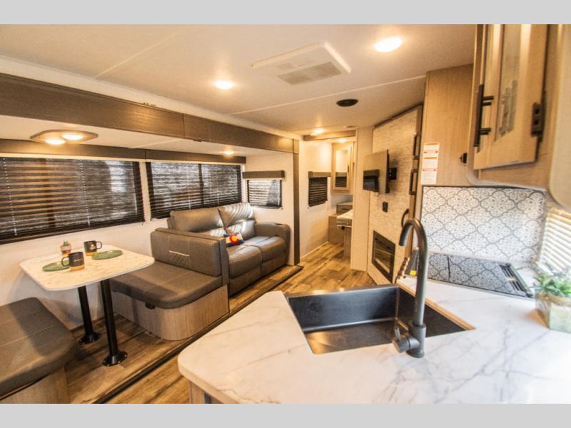 The Dutchmen Coleman Light travel trailer features an upgraded kitchen package with residential appliances, high-rise faucets, and a stainless steel farm-style sink. The fully enclosed underbelly allows all of your trailer's vital functions to be kept out of the freezing cold, and you'll have great stability as you enter your trailer by using the solid entry steps. Each model includes power stabilizer jacks, a power tongue jack, dual 20-LB propane tanks, a residential queen bed, and preparations for Wi-Fi 4G LTE. There is an aerodynamic front fiberglass cap, exterior speakers, solar charging connection, and aluminum wheels.
