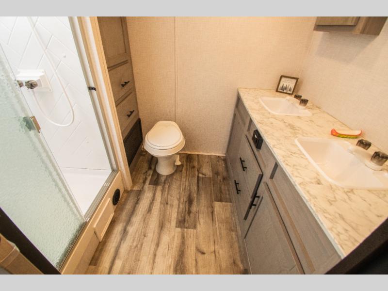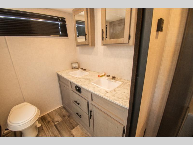Have fun seeing the country with this Coleman Light travel trailer! You can hunker down back in the woods, or you can head out to a popular campsite to visit with friends. Whatever you choose to do, this trailer will make it fun. It has a hinged entertainment center with a hidden pantry behind it. There is also a fireplace below the entertainment center, and when you are sitting on the reclining sofa or booth dinette, you can benefit from the heat it provides. As you spend time getting ready each morning, you'll appreciate the inclusion of a dual-sink vanity in the rear bathroom. This makes it so much easier to get ready at the same time as your spouse. You'll also have easy access into this trailer because of the two entry doors that have been installed.