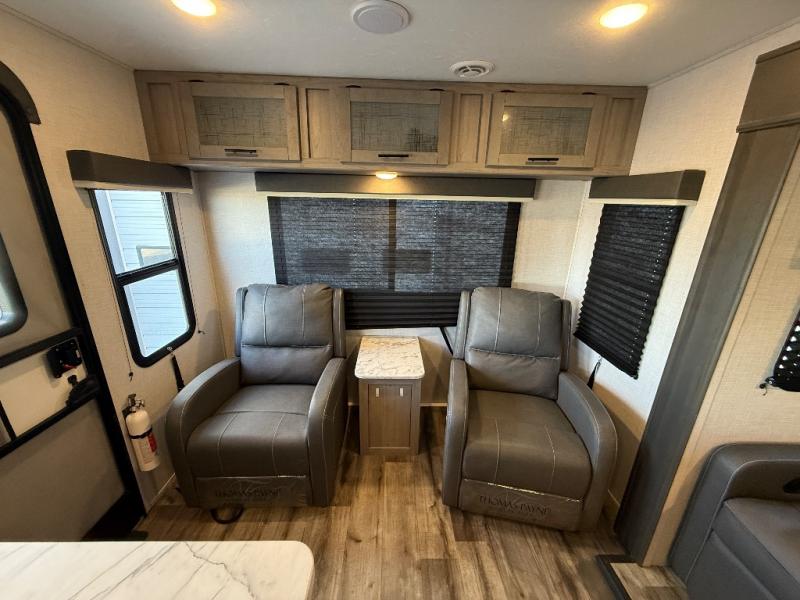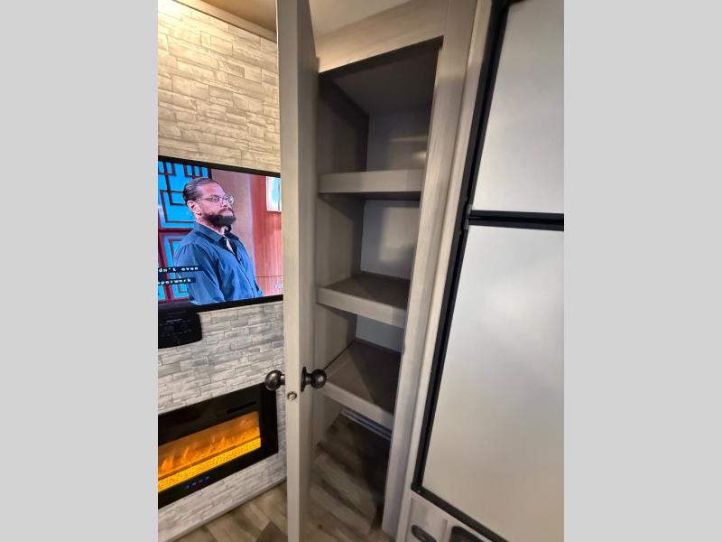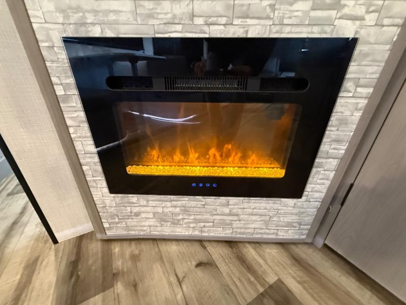 You'll feel right at home in this Coleman Light travel trailer! There are many residential comforts included on this trailer, like the residential queen bed up in the private bedroom, the two swivel rockers with end table in between, the reclining sofa, the two entry doors for great accessibility, and the fireplace for a cozy effect. The walk-through bath is a useful feature because it provides entry doors on either side which means that you can access the bathroom from the bedroom or main living area. You'll also be able to keep some extra equipment stored away in the exterior pass-through storage.