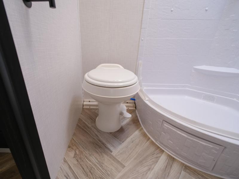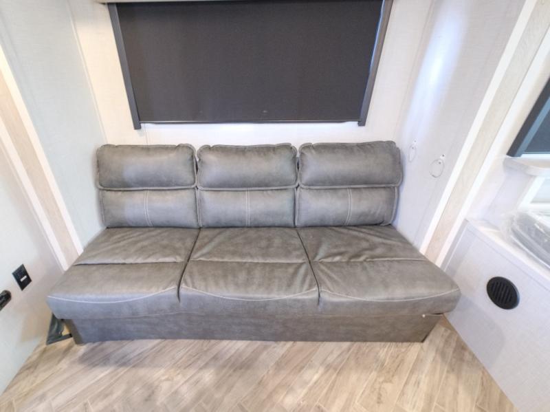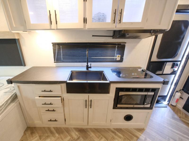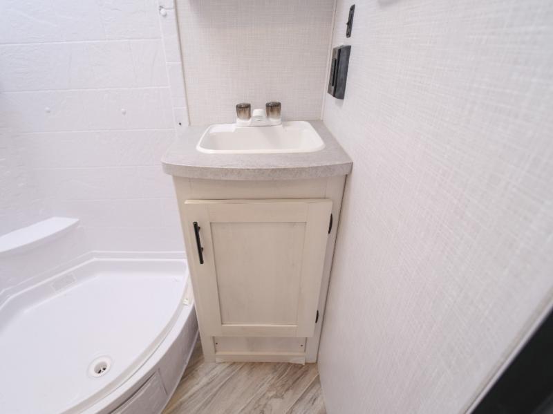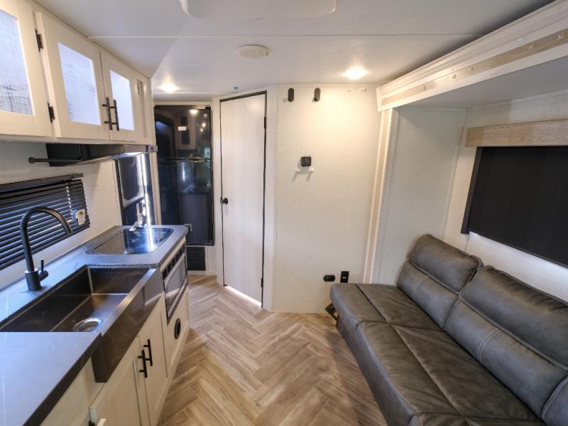 This travel trailer is perfect for two people looking to escape the hustle and bustle of everyday life! The front queen bed welcomes you to enjoy a good night's rest each night so you can feel refreshed every morning. After you have fried up some eggs with the two burner range, you can head to the sofa slide and enjoy it there with the indoor/outdoor table or take the table outside to have breakfast outdoors under the 12' power awning. The rear corner bathroom has a radius shower with a skylight above for natural lighting as you get ready each morning!