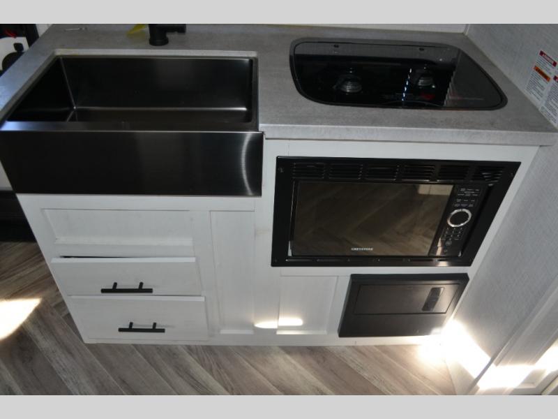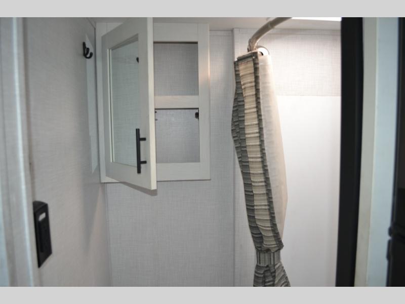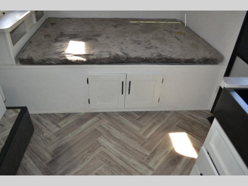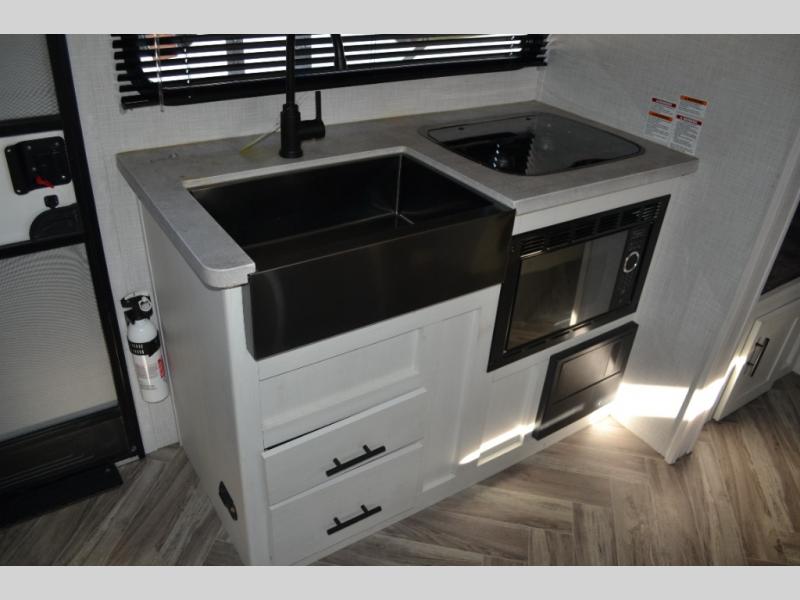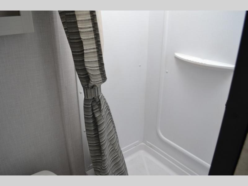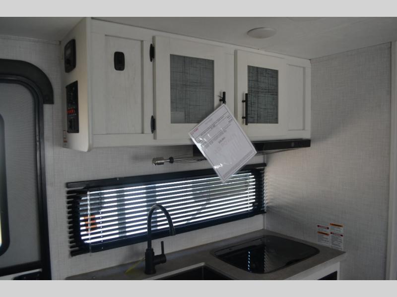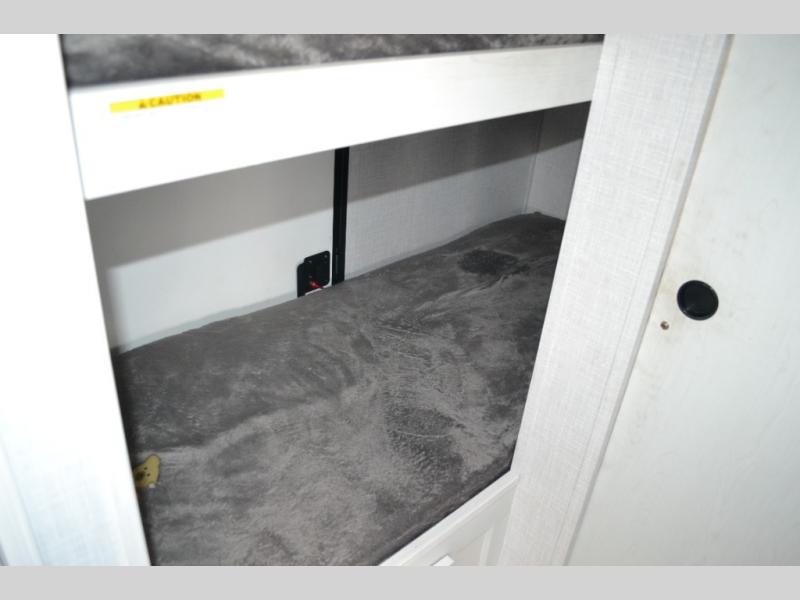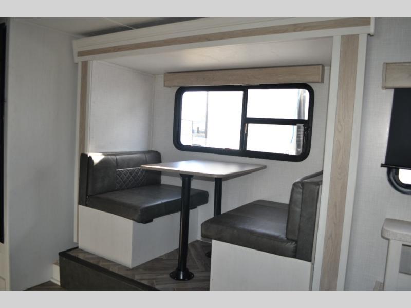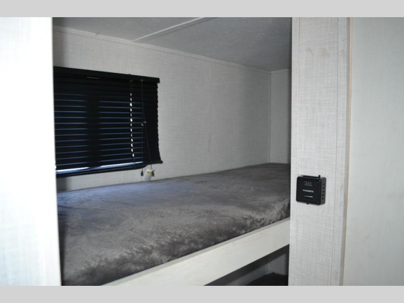 With a set of bunk beds, the whole family or friend gang can camp together in this travel trailer! And you will appreciate having a front queen bed to lay your head on at night. The two burner range is just waiting for you to prepare a delicious meal and the booth dinette is a great place to enjoy it at, plus it can be used as an extra sleeping space. The rear corner bathroom has a shower with a skylight above for added natural lighting as you get ready each morning!