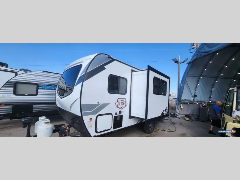Each one of these Dutchmen RV Coleman Rubicon travel trailers come with more standard features for a valuable trip! They are constructed with strong frames and sturdy walls with insulation while staying at a light enough weight to be towed by most vehicles. Underneath the linoleum flooring is a layer of HyperDeck flooring, an aluminum frame with block foam insulation, another layer of HyperDeck flooring, a powder coated steel I-beam frame, and a fully enclosed underbelly to protect your units vitals. The soul of the RV consists of an upgraded kitchen package with a black stainless steel farm style sink, solid entry steps that are easy to expand and store away, and a fiberglass cap with windshield that creates a sleek automotive design and adds natural lighting throughout the inside. Come find the right model for you today!