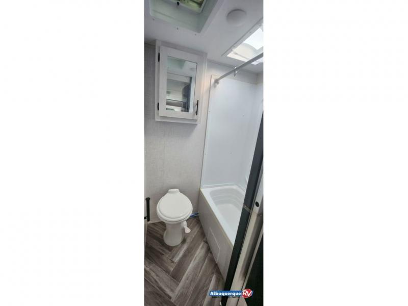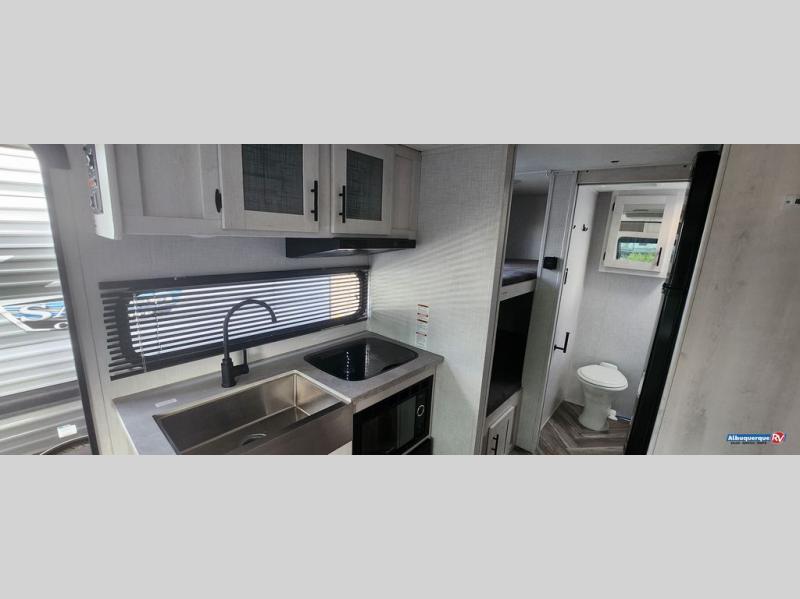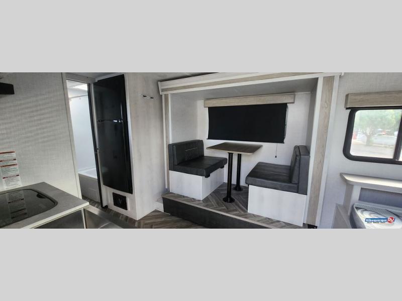 With a set of bunk beds, the whole family or friend gang can camp together in this travel trailer! And you will appreciate having a front queen bed to lay your head on at night. The two burner range is just waiting for you to prepare a delicious meal and the booth dinette is a great place to enjoy it at, plus it can be used as an extra sleeping space. The rear corner bathroom has a shower with a skylight above for added natural lighting as you get ready each morning!