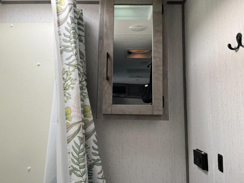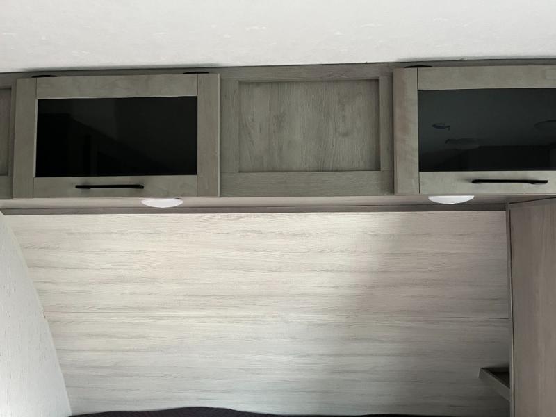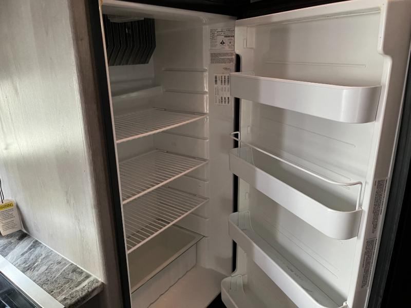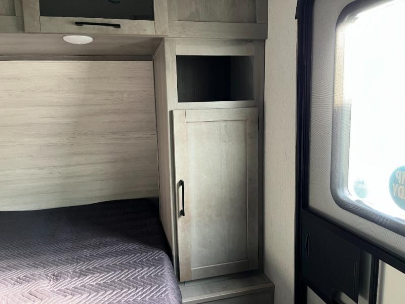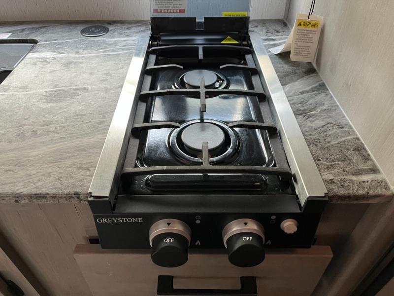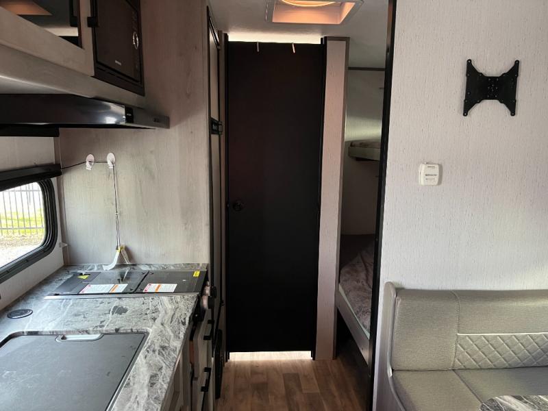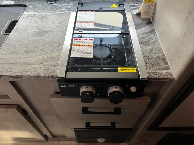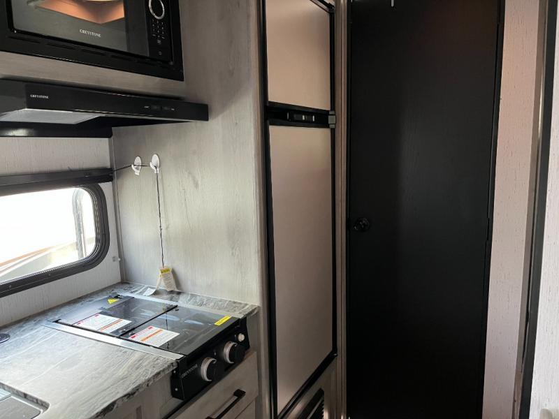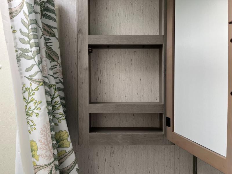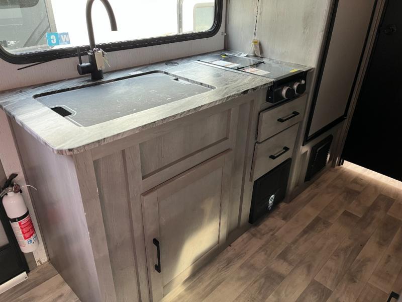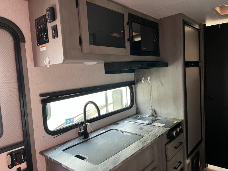 The kitchen area is designed for real campground cooking without crowding your living space. Equipped with a cooktop, microwave, refrigerator, and strategically placed countertop and cabinet storage, this kitchen helps you prepare everything from quick snack prep to hearty dinners on the road. The easy-access layout keeps everything within reach and organized for stress-free meal prep.