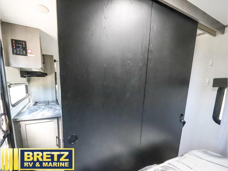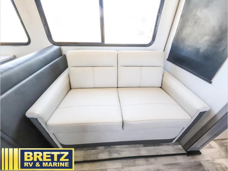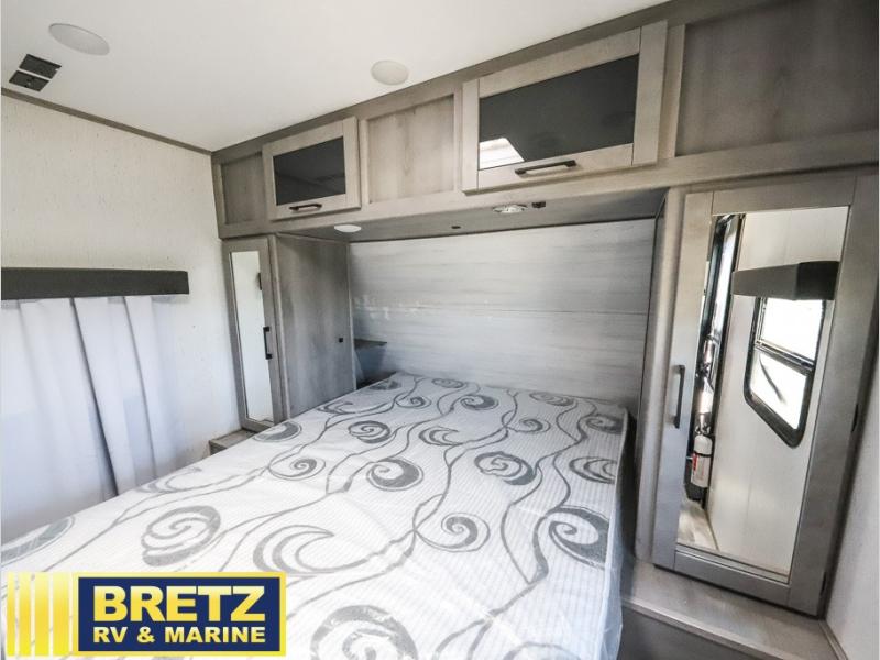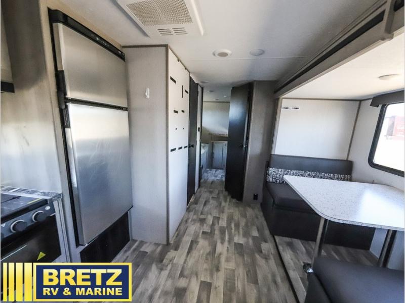 If you've been looking for a lightweight travel trailer with a large sleeping capacity, your search is over! This model can sleep nine comfortably between the queen bed, the furniture within the large slide out, and the private bunkhouse. Your group will love to visit under the 18' power awning with LED lights, especially while dinner is being made on the outside kitchen. If the weather isn't cooperating, just head indoors for game night around the U-shaped dinette!