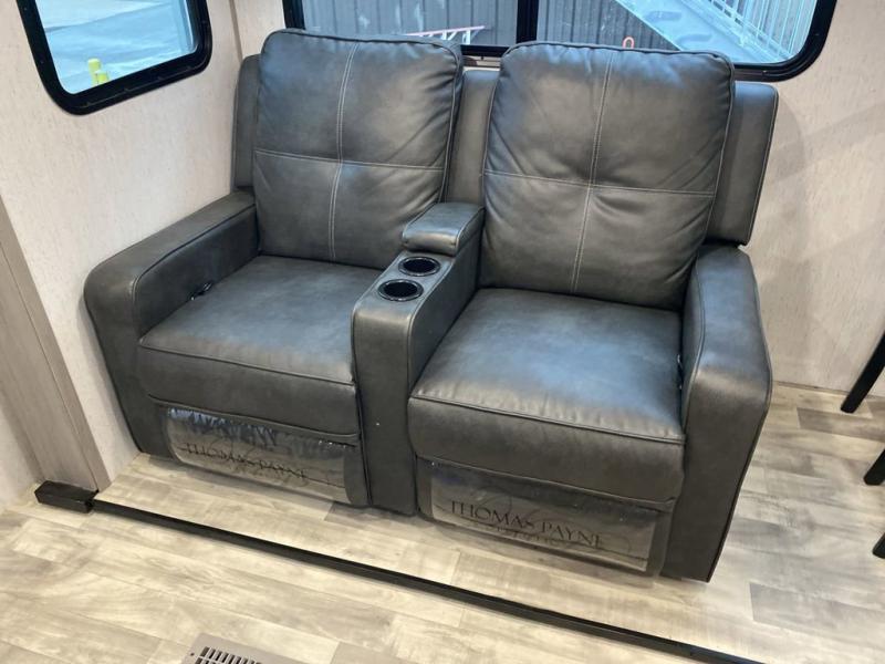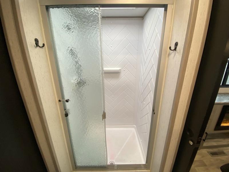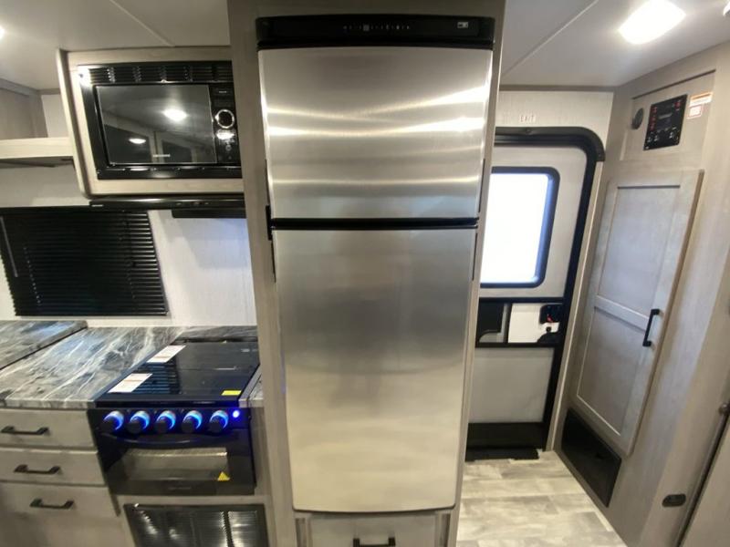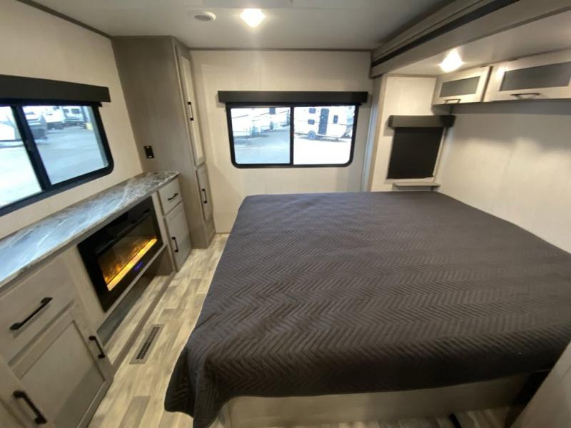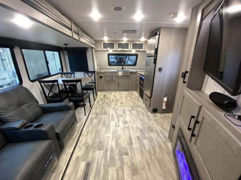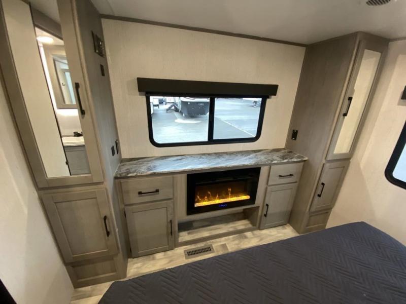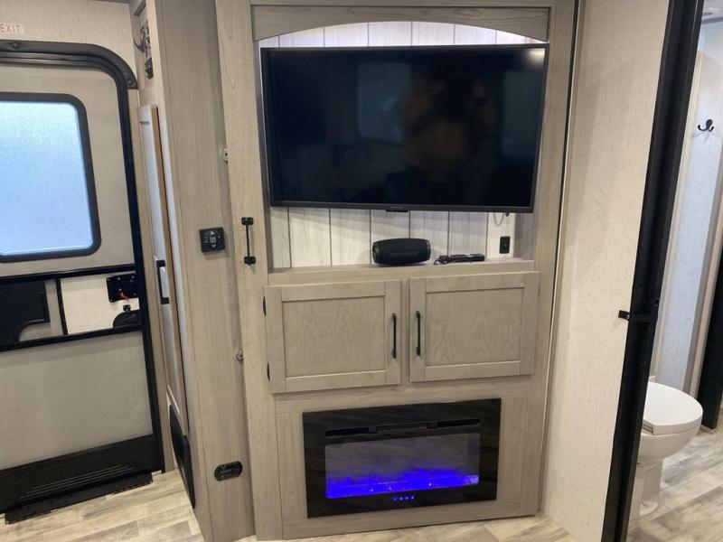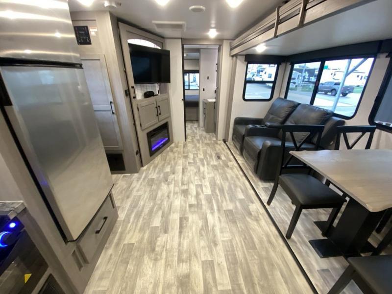 You will love every minute spent in this spacious travel trailer that includes dual slide outs! The walk through bath will create a rear master bedroom you are sure to love. You can sleep soundly on the king bed and relax in front of the bedroom fireplace. The chef of your group will have ample counter space in the kitchen to prep meals, plus there is a 10 cu. ft. refrigerator to store perishables. After dinner, get comfortable on the theater seats or play a game at the booth dinette. Or you may just want to relax outdoors under the 20' power awning with LED lights!